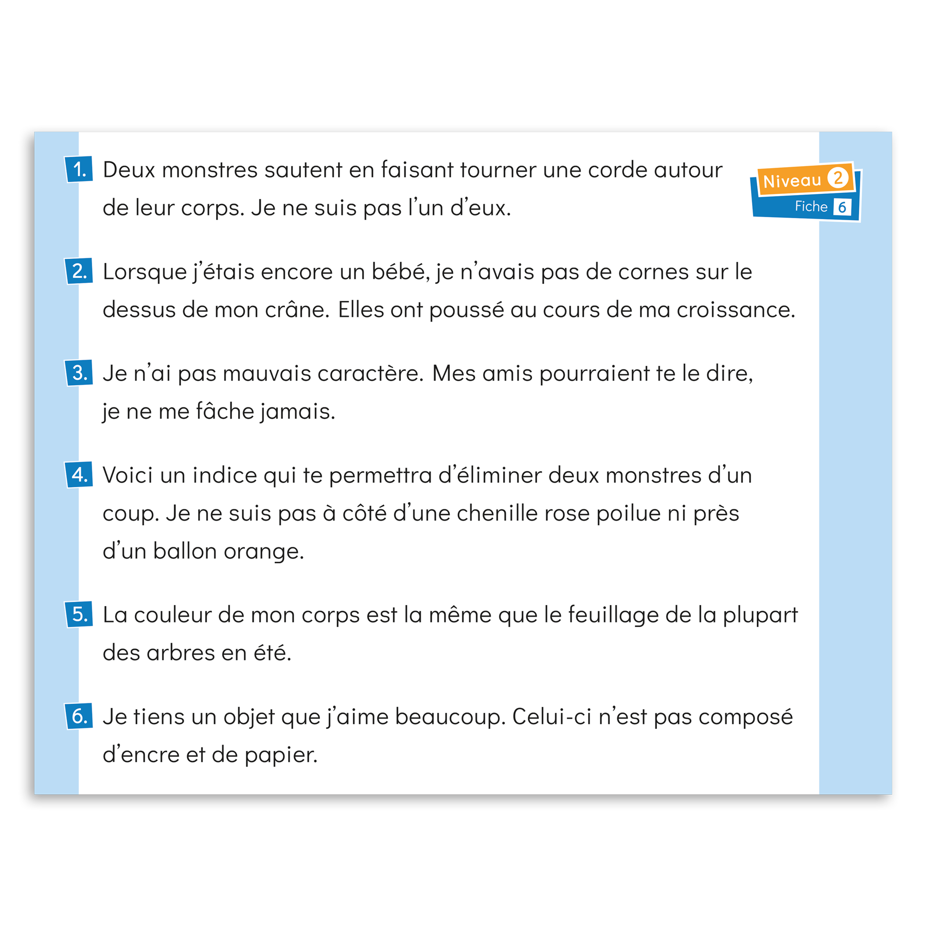 • Développer la compréhension en lecture, le raisonnement logique et la capacité à inférer des éléments d'information implicites à partir de divers indices.
