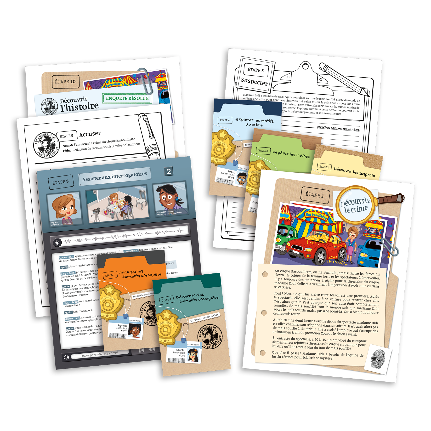 Justin Férence – Le crime du cirque Barbouillette est un jeu d’enquête destiné aux élèves de 3e année du primaire ciblant l’habileté à faire des inférences et à dégager l’information importante dans un texte. L’enquête est composée de 10 étapes et peut être réalisée en groupe-classe ou en atelier sur plusieurs périodes de classe.