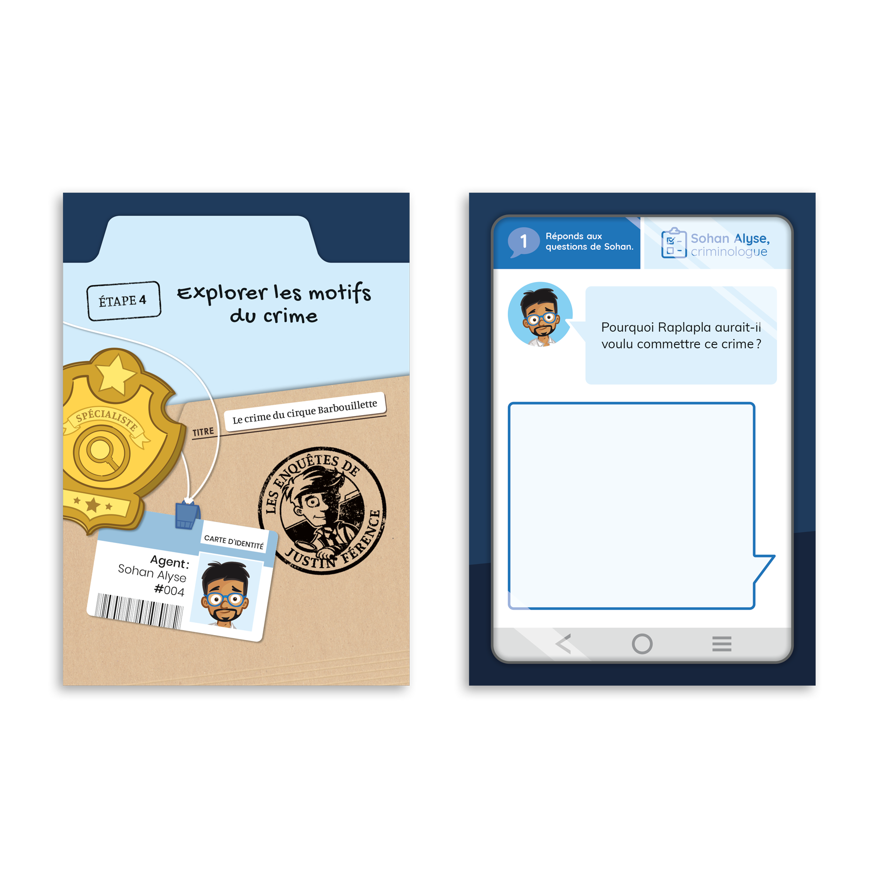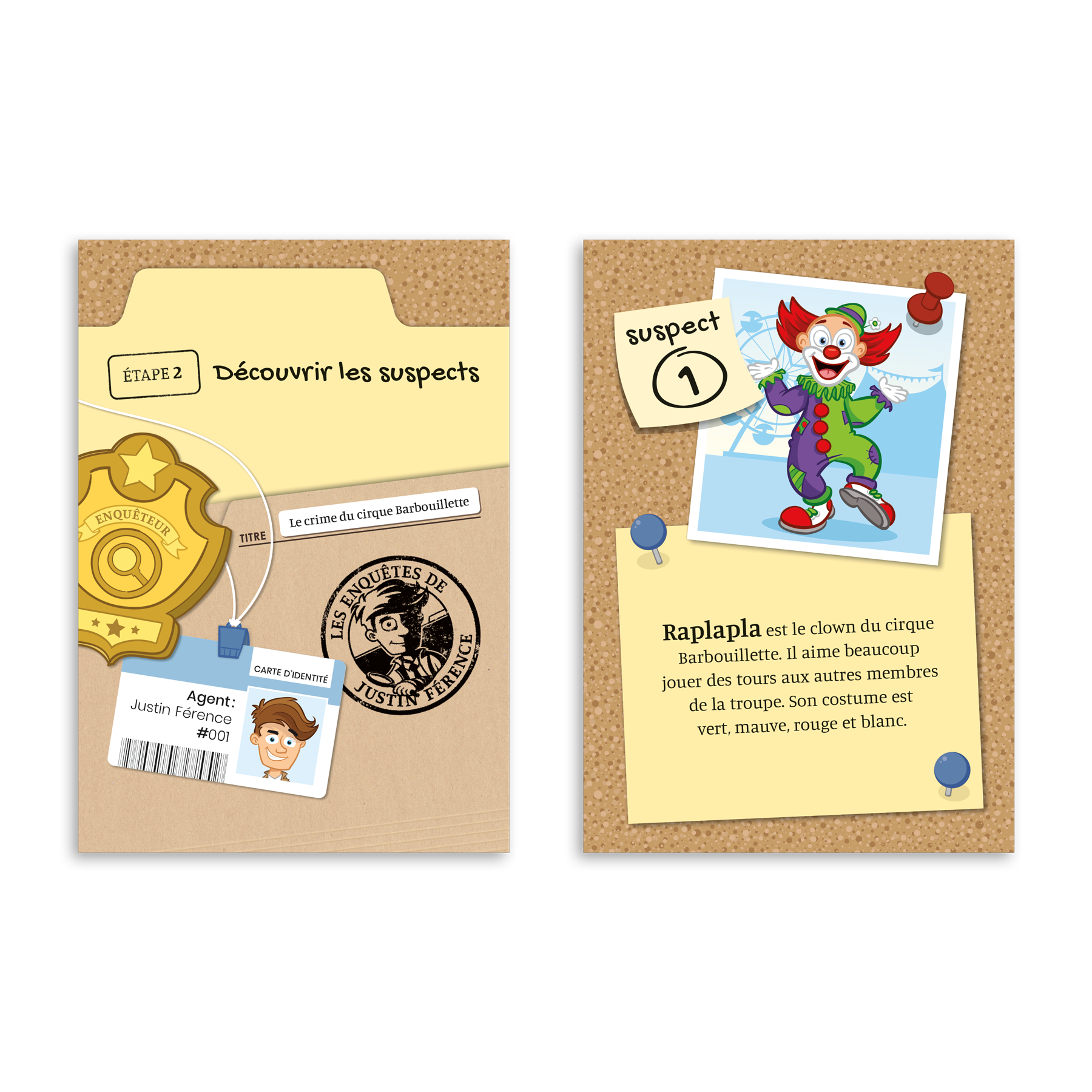 En plus du matériel nécessaire à la réalisation des différentes étapes de l’enquête, des enveloppes ainsi qu’une chemise en carton sont fournies dans la boite afin que l’intervenant puisse « mettre en scène » le cas à résoudre dans une ambiance ludique.