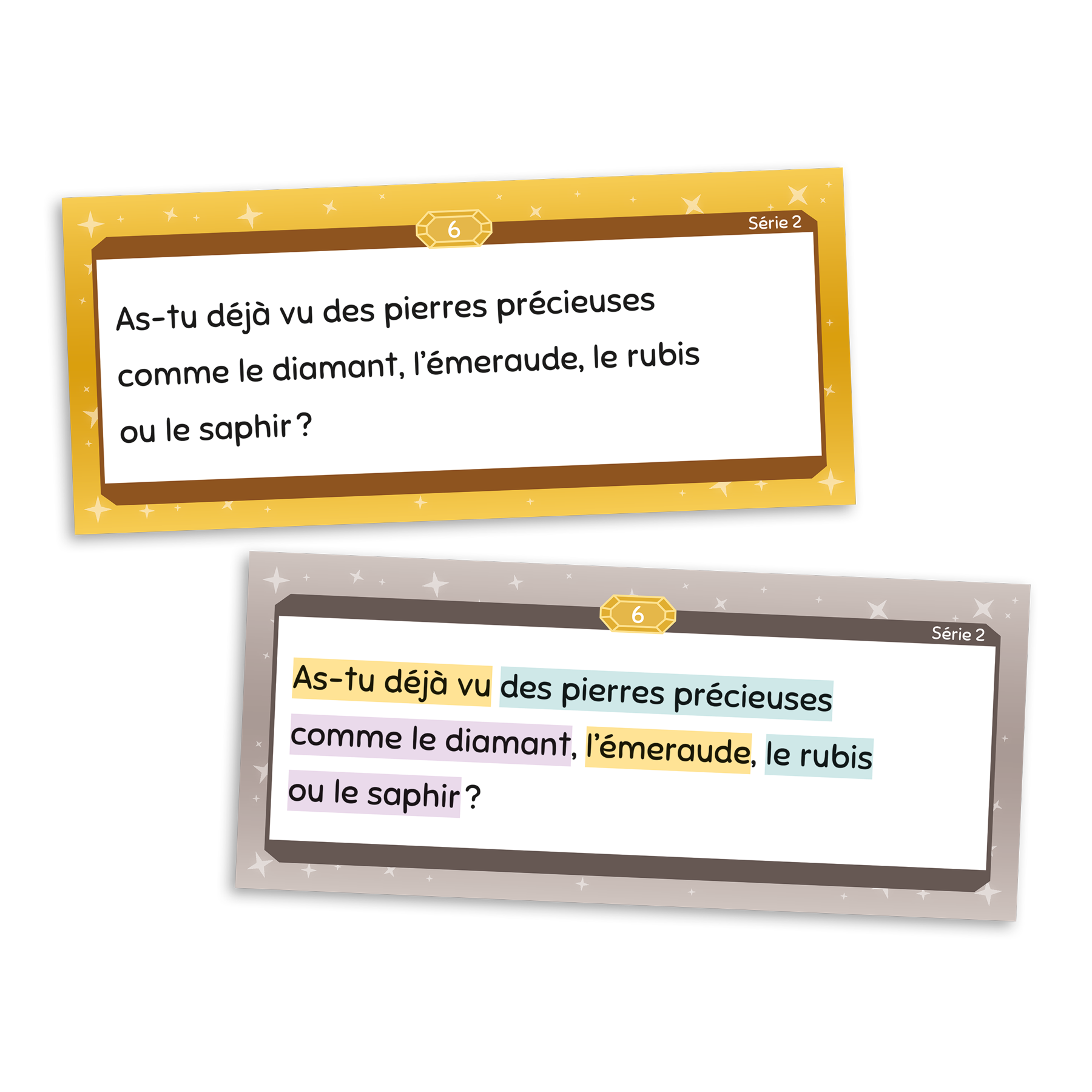 Le jeu comprend neuf séries de cartes graduées: trois séries de cartes-phrases et six séries de cartes-textes (narratifs et descriptifs), afin que l’intervenant puisse choisir les cartes selon le niveau de difficulté qu’il juge adéquat pour les joueurs et le type de texte qu’il souhaite utiliser.
