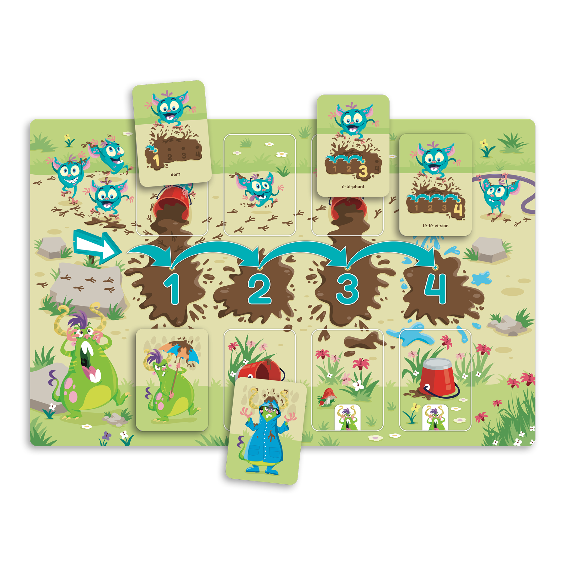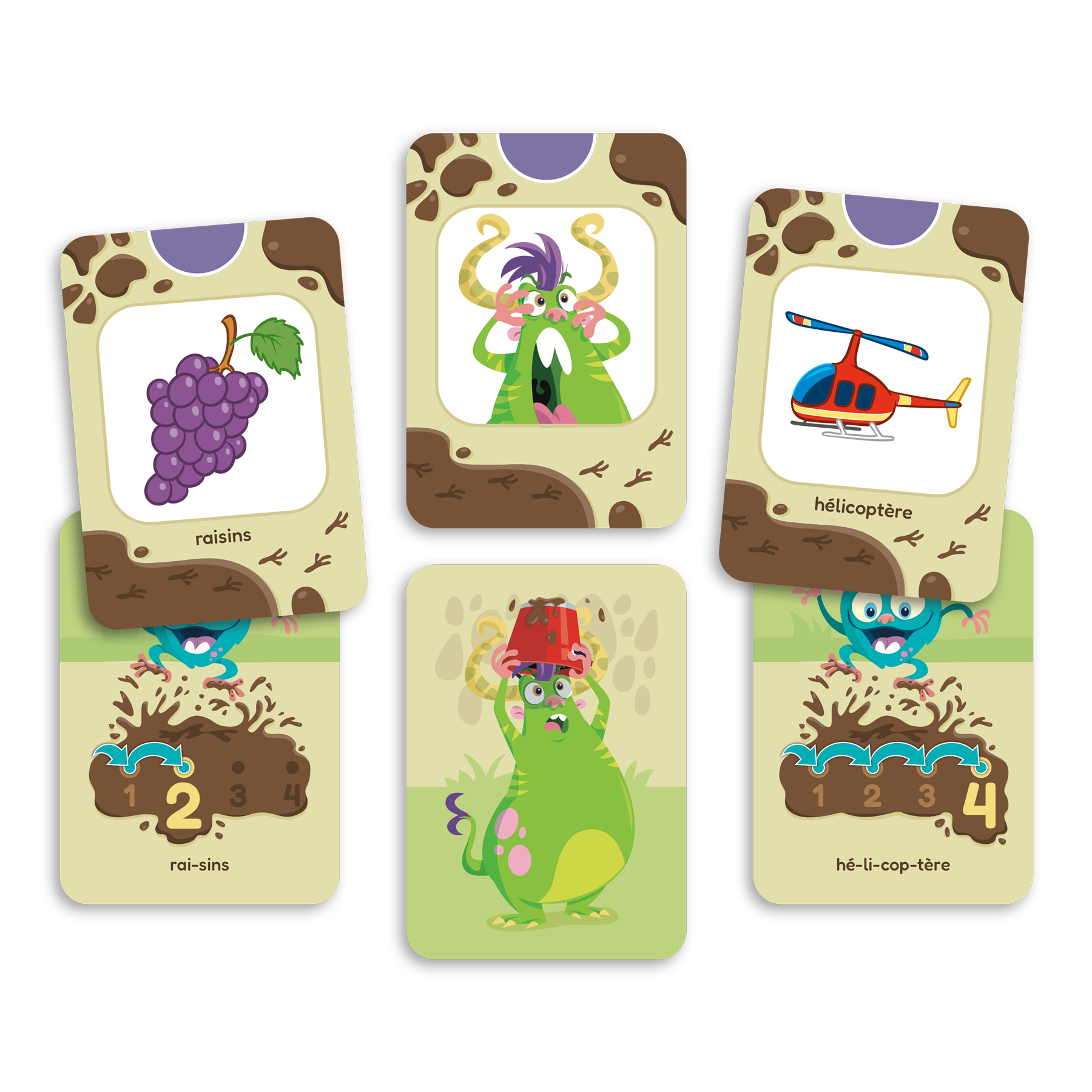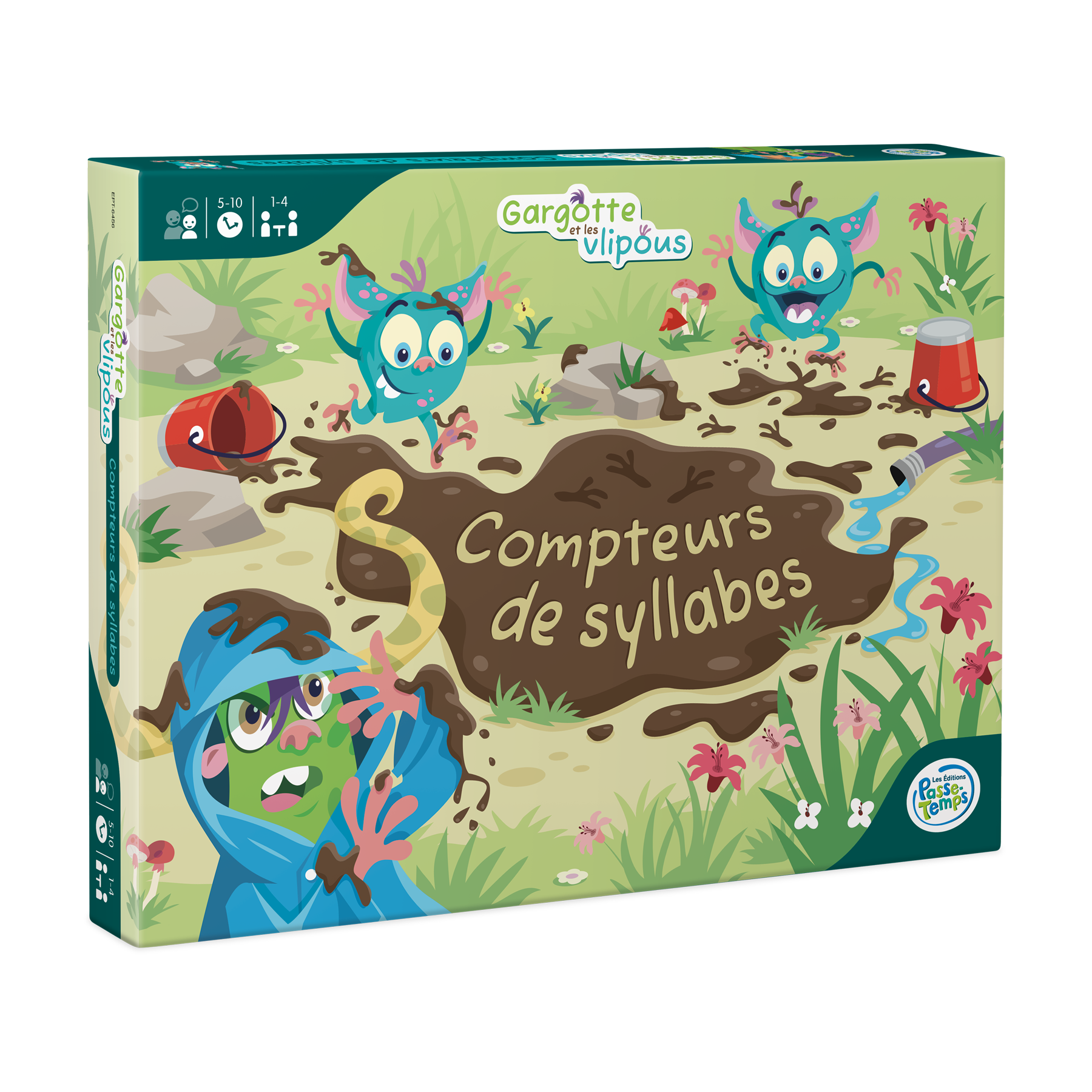 Compteurs de syllabes est un jeu individuel destiné aux élèves du préscolaire ciblant le dénombrement de syllabes orales dans des mots. Chaque joueur compte les syllabes orales dans des mots illustrés sur des cartes afin de placer celles-ci aux bons endroits sur sa planche de jeu. Pour compter les syllabes, le joueur prend un pion-vlipou, une petite créature qui aime faire des mauvais coups, et lui fait faire des bonds en sautant dans une flaque de boue pour salir Gargotte le monstre! Le joueur se corrige lui-même en retournant la carte qui dévoile le nombre de syllabes du mot (de 1 à 4 syllabes).