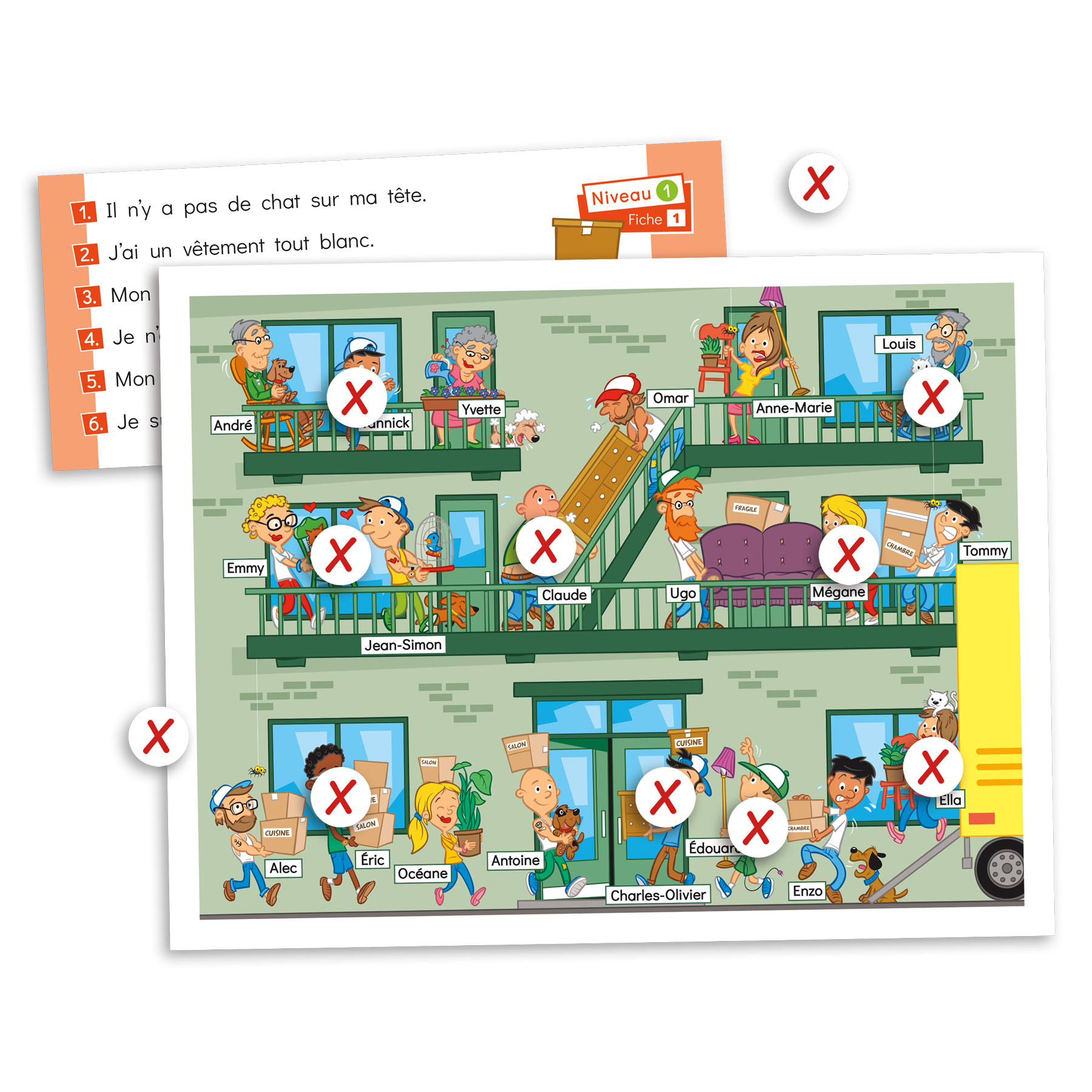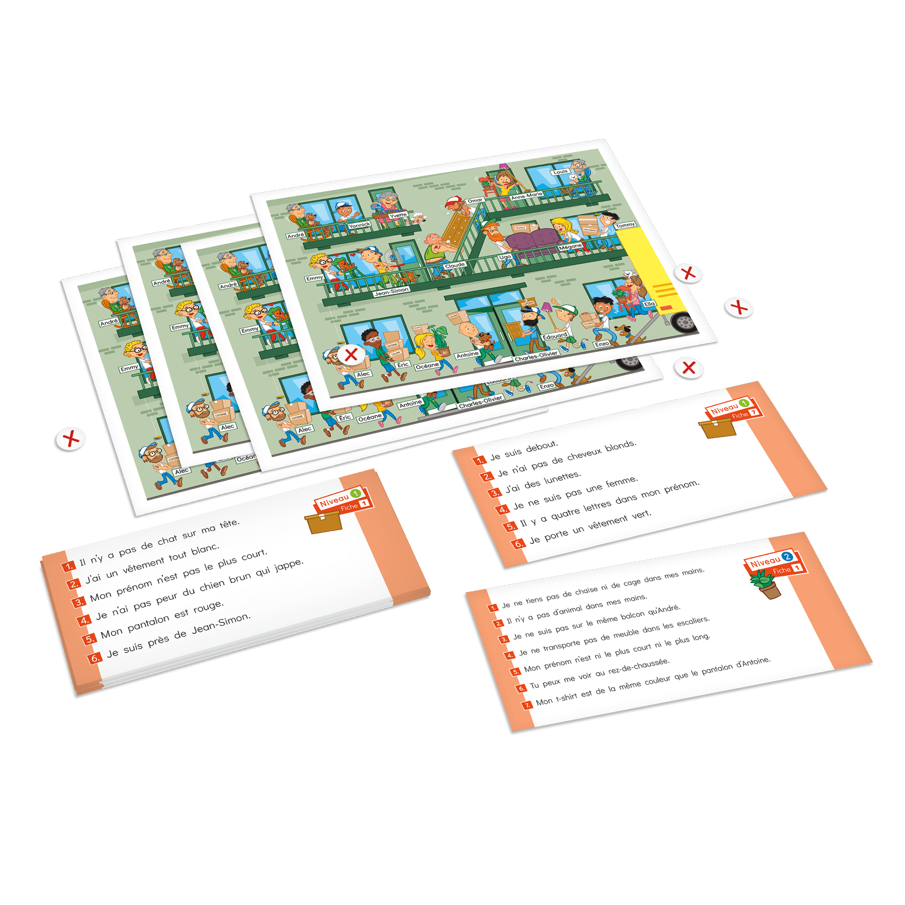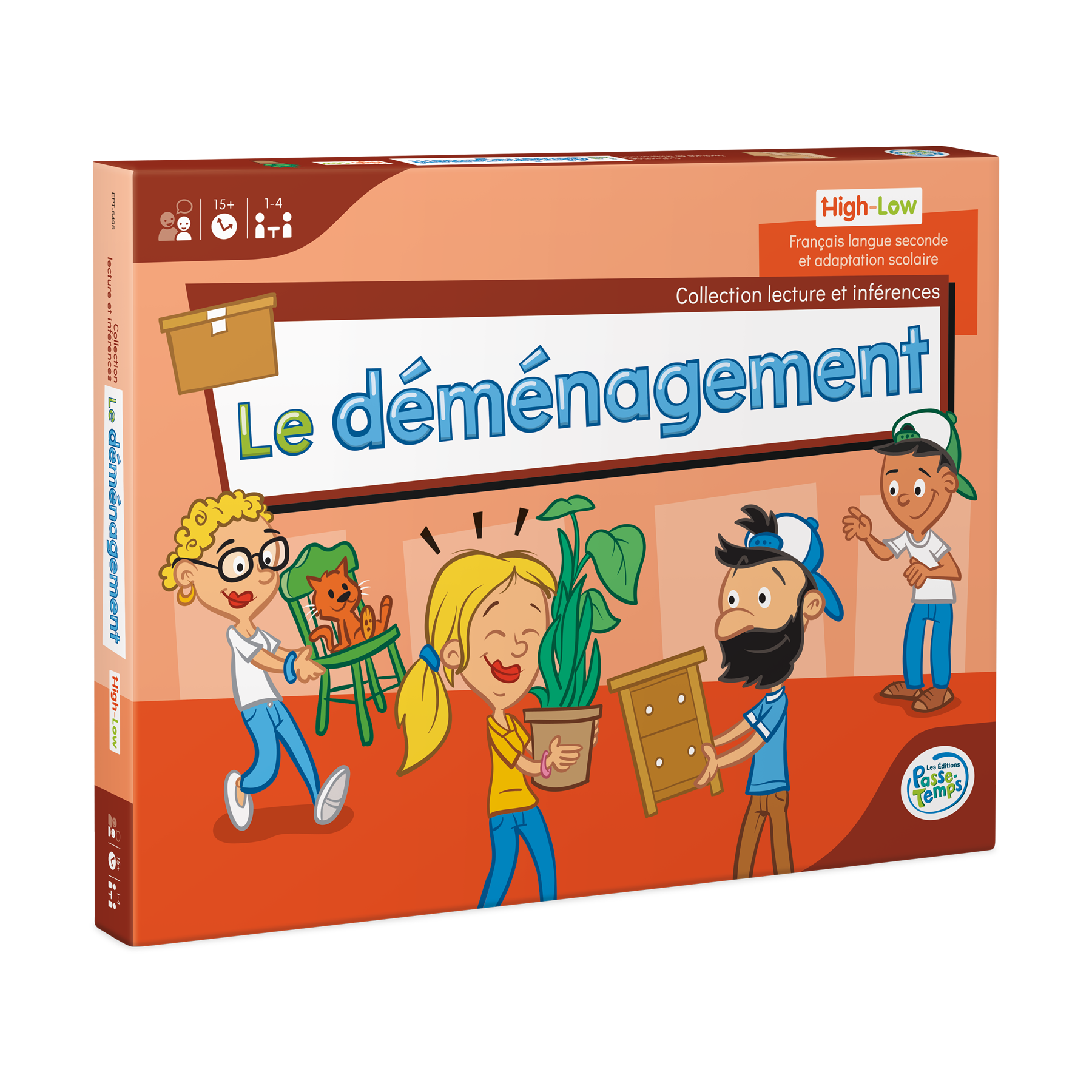 Version adaptée « high-low » du jeu Le déménagement pour les apprenants du français langue seconde ou les élèves de la 4e à la 6e année du primaire présentant des difficultés en lecture. Le jeu propose des indices simplifiés permettant de travailler les habiletés de décodage, l’enrichissement du vocabulaire et les habiletés de compréhension en lecture tout en stimulant l’intérêt des apprenants. Chaque joueur doit identifier des personnages à partir des descriptions fournies.