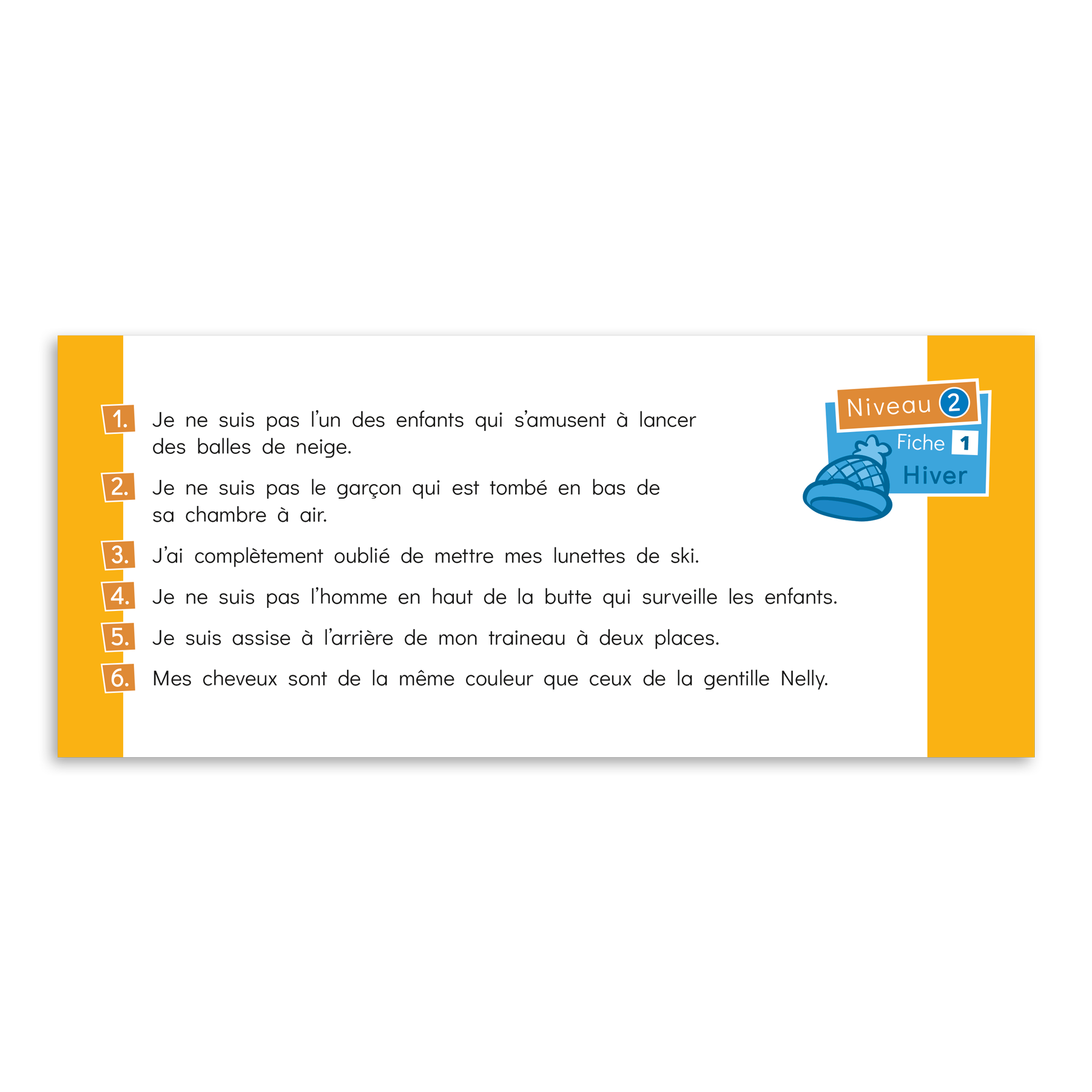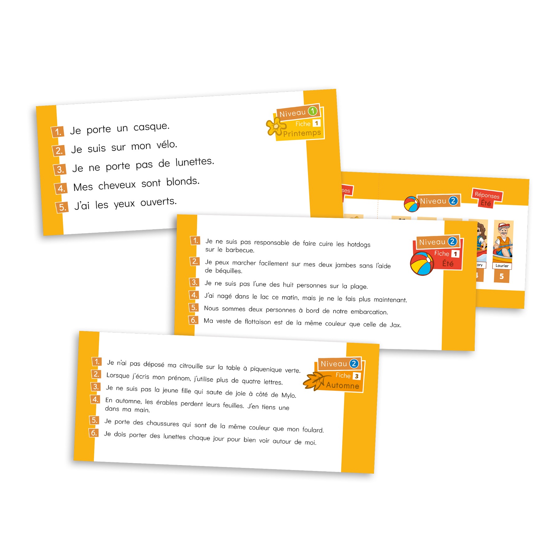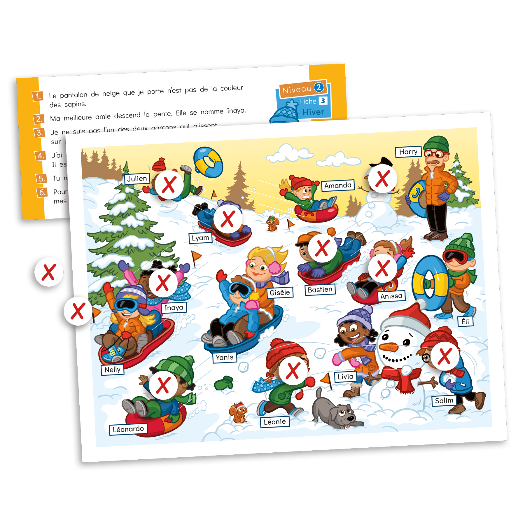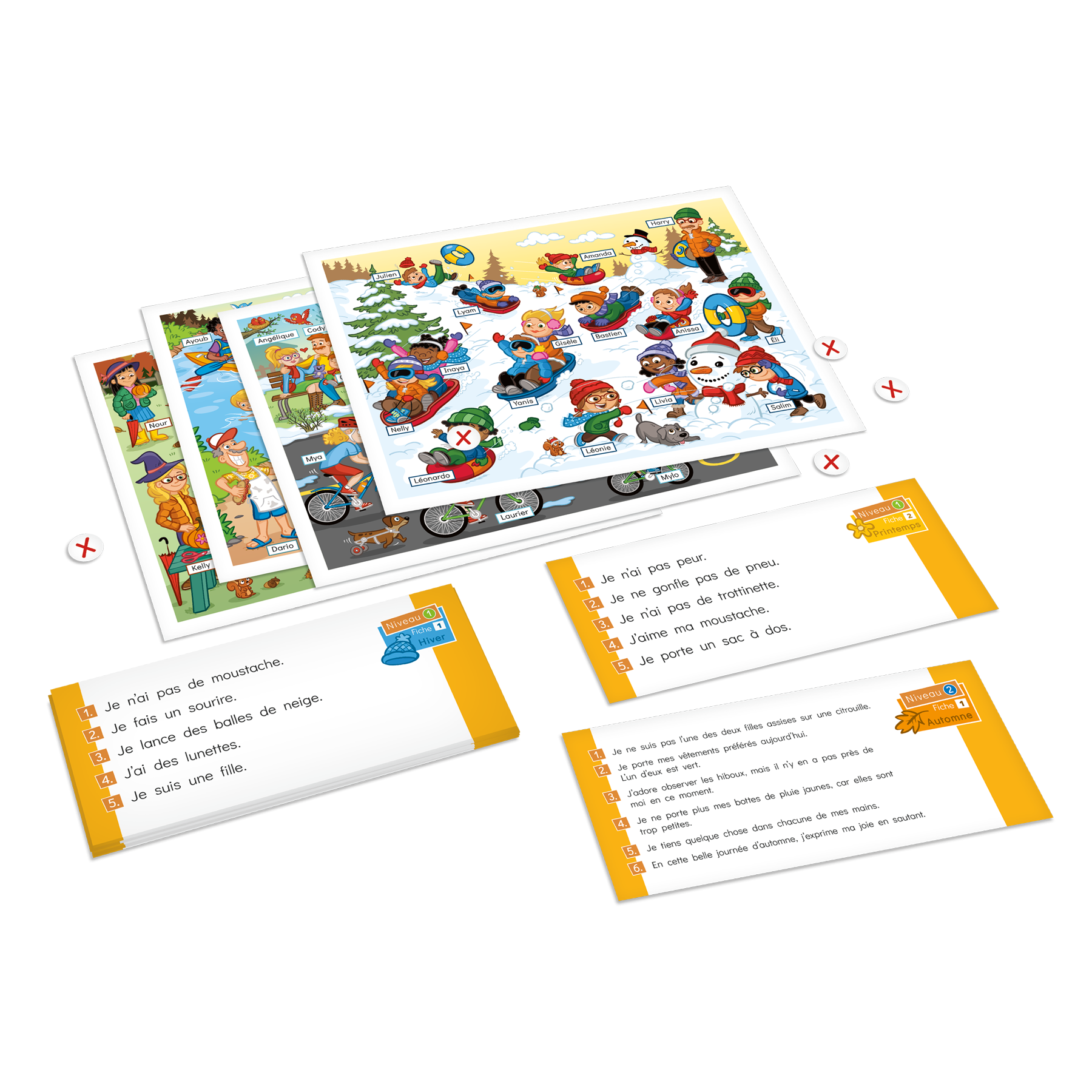 Les saisons – Mégathème (1er cycle) est un jeu de lecture et d’inférences gradué dans lequel le joueur doit identifier des personnages à partir des descriptions fournies. Le jeu comprend 4 planches de jeu distinctes (en 4 exemplaires chacune), représentant chacune une saison, et 40 fiches de lecture réparties en 2 niveaux de difficulté. Ainsi, l’intervenant peut utiliser le jeu tout au long de l’année scolaire, au gré des saisons, et choisir le degré de difficulté qu’il juge adéquat pour les joueurs.