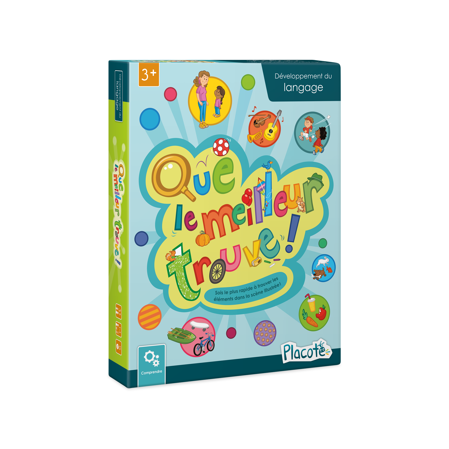 Pour soutenir l'enfant dans son développement cognitif et langagier, il est pertinent de l'exposer à des consignes de formes et de longueurs variées ainsi qu'à différentes catégories d'éléments. C'est ce que propose le jeu Que le meilleur trouve!, dans lequel les enfants doivent comprendre des consignes faisant intervenir différentes catégories (moyens de transport, instruments de musique, personnes, objets, etc.) puis tenter d'être le joueur le plus rapide à repérer des éléments dans une scène illustrée.