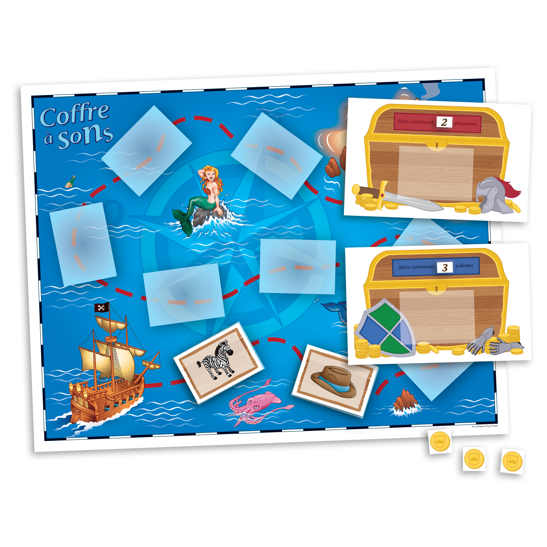 L’ensemble complet comprend les quatre coffres à sons. Chaque coffre contient des cartes pour pratiquer la production des phonèmes en position initiale, médiane et finale. Plusieurs jeux peuvent être réalisés avec ces cartes: chasse aux trésors, jeu des devinettes, abracadabra, jeu de parcours et le jeu Le mot dans la phrase. L’ensemble complet inclut également les activités complémentaires (EPT-191D).