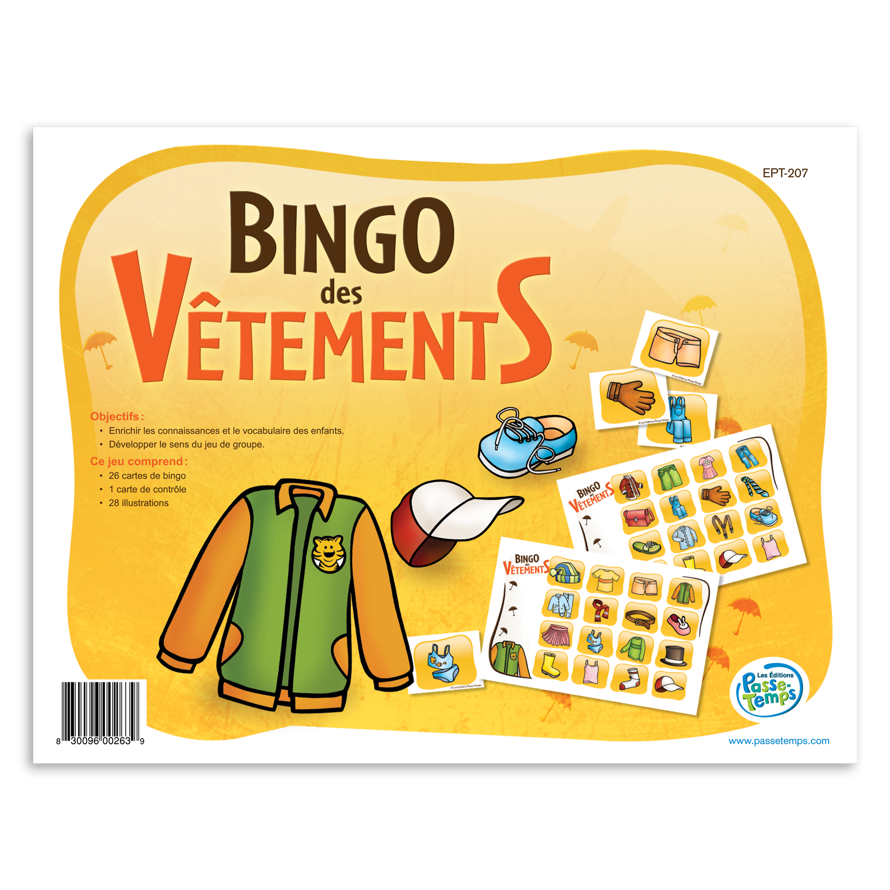 Jeu de bingo éducatif pour un groupe de 26 enfants. Ce bingo comporte 28 images différentes sur le thème des vêtements.