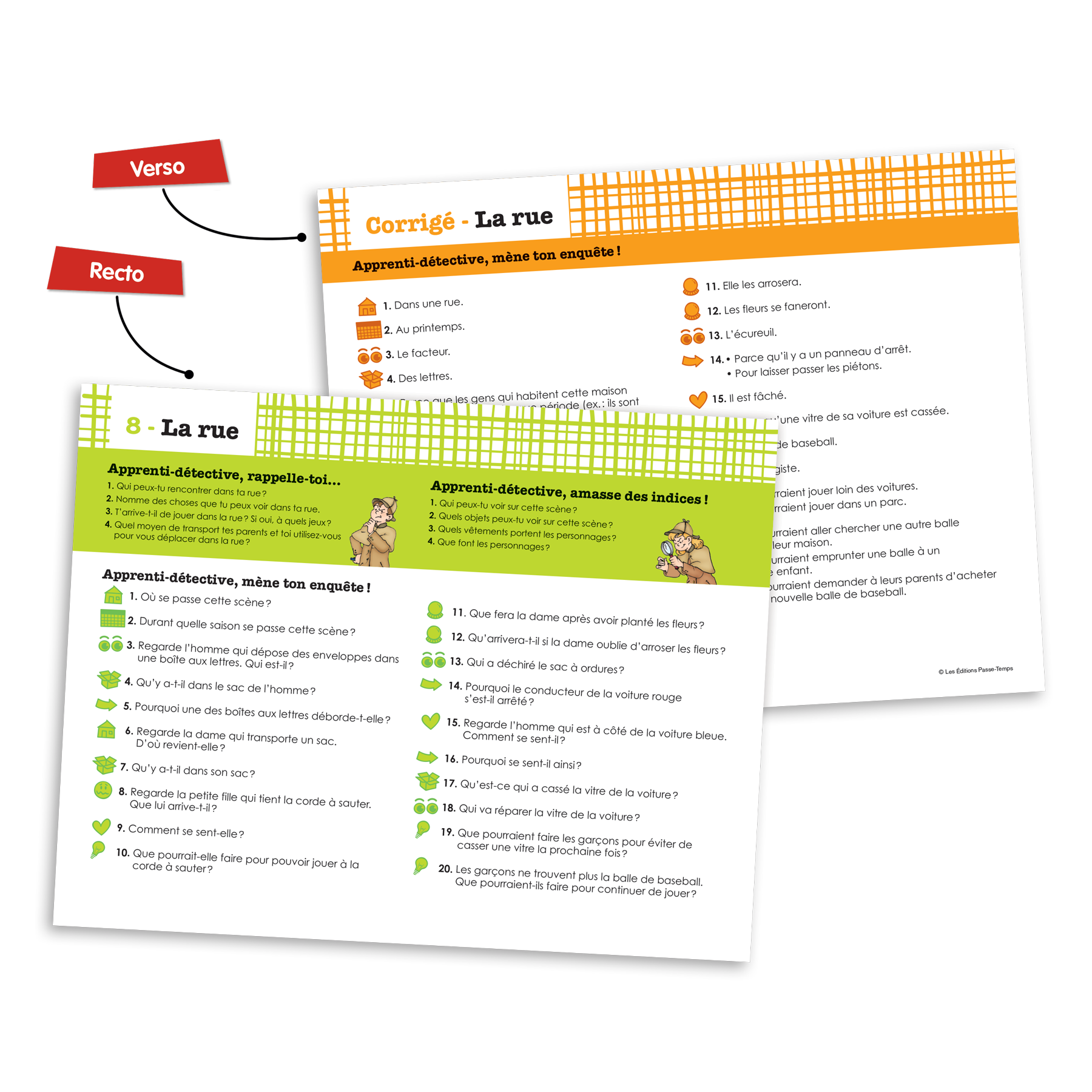 Pour chaque image, une fiche avec trois sections est prévue. D’abord, dans la section « Apprenti-détective, rappelle-toi », l’élève doit discuter de ce qu’il connait déjà sur le sujet. Il doit donc rapporter des expériences personnelles et des connaissances antérieures pour les mettre en lien avec les éléments de la scène imagée. Dans la deuxième section « Apprenti-détective, amasse des indices! » l’élève est amené à repérer des indices visuels qui lui permettront de faire des inférences. Deux façons de noter les réponses sont proposées. L’élève peut répondre sur la fiche d’observation prévue à cet effet ou vous pouvez placer les pictogrammes (choses, actions, lieux, personnages et moment) sur un tableau où les réponses pourront être inscrites. Enfin, dans la section « Apprenti-détective, mène ton enquête! » l’élève doit répondre à 20 questions visant l’habileté à faire des inférences. Ce jeu travaille différents types d’inférences tels que celles de lieu, temps, personnage, objet, action, émotion, cause, problème solution, prédiction. Vous avez donc la possibilité de travailler des inférences variées ou d’en sélectionner certaines spécifiquement. L’intervenant peut lire les questions et demander à l’élève d’y répondre oralement ou demander à l’élève de lire lui-même et de consigner ses réponses sur la fiche reproductible incluse. Le corrigé des inférences est au verso de la fiche.