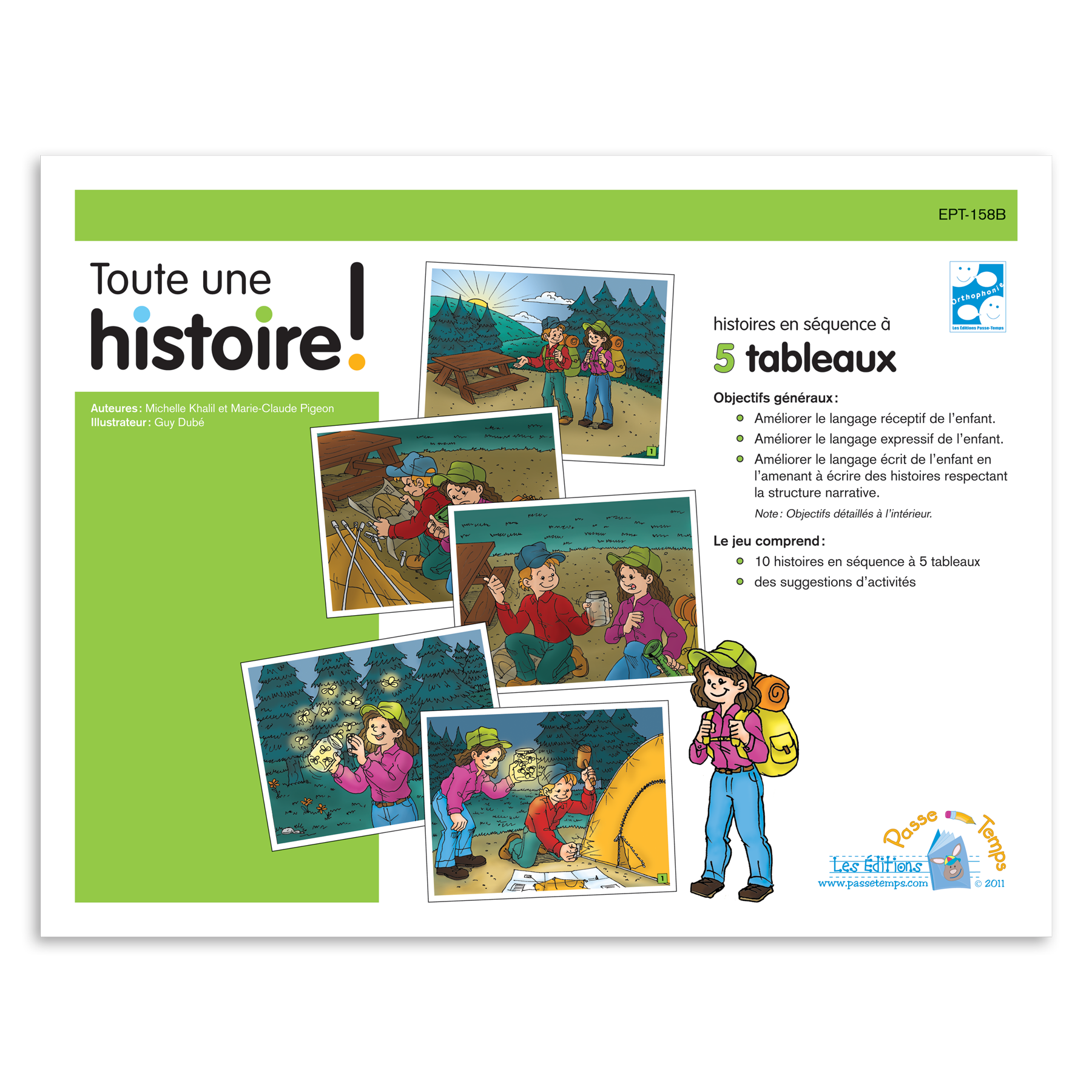 Magnifiquement illustré, cet ensemble offre 10 histoires en séquence divisées en cinq tableaux (grand format de 21,3 x 27,8 cm). Différentes activités permettent de développer le langage réceptif et expressif de l'enfant ainsi que d'améliorer son langage écrit.