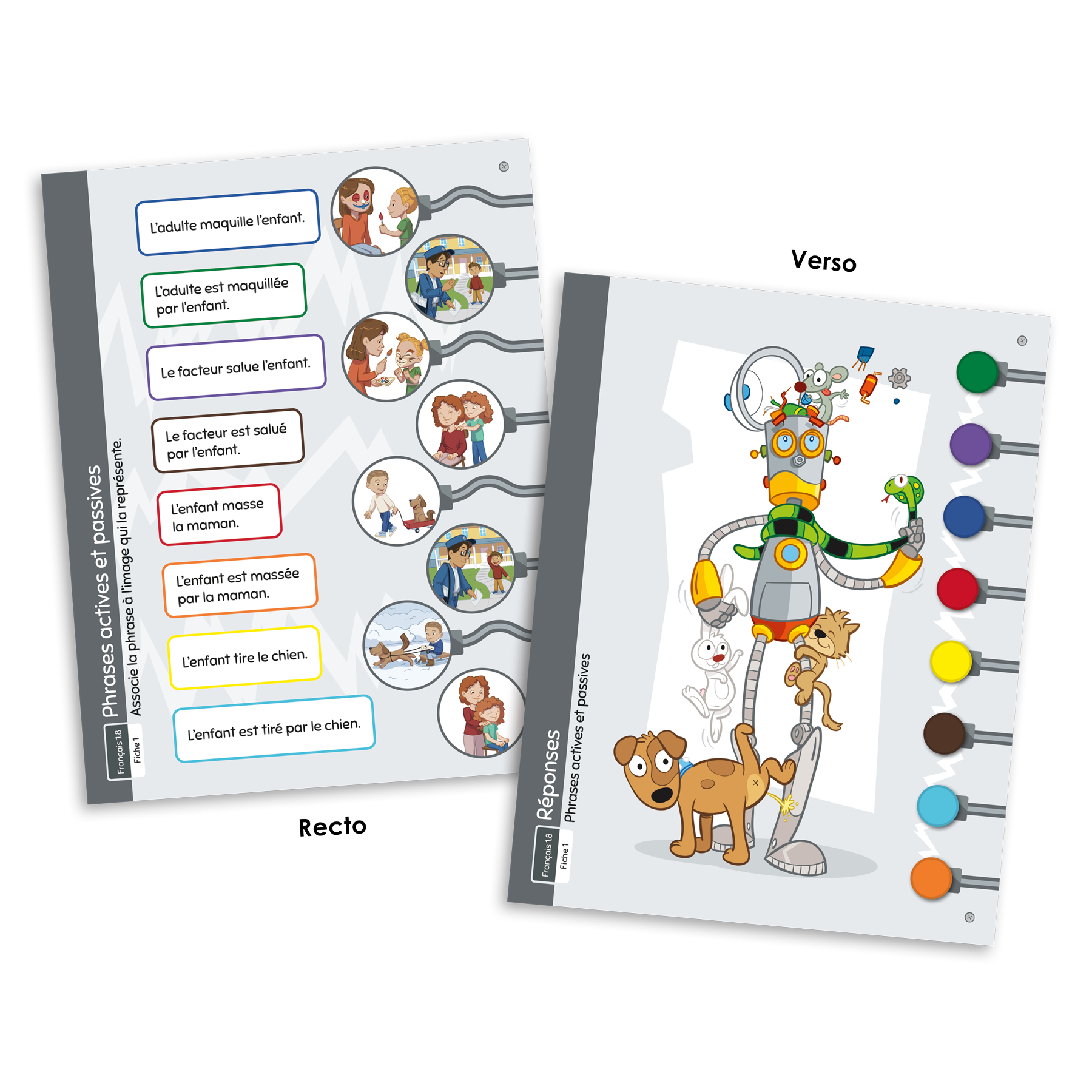 Jeu individuel d'association destiné aux élèves du 1er cycle du primaire ciblant l'habileté à lire et à comprendre des phrases de formes variées (phrases actives et passives, phrases négatives avec ne [...] pas ou ni, phrases avec une énumération). L'ensemble comprend 12 fiches de jeu dans lesquelles le joueur doit associer des phrases à des images pour assembler les fils dans la tête d'un robot et programmer ses actions.