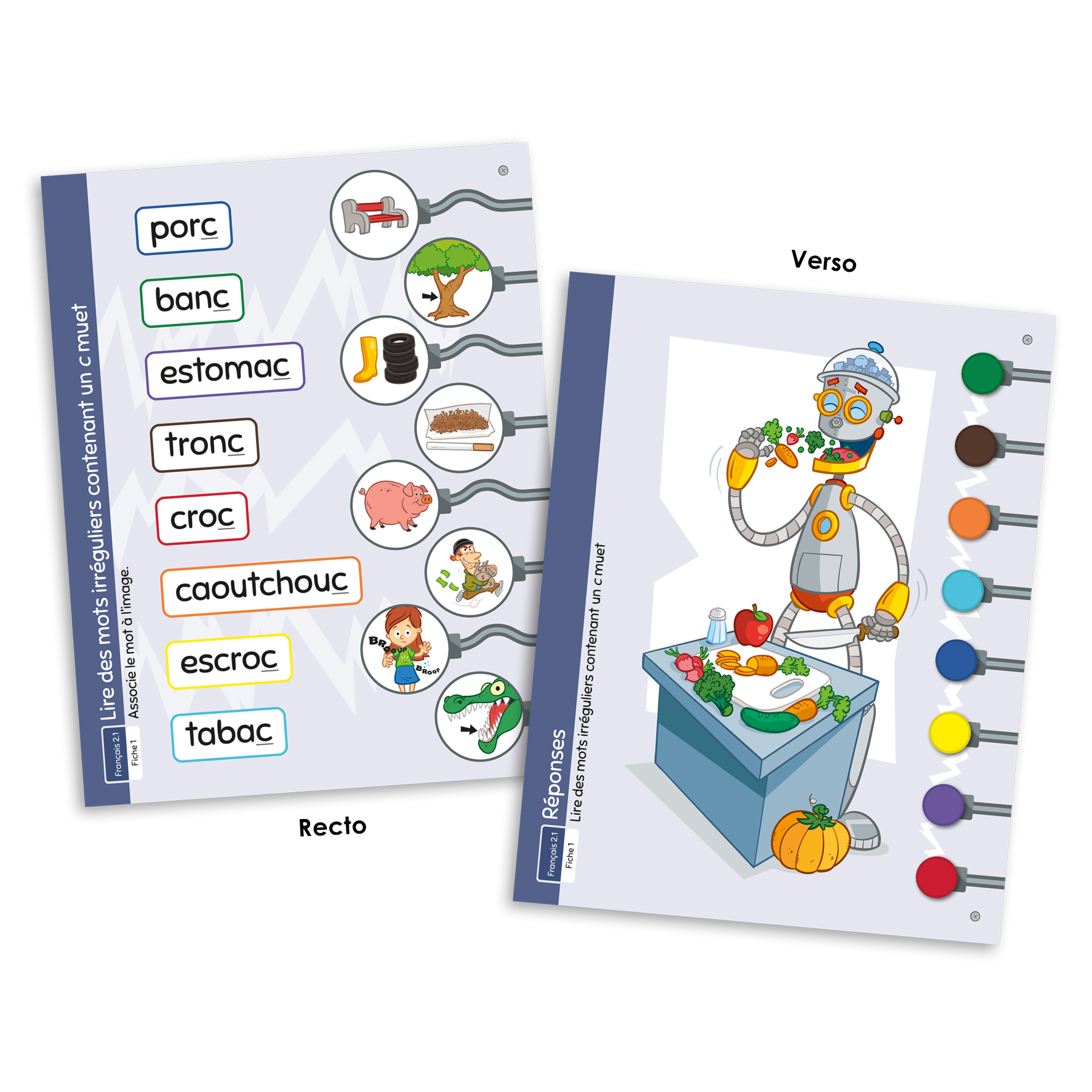 L’ensemble comprend 12 fiches de jeu qui portent sur la lecture de mots irréguliers comprenant :