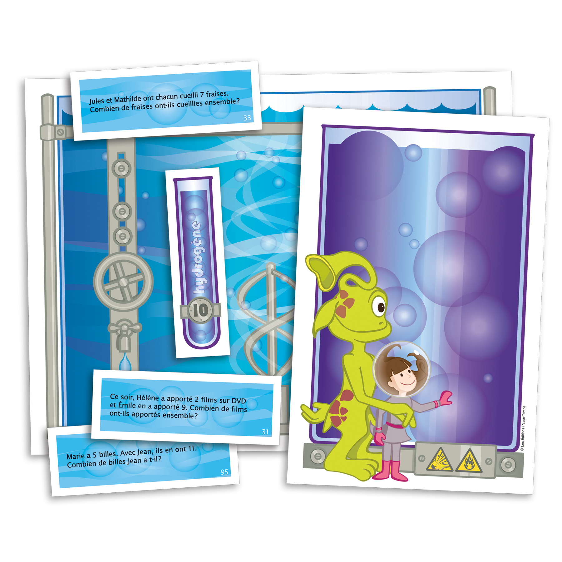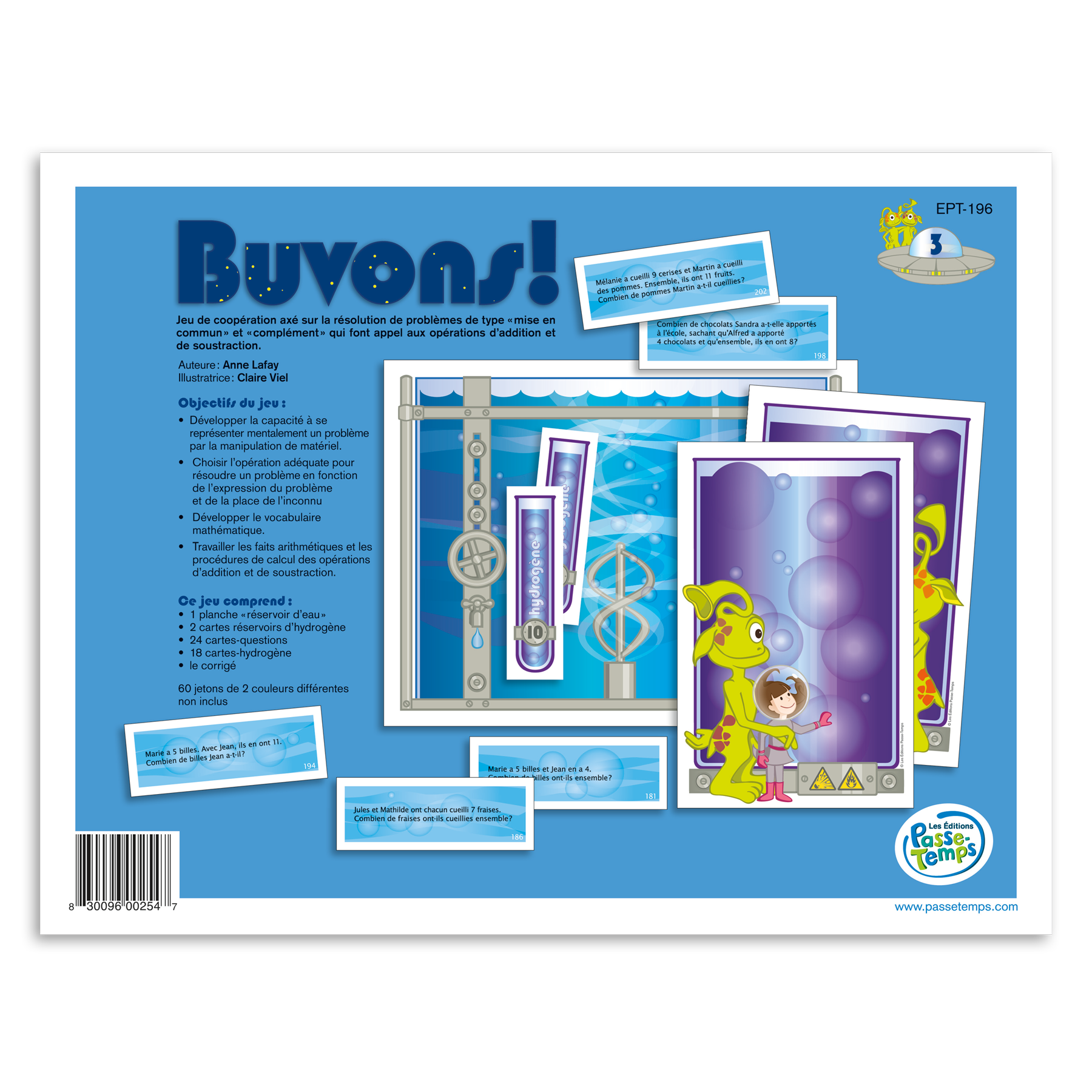Résolu est un ensemble de 5 jeux permettant le travail de la résolution de problèmes mathématiques, ainsi classés selon l'opération mathématique, la structure mathématique (ex. : ajout, mise en commun, comparaison pour l'addition), et selon la place de l'inconnu. Chacun des jeux offre ainsi un travail spécifique permettant à l'enfant de résoudre les problèmes par la manipulation de matériel à travers l'histoire de deux extraterrestres souhaitant aménager une partie habitable pour leurs deux amis terriens. Resolu - Buvons travaille l'addition et la soustraction.