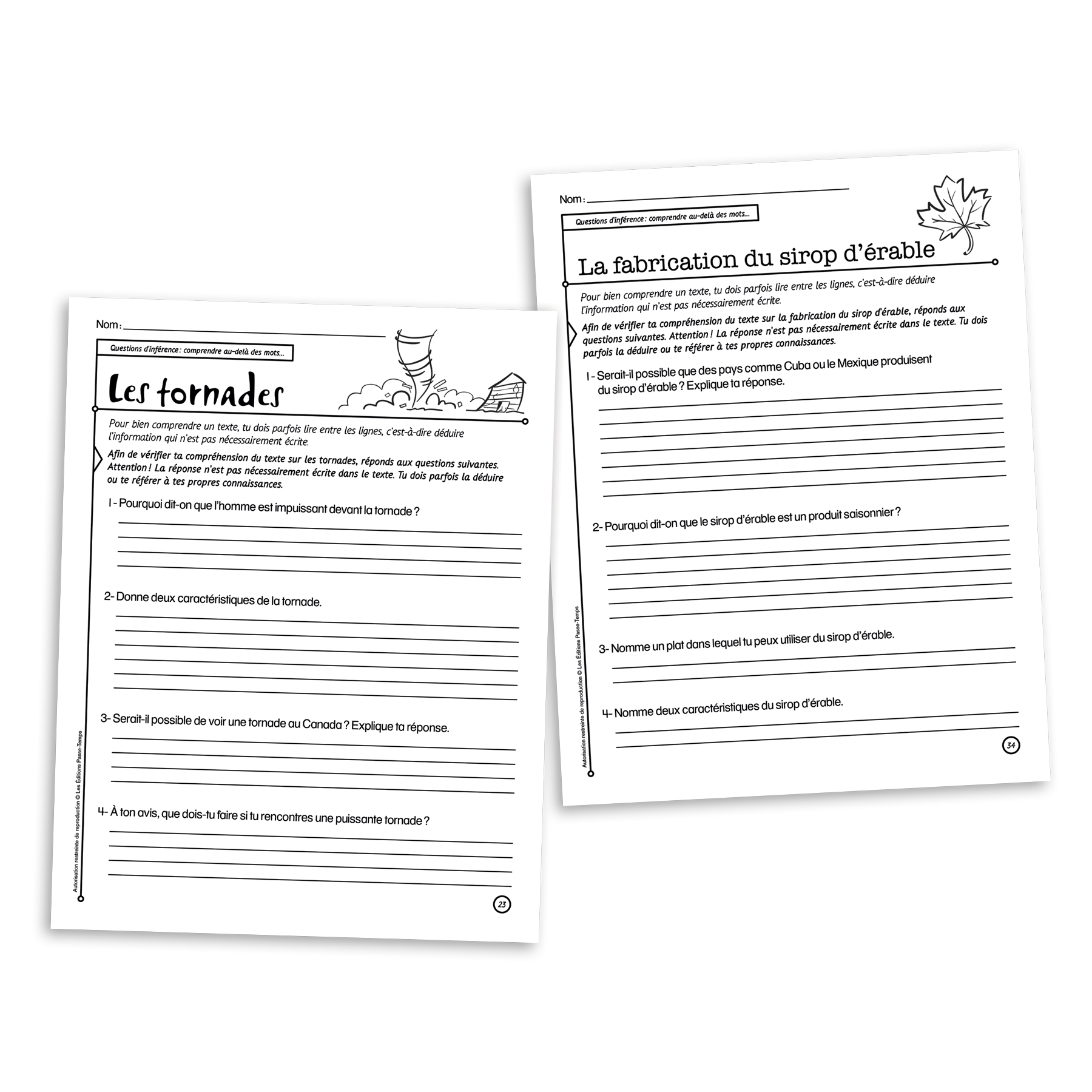 - 6 textes informatifs d'environ 350 mots destinés aux élèves du 2e cycle (thèmes variés : la pieuvre, les tornades, la fabrication du sirop d'érable, les pyramides d'Égypte, le drapeau olympique, les étoiles filantes)