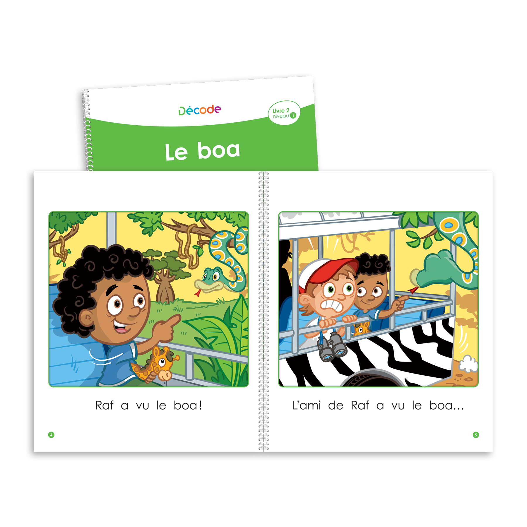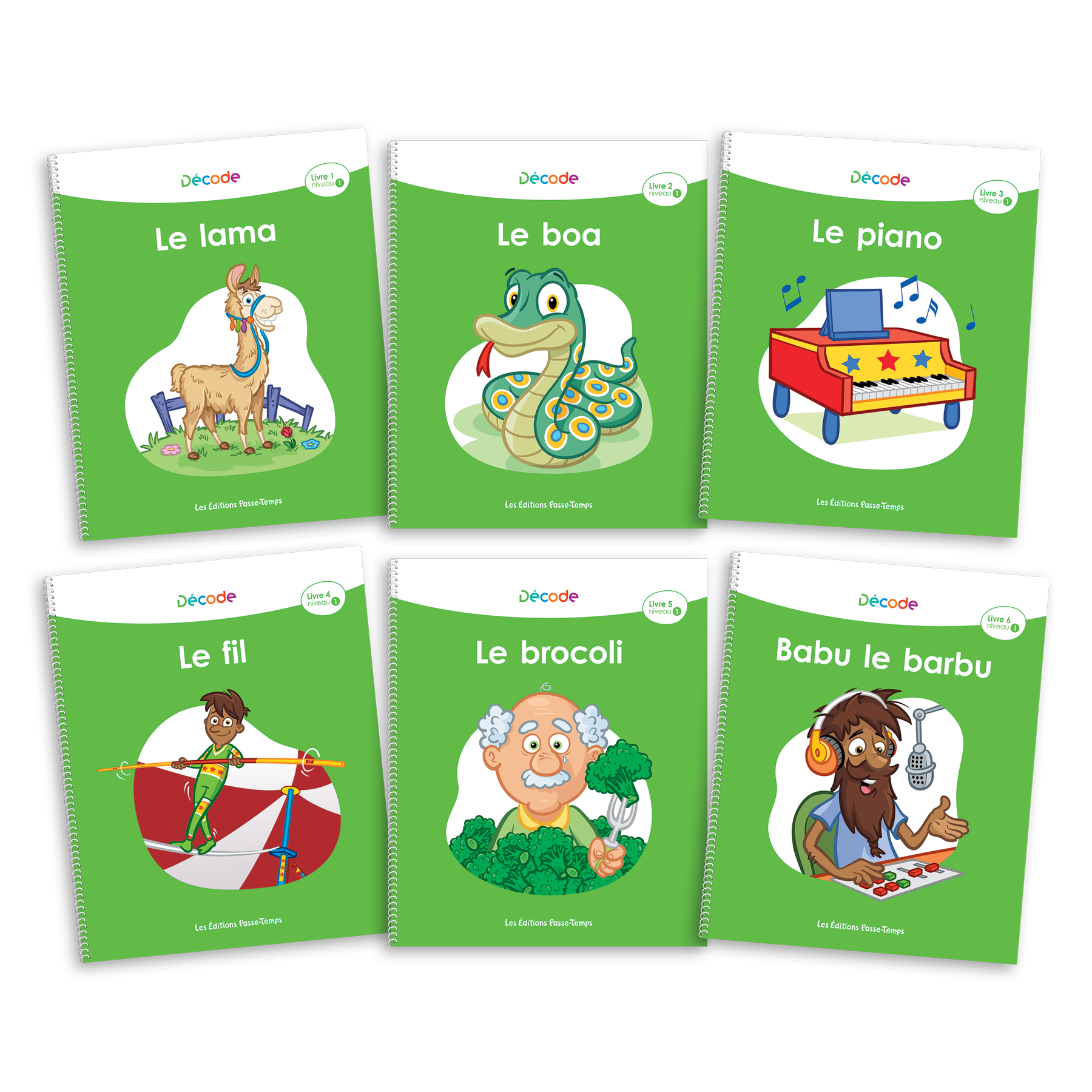 Décode est une collection de livres gradués spécialement conçue pour accompagner pas à pas le lecteur dans son apprentissage du décodage. Elle propose 6 niveaux de 12 livres qui incluent de façon progressive les correspondances graphèmes-phonèmes et les particularités de la langue française. Les 72 livres gradués permettent ainsi aux lecteurs débutants de réinvestir petit à petit leurs apprentissages dans un contexte de lecture authentique et amusant qui correspond à leur niveau d’habileté. La série 1 Introduction comprend les livres 1 à 6 alors que la série 2 Consolidation inclut les livres 7 à 12 de chacun des niveaux.