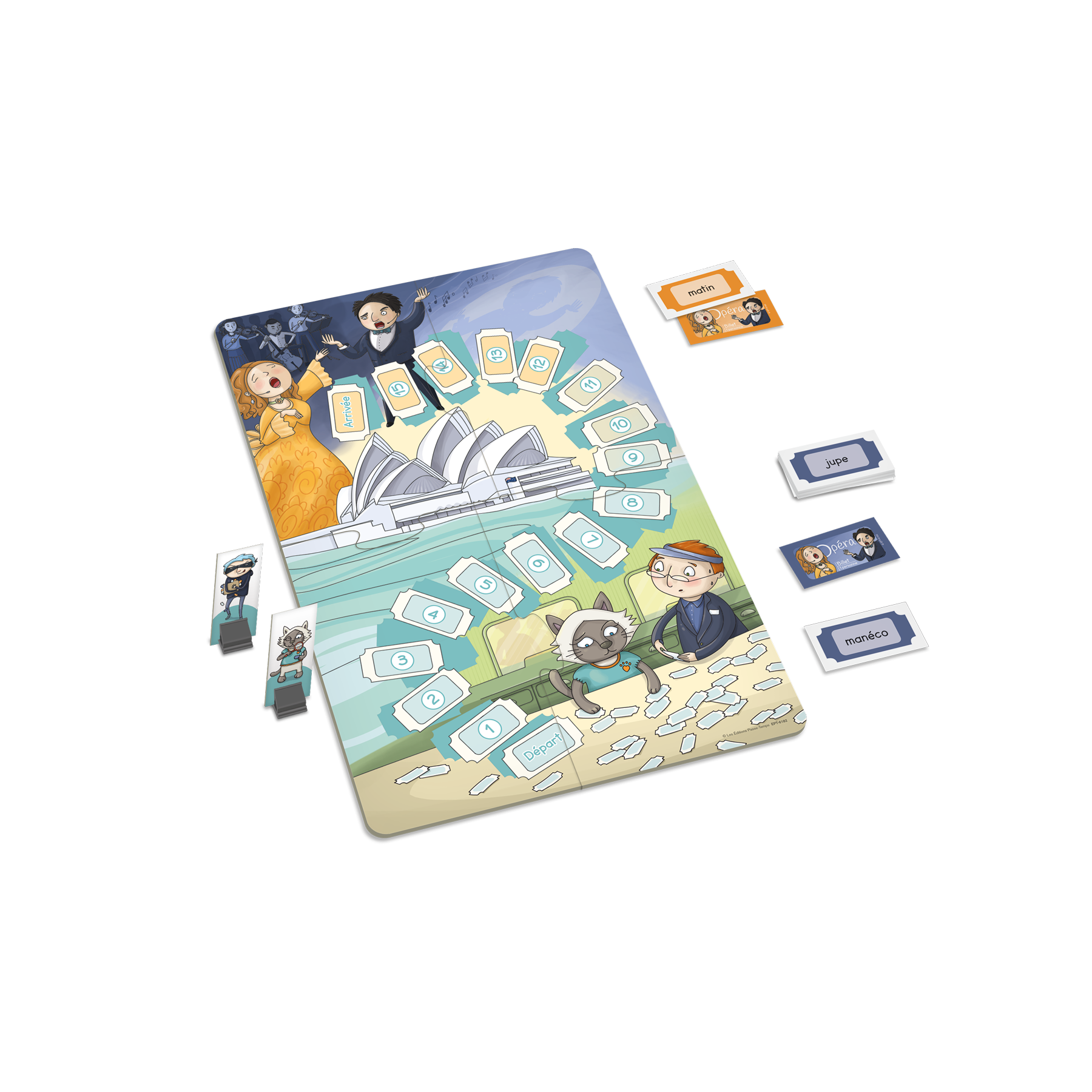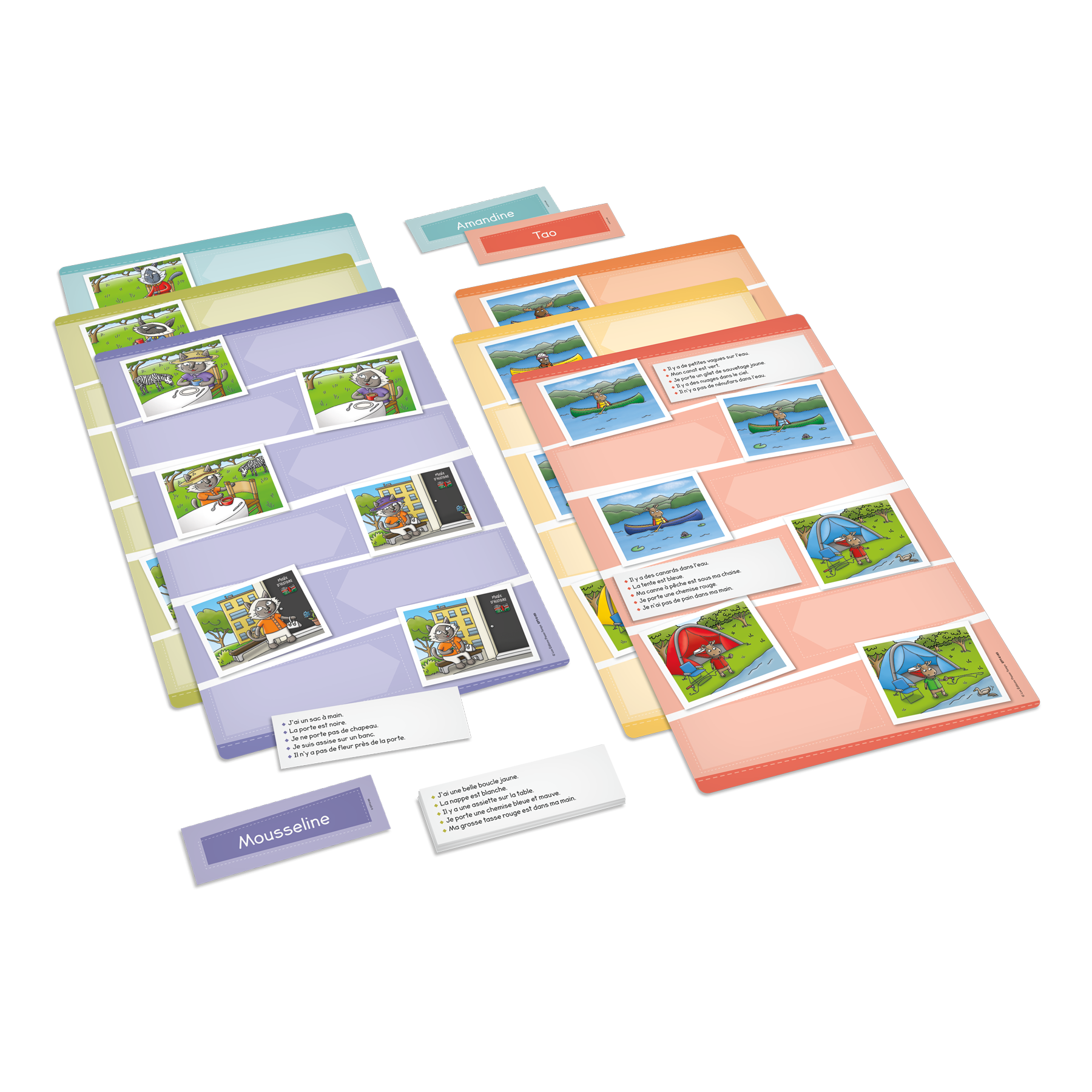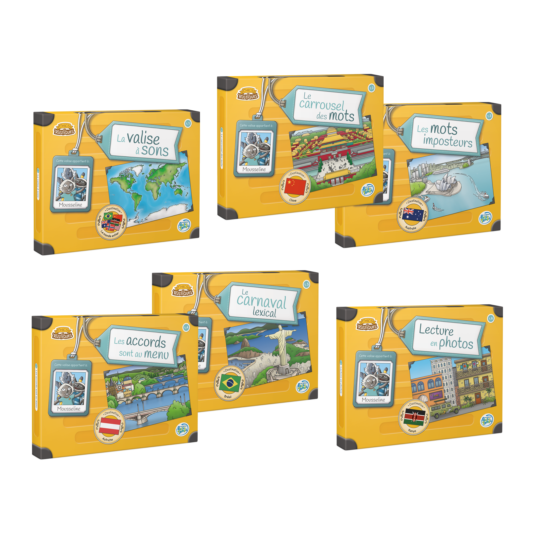 Ensemble de 6 jeux de français destinés aux élèves de 1re année du primaire. Les joueurs aident Mousseline à réaliser différentes activités lors de son voyage autour du monde. L’ensemble comprend 6 jeux en boite :