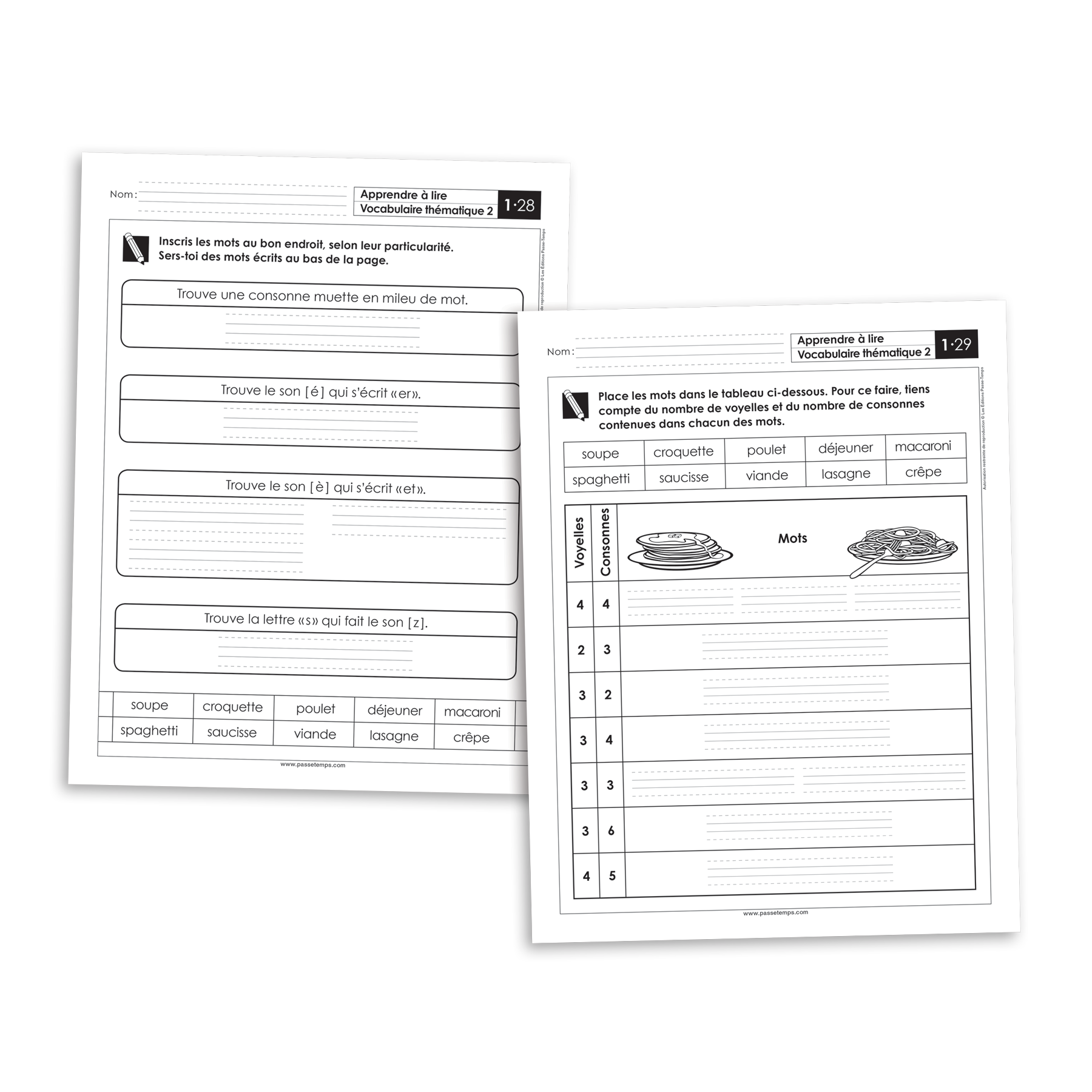 Ensemble de fiches reproductibles variées, amusantes et attrayantes conçues pour les élèves de première année sur les thèmes suivants : animaux, espace, instruments de musique, météorologie, repas.