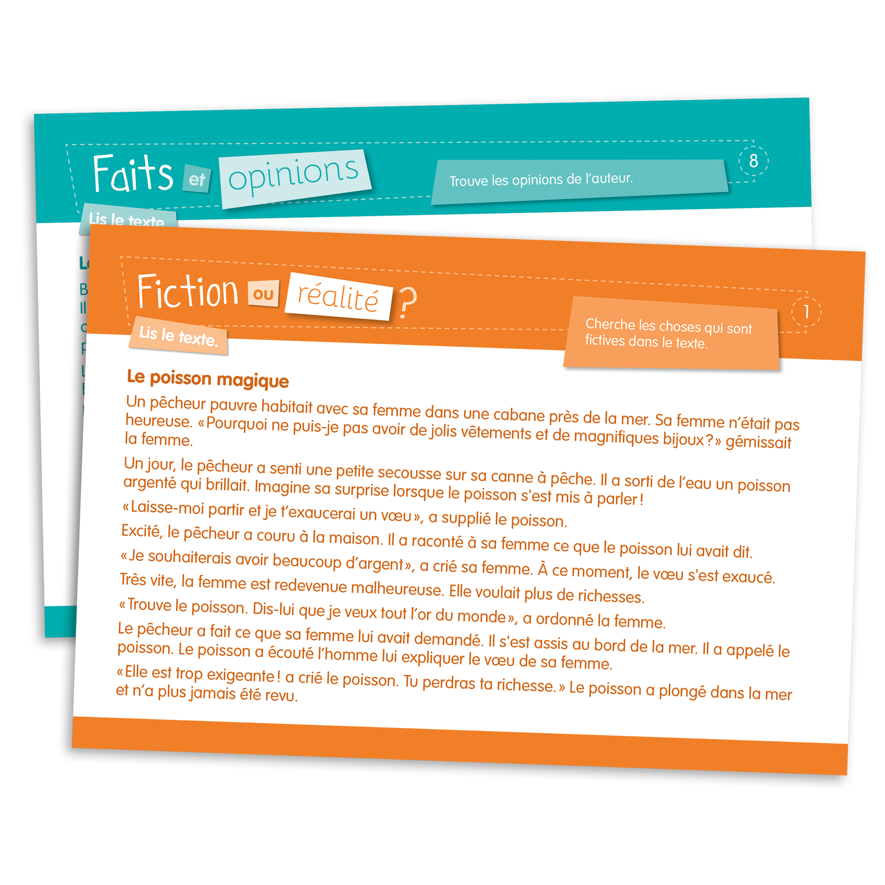 Ensemble de 117 fiches (format 23 cm X 15,5 cm) laminées et imprimées recto verso visant à travailler les habiletés de lecture. Chaque fiche comporte un court texte, 4 questions à choix multiples et une question à développement. Les fiches sont classées selon l'objectif ciblé.