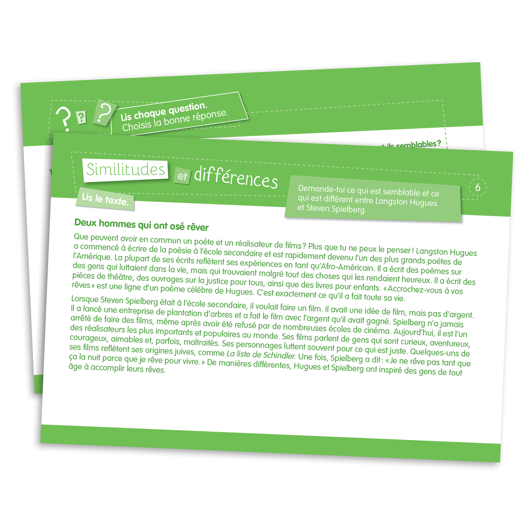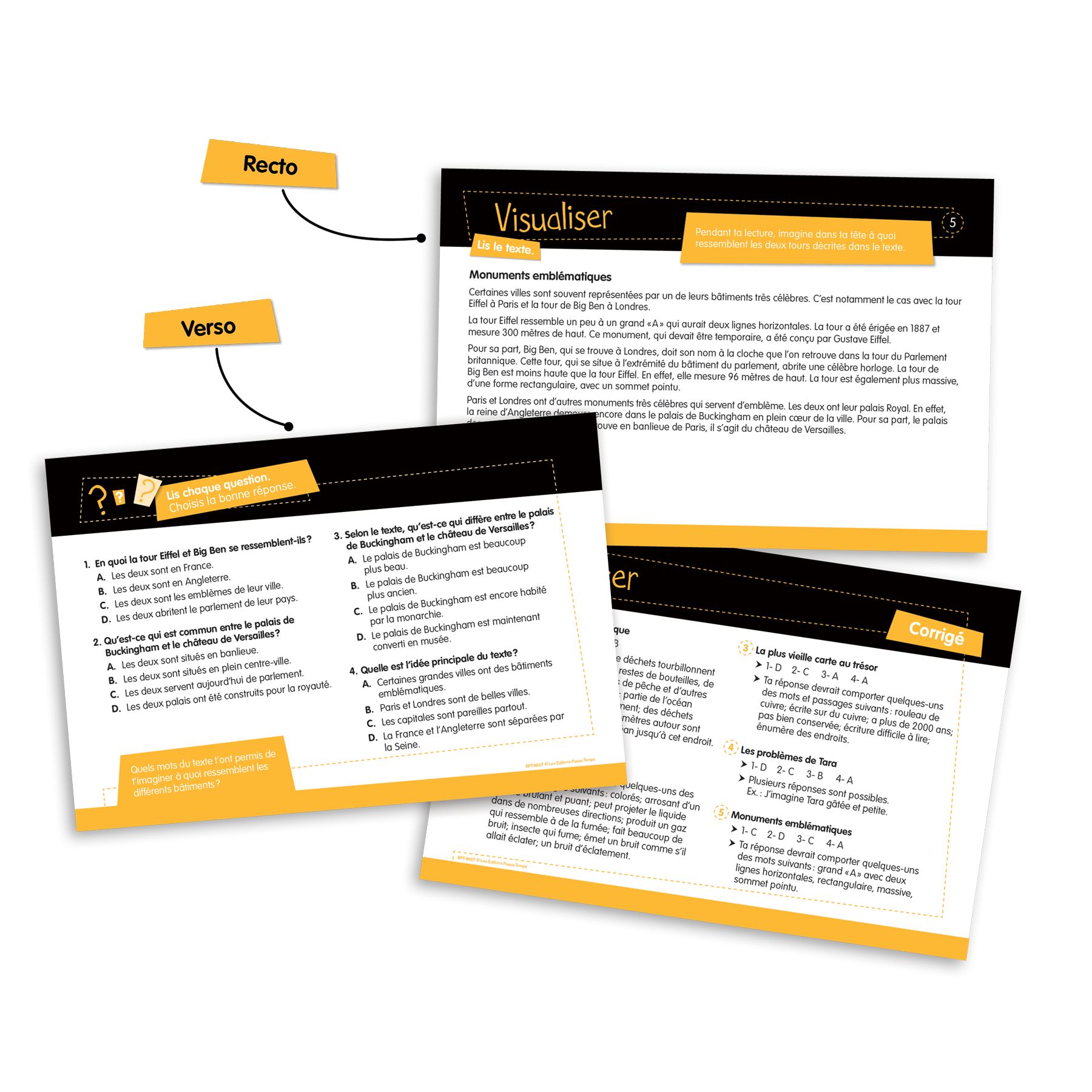 Ensemble de 117 fiches (format 23 cm X 15,5 cm) laminées et imprimées recto verso visant à travailler les habiletés de lecture. Chaque fiche comporte un court texte, 4 questions à choix multiples et une question à développement. Les fiches sont classées selon l'objectif ciblé parmi les 15 suivants :