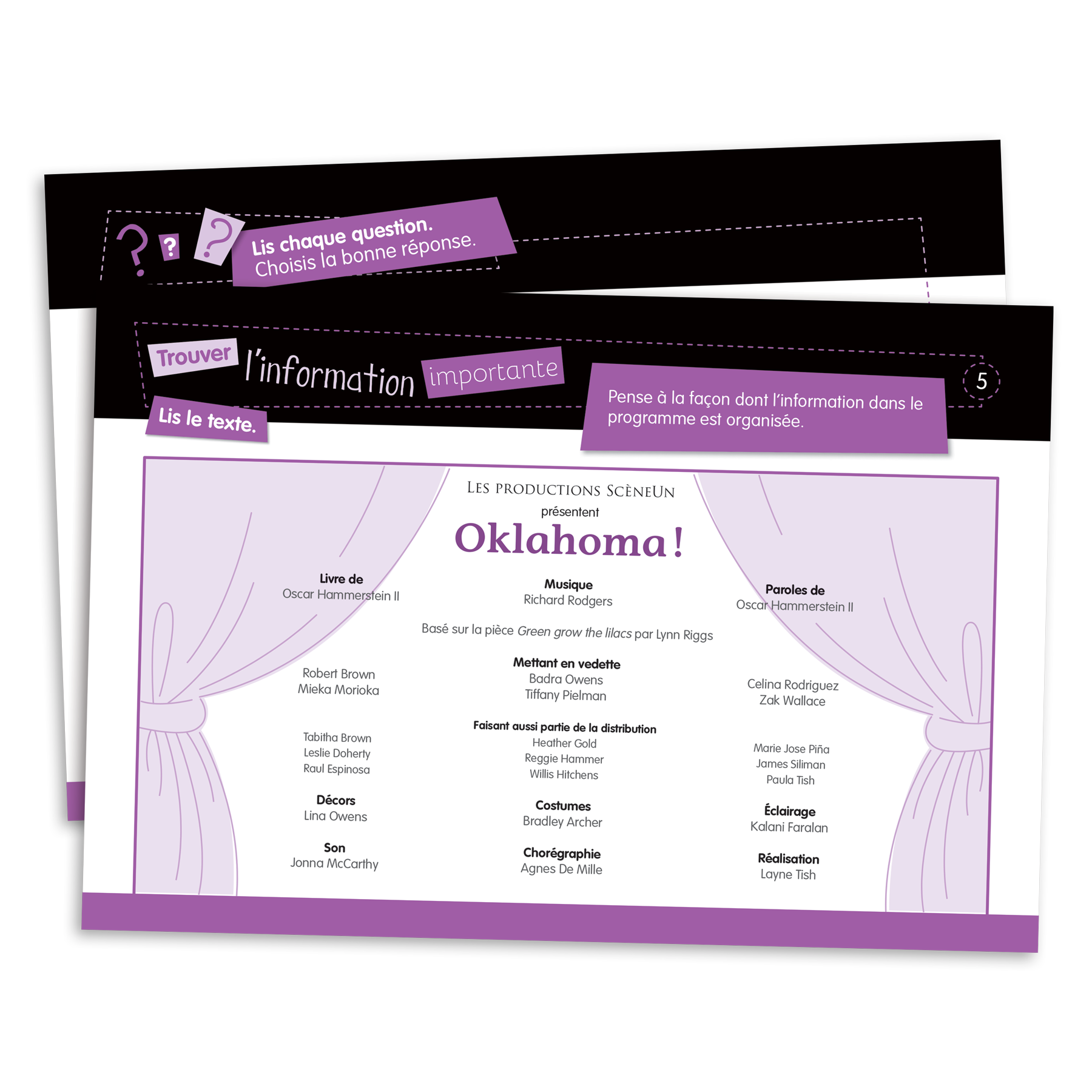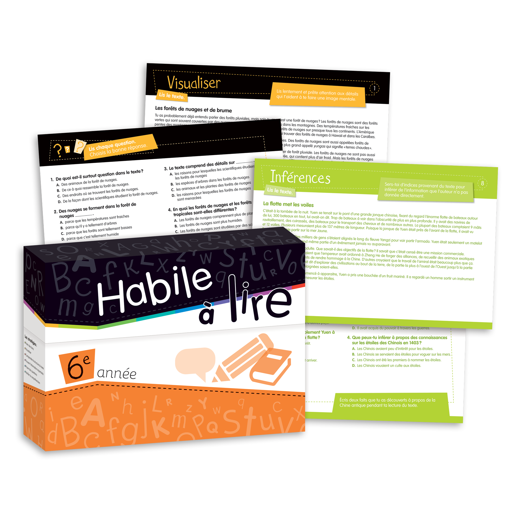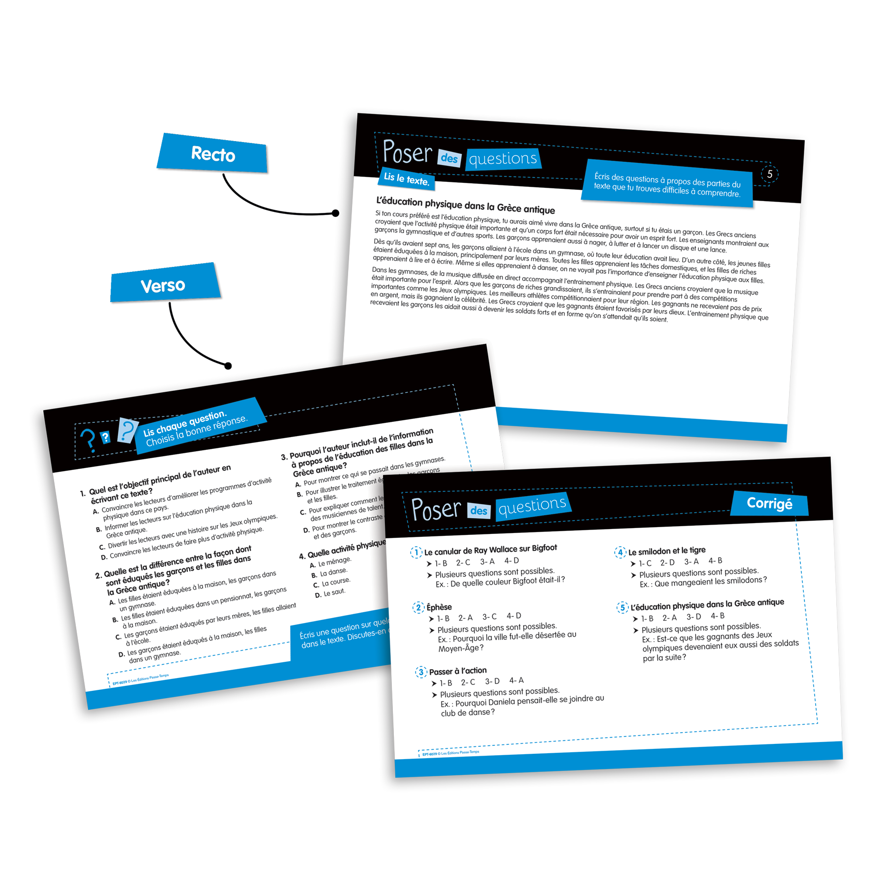 Ensemble de 117 fiches (format 23 cm X 15,5 cm) laminées et imprimées recto verso visant à travailler les habiletés de lecture. Chaque fiche comporte un court texte, 4 questions à choix multiples et une question à développement. Les fiches sont classées selon l'objectif ciblé.