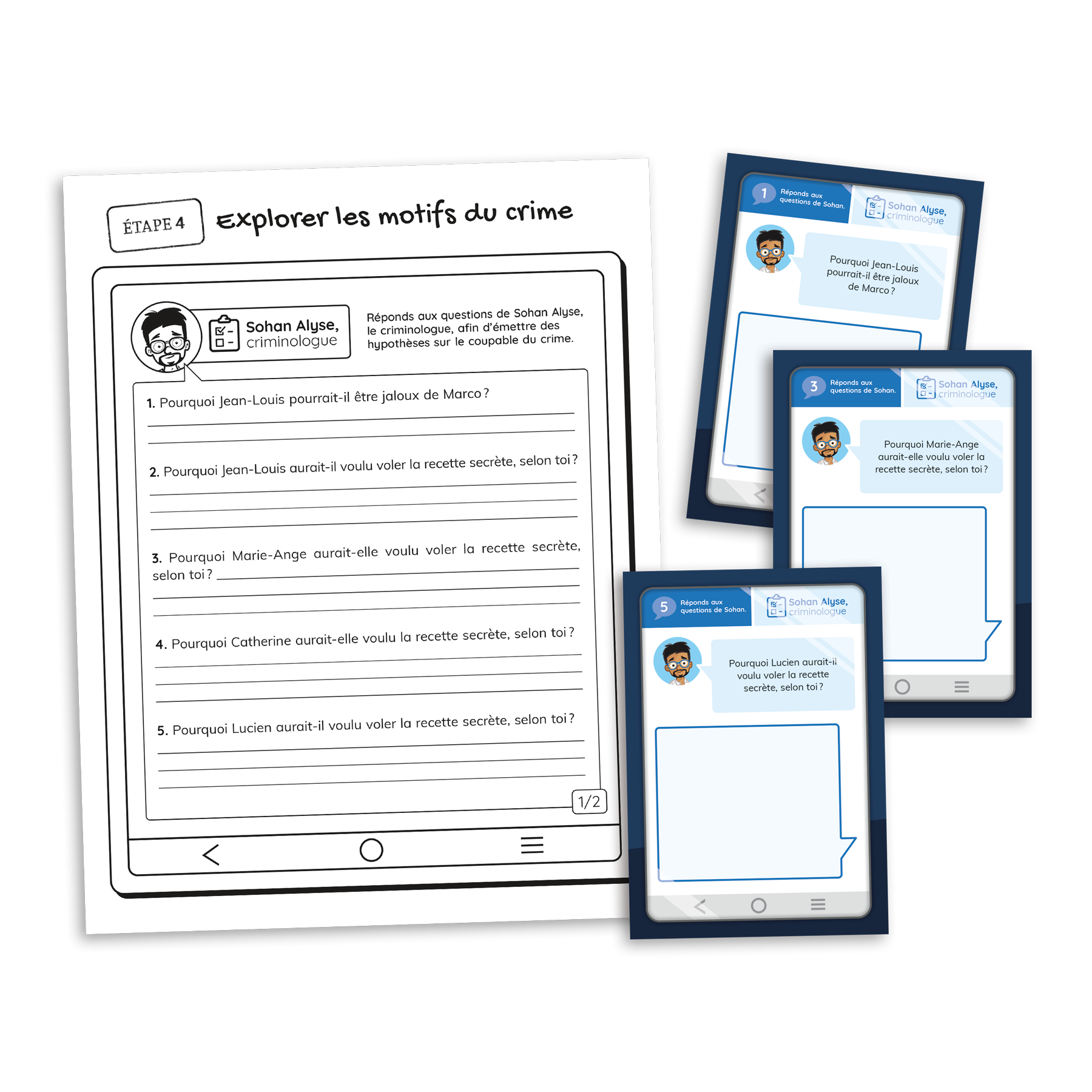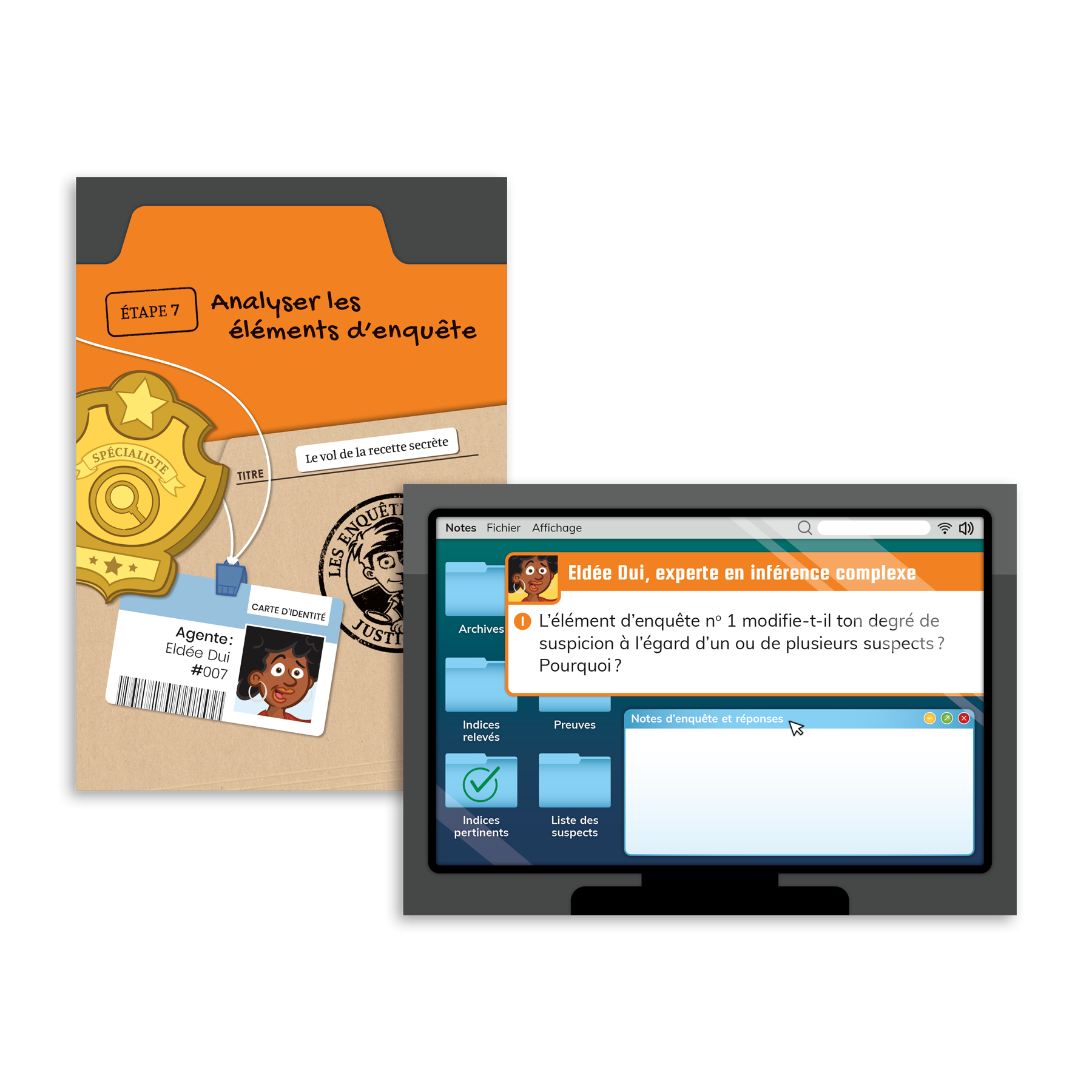 La résolution de l’enquête prend la forme d’un projet dans lequel s’alternent différentes activités de lecture et d’écriture. Des activités complémentaires (situations de lecture et écriture et situation-problème mathématique) sont également fournies, permettant ainsi de stimuler des habiletés variées dans le cadre de l’enquête.