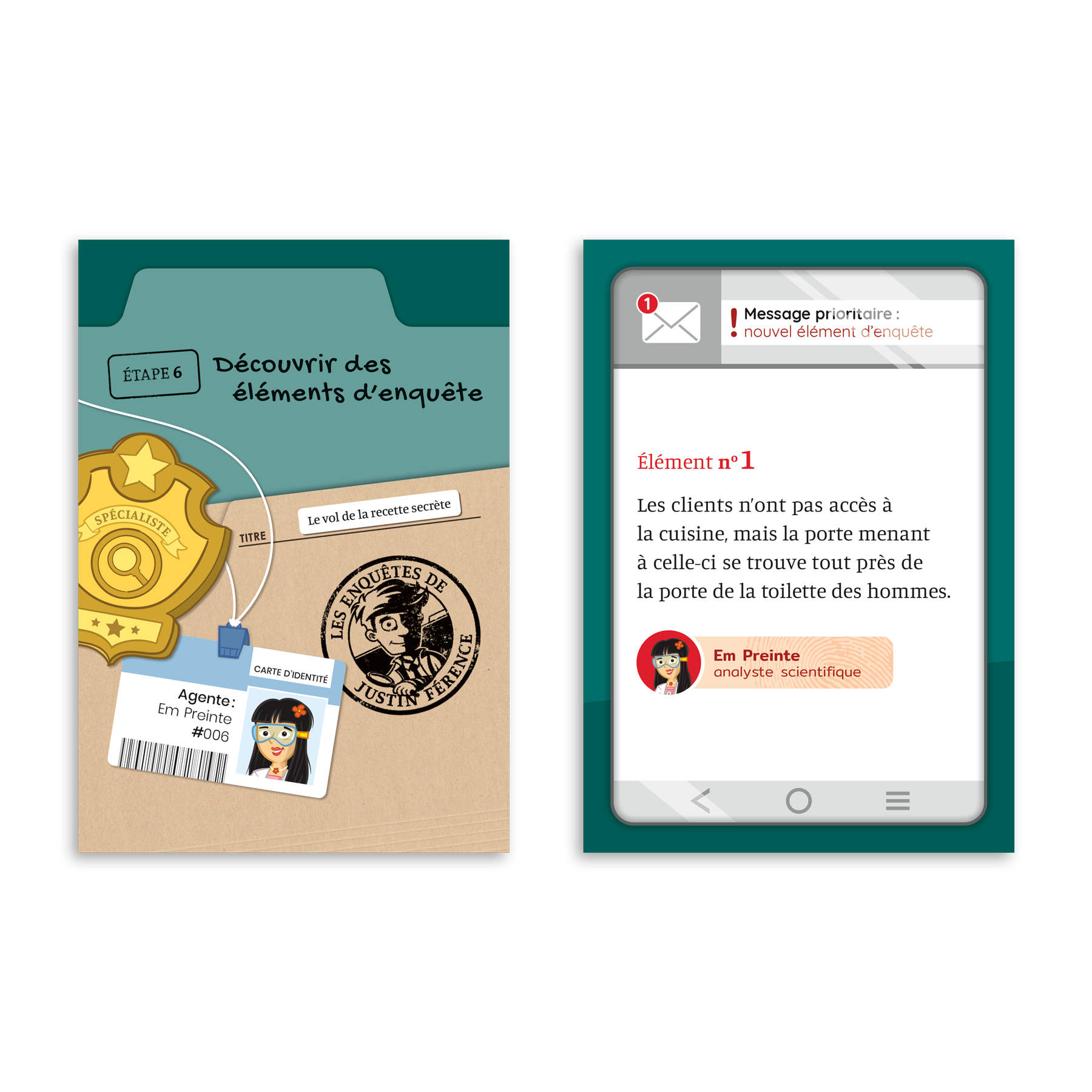 En plus du matériel nécessaire à la réalisation des différentes étapes de l’enquête, des enveloppes ainsi qu’une chemise en carton sont fournies dans la boite afin que l’intervenant puisse « mettre en scène » le cas à résoudre dans une ambiance ludique.