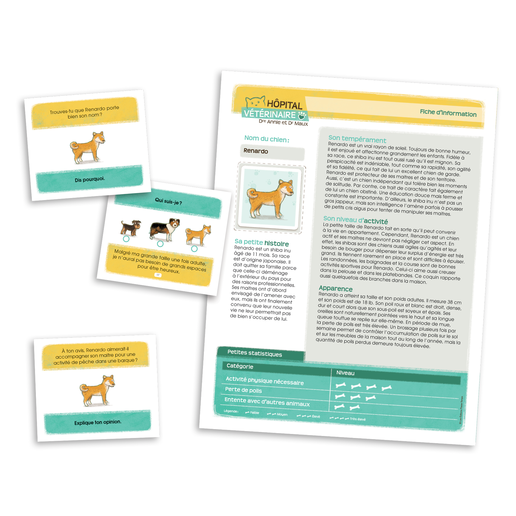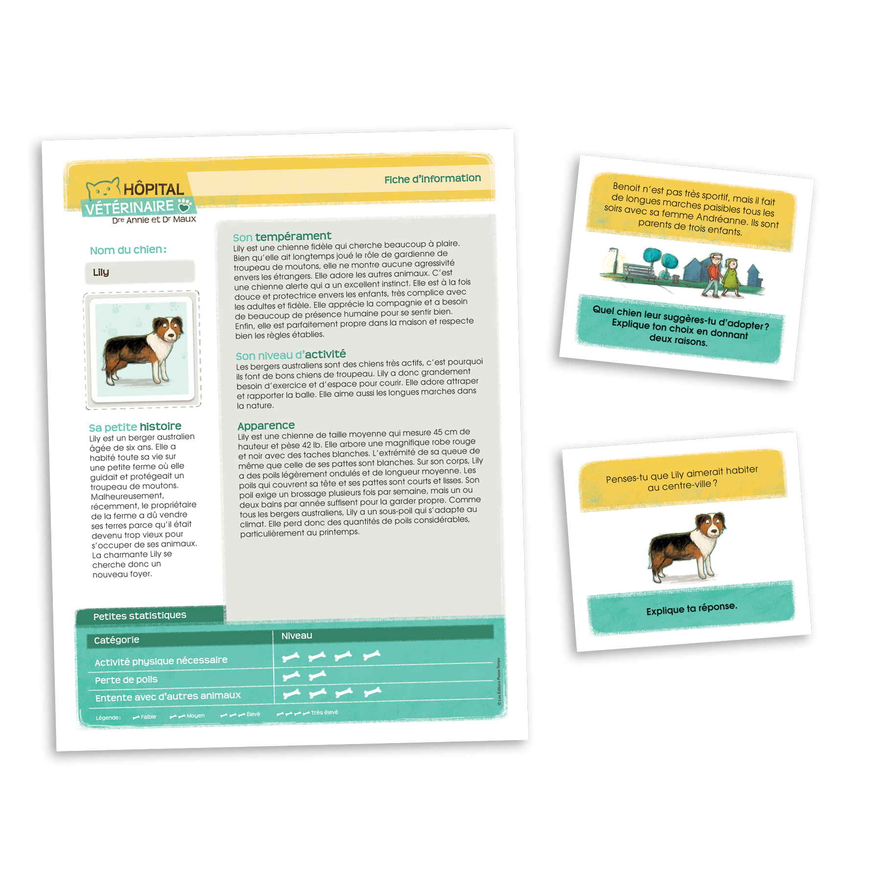 La Dre Annie et le Dr Maux ont organisé une journée d’adoption canine. En partenariat avec des refuges de la région, plusieurs chiens abandonnés sont disponibles pour une adoption à l’hôpital vétérinaire. Les apprentis vétérinaires doivent se renseigner sur ces chiens pour conseiller adéquatement les familles adoptives dans leur choix. Ils devront tenir compte de tous les éléments recueillis, de leurs connaissances sur le monde et de leurs expériences personnelles. Ils auront également à justifier leurs choix avec des arguments convaincants.