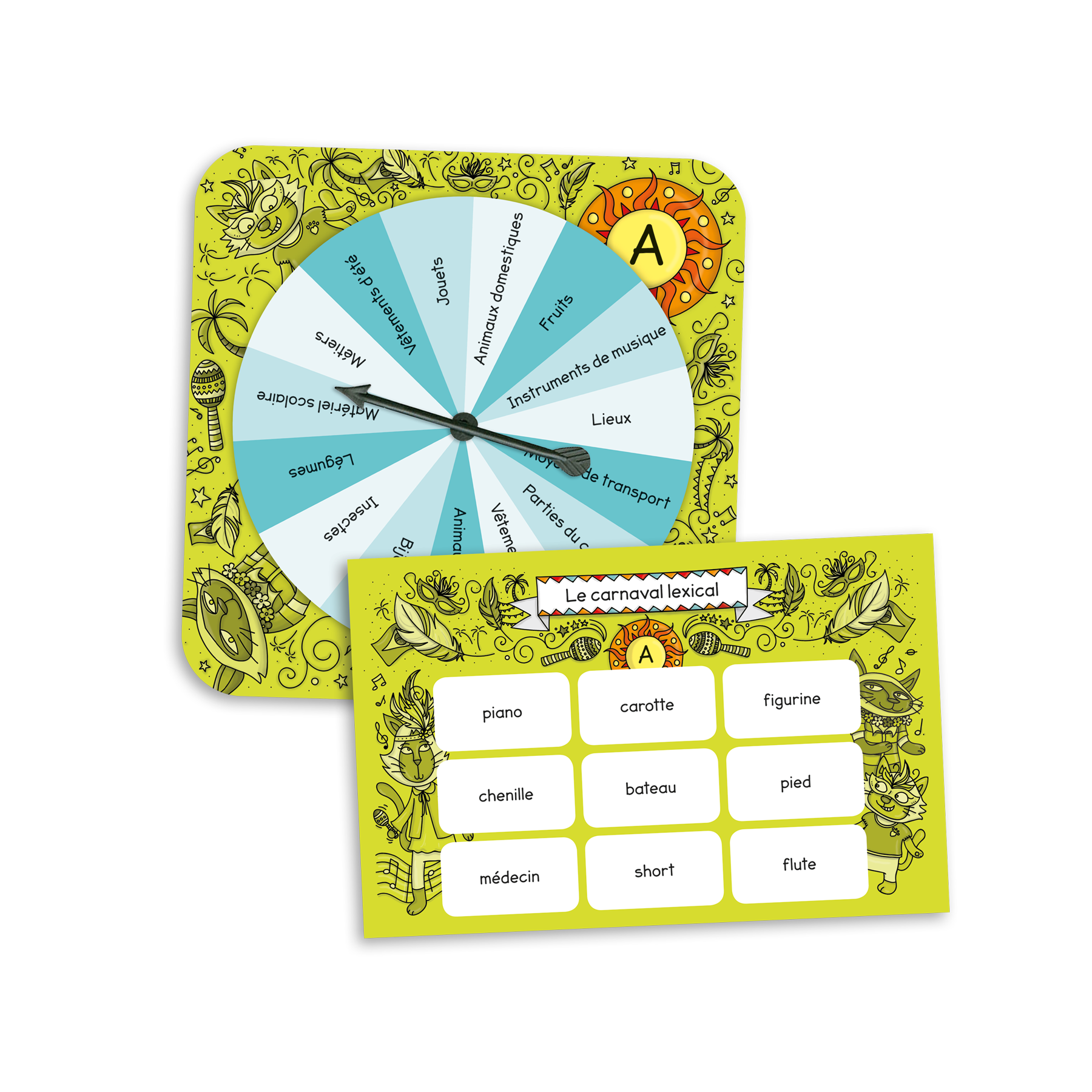 - Avec le côté A, l’intervenant fait tourner la flèche d’une roulette de catégories et les joueurs doivent trouver des mots qui correspondent à ces catégories sur leur planche.