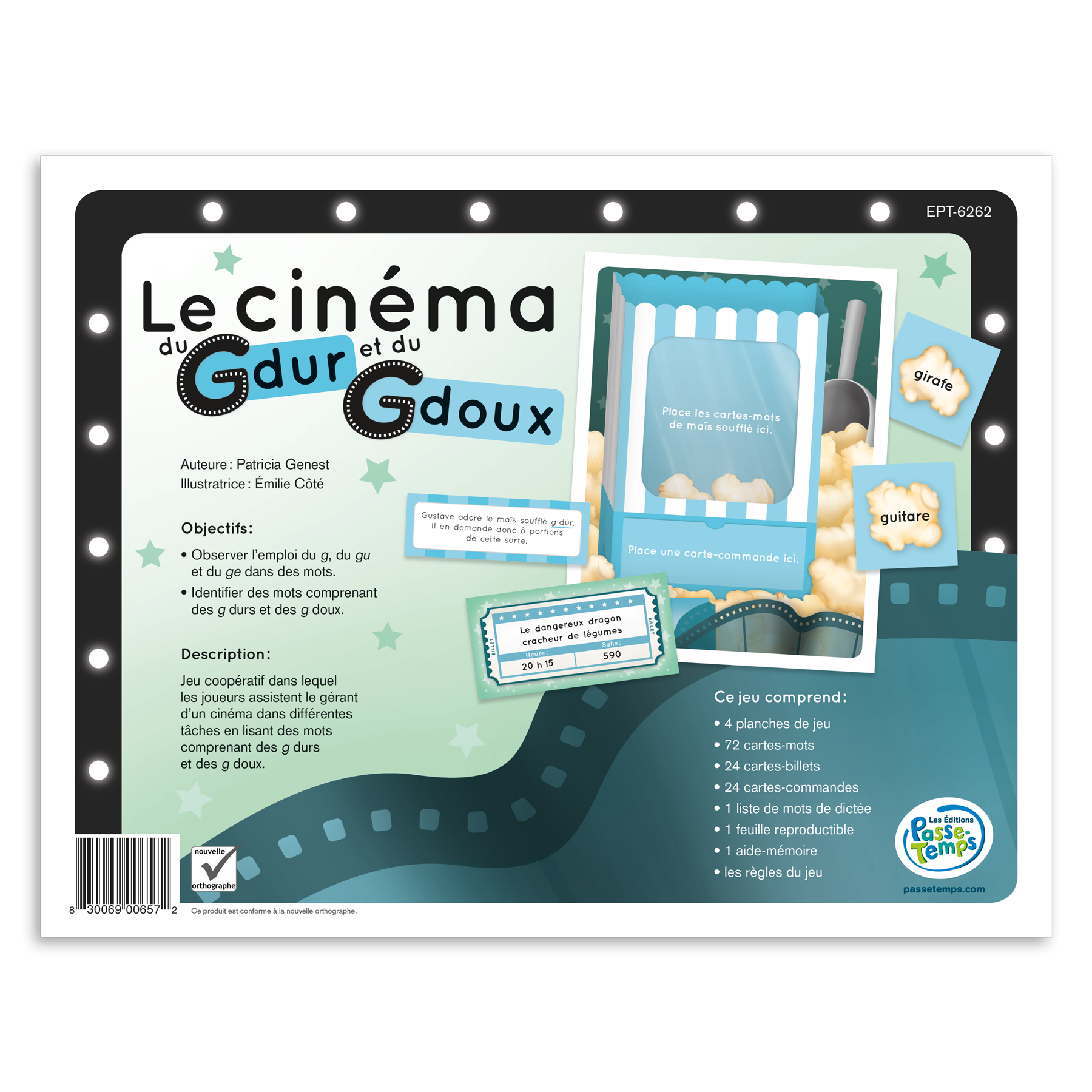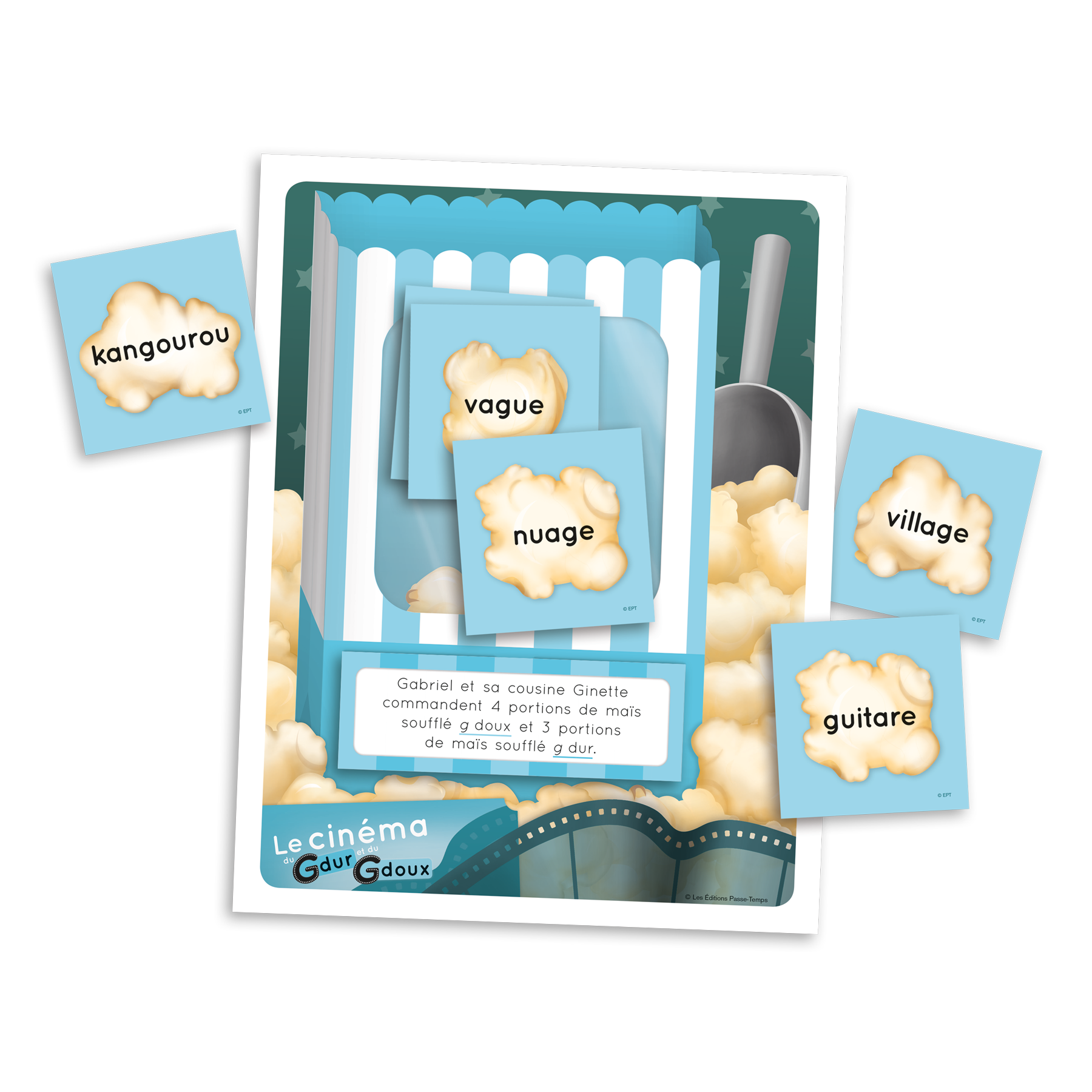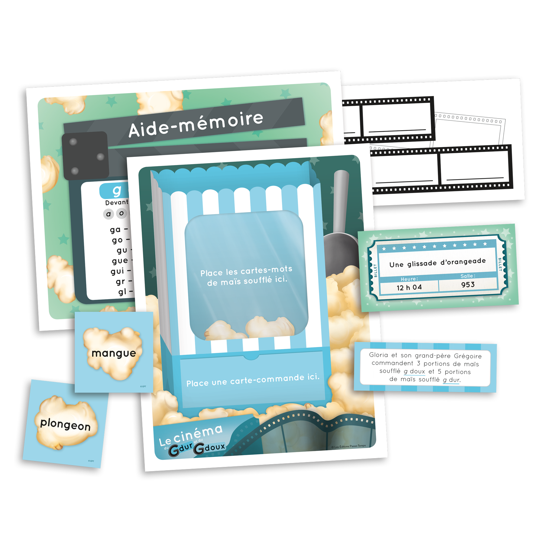 Jeu coopératif dans lequel les joueurs assistent le gérant d’un cinéma dans différentes tâches en lisant des mots qui comprennent des g durs et des g doux. Le jeu comprend quatre planches de jeu individuelles ainsi que 72 cartes-mots, 24 cartes de billets de cinéma et 24 cartes de commandes de maïs soufflé sur lesquelles on peut lire différents mots avec des g durs et des g doux. Un aide-mémoire présente la règle d’usage et une liste de 23 mots de dictée avec des g durs et des g doux est fournie.