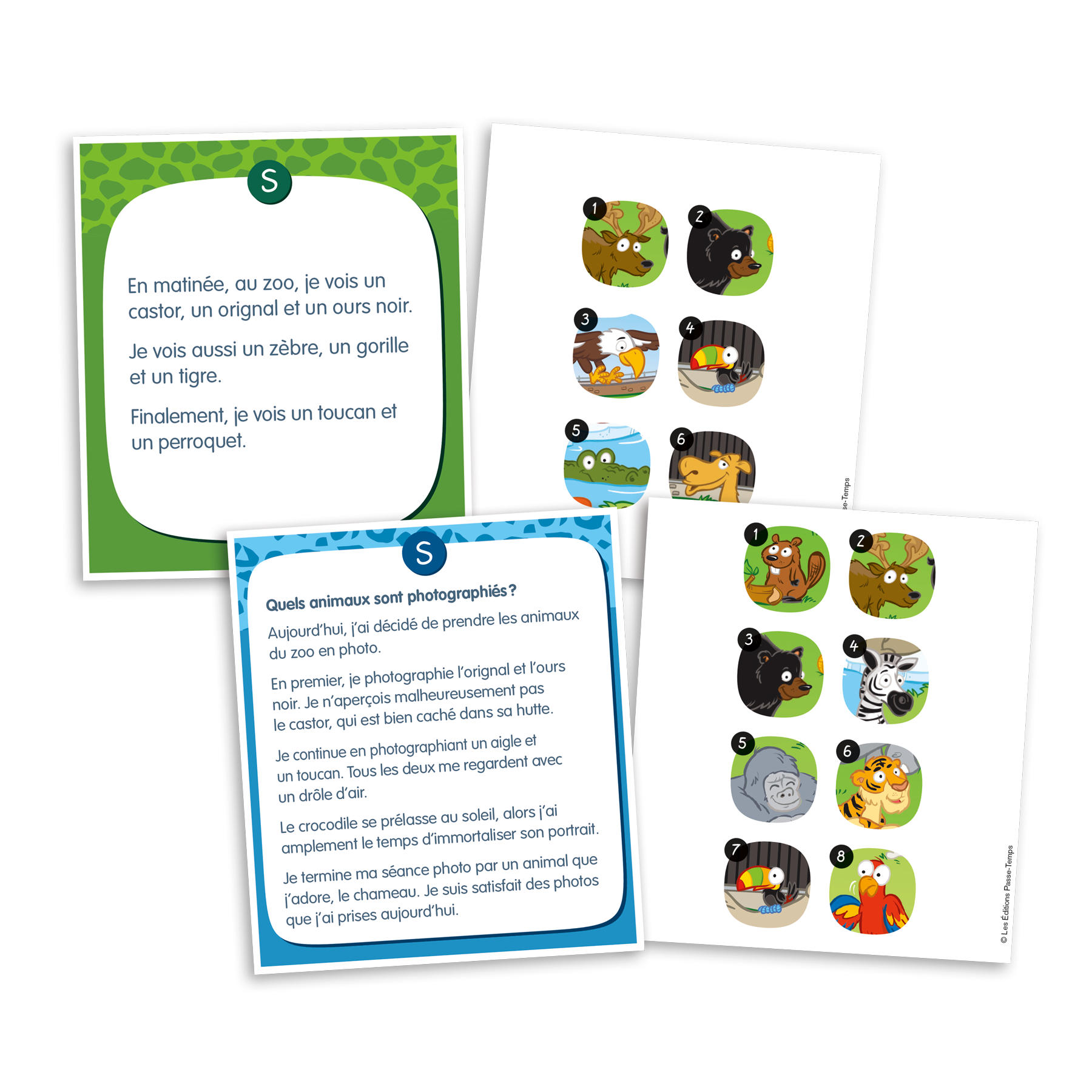Le joueur lit sa carte de visite du zoo et identifie les animaux correspondants sur la planche de jeu représentant un zoo (3 niveaux de difficulté).