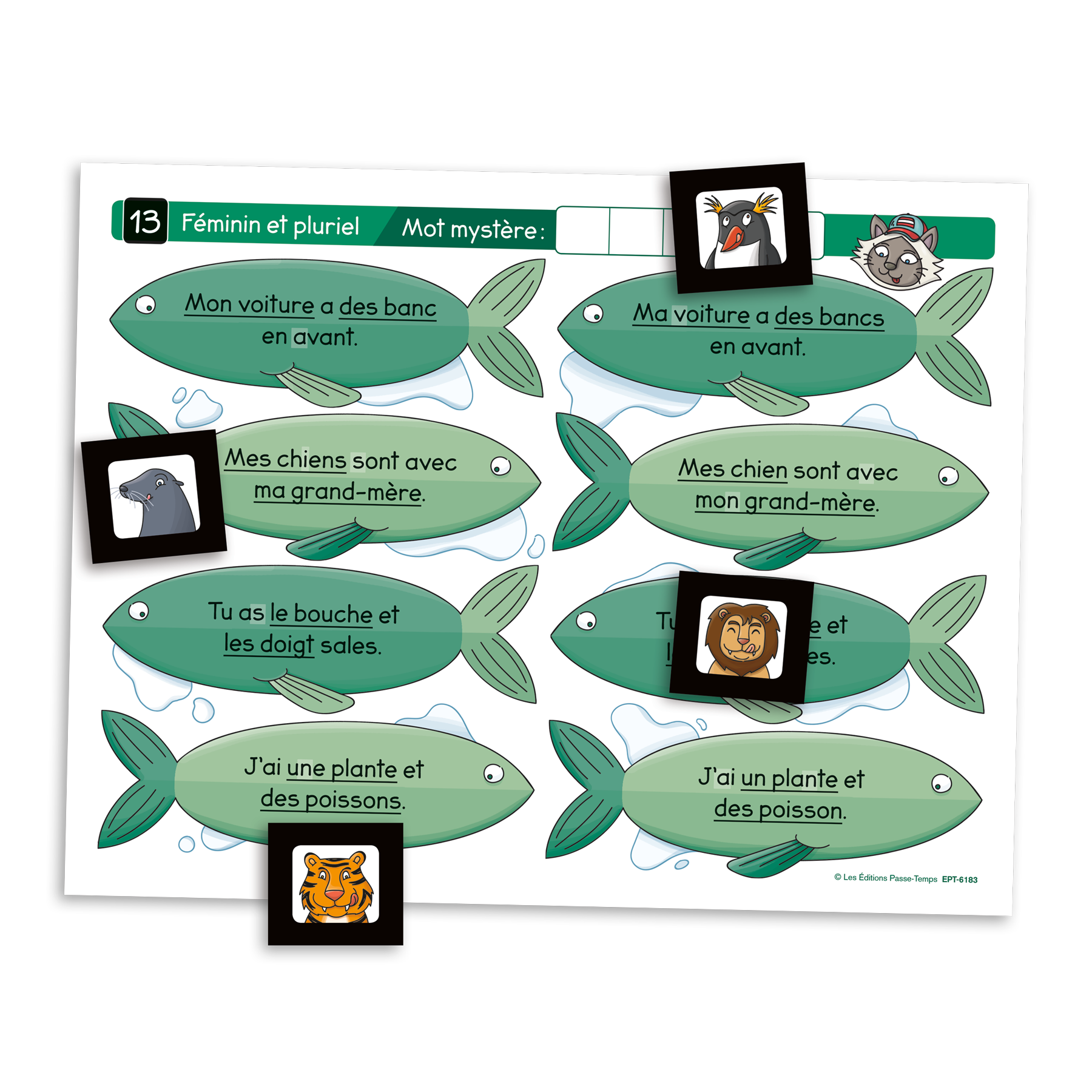 Le jeu comprend 8 planches de jeu recto verso de jeu ainsi qu’un corrigé. Les joueurs peuvent ainsi jouer seuls ou en équipe en utilisant une planche de jeu à la fois et en validant leurs réponses à l’aide du corrigé. L’intervenant peut choisir d’utiliser des planches de jeu travaillant l’accord du nom et du déterminant en genre, en nombre ou les deux.