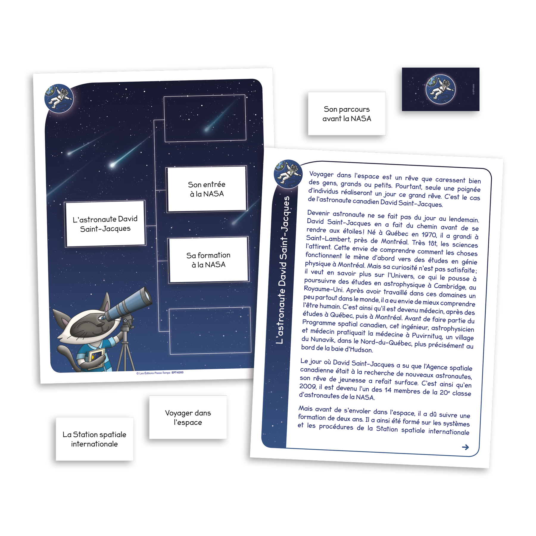 Les galaxies conceptuelles est un jeu destiné aux élèves de 4e année du primaire ciblant les macroprocessus en lecture tels que la reconnaissance et l’organisation des idées principales d’un texte. Les joueurs aident Florentin et ses amies à se rappeler les éléments importants de différents textes sur l’astronomie afin de se préparer à l’observation des étoiles sur le mont Wellington, en Tasmanie.