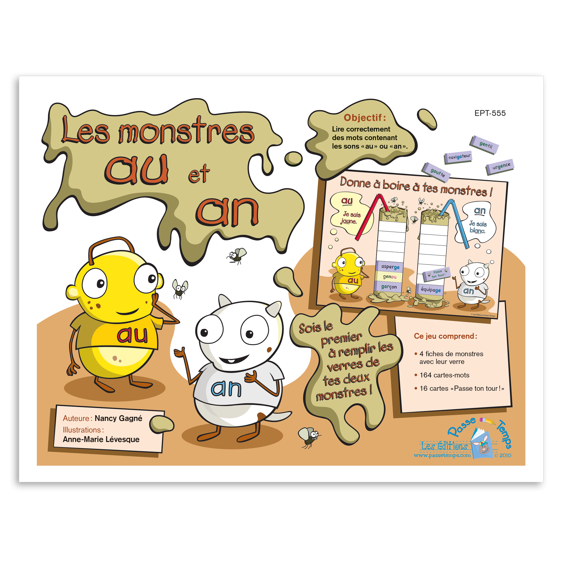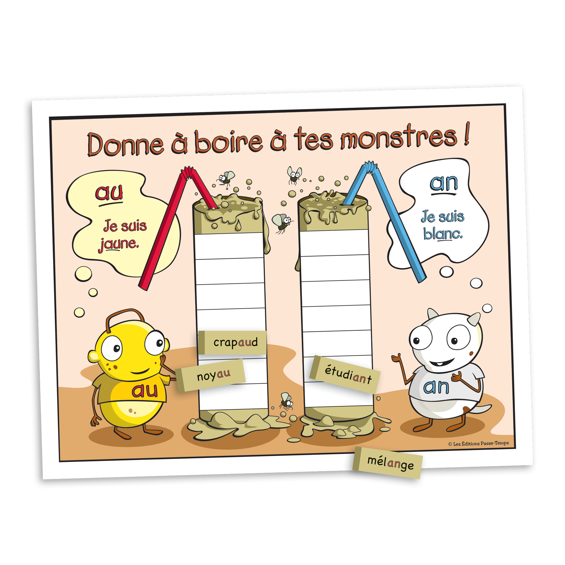 L'élève pige une carte et lit le mot écrit. Il doit déterminer si ce mot contient un son « au » ou « an » et placer sa carte sur le verre approprié, afin d'abreuver chacun des 2 monstres.