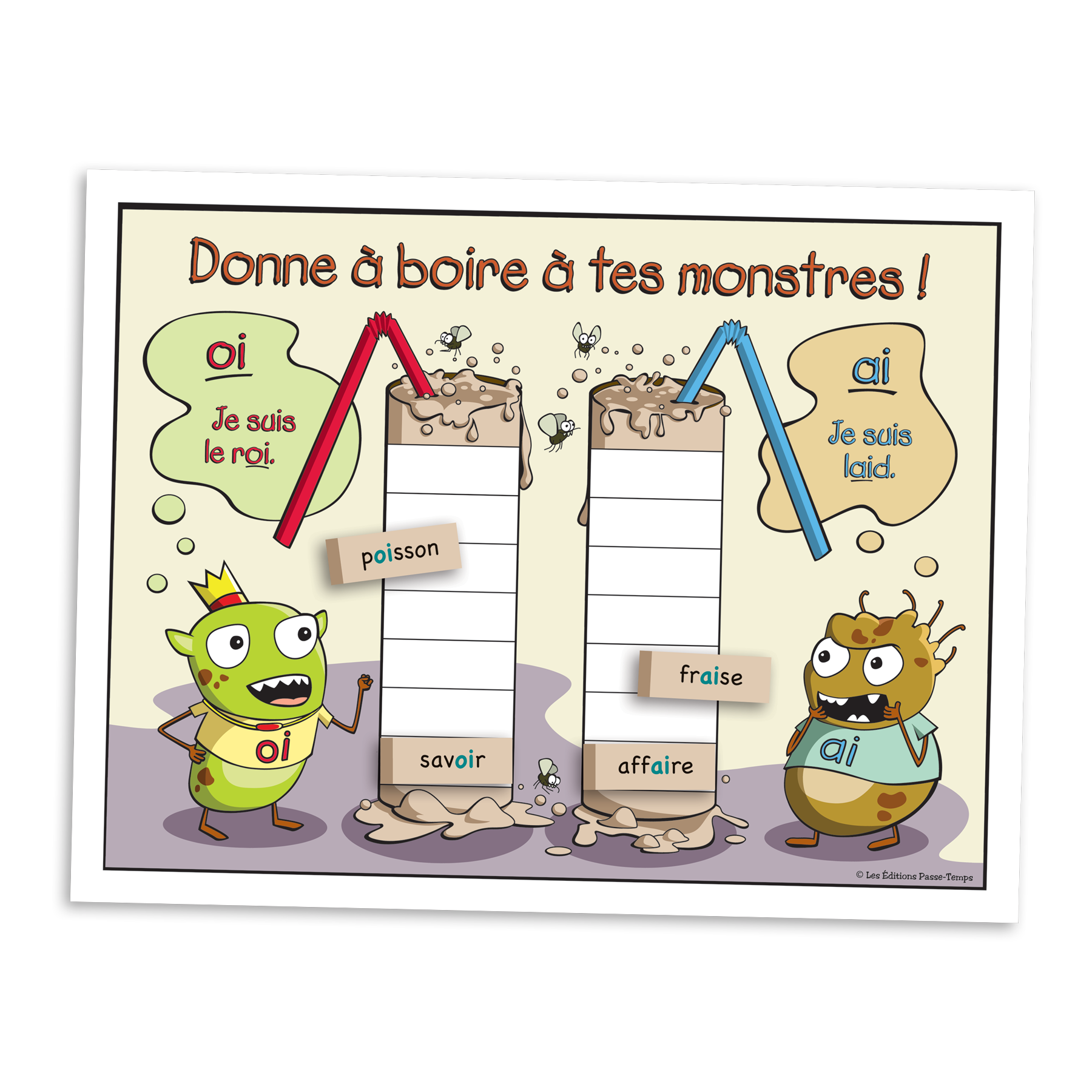L'élève pige une carte et lit le mot écrit. Il doit déterminer si ce mot contient un son « oi » ou « ai » et placer sa carte sur le verre approprié, afin d'abreuver chacun des 2 monstres.