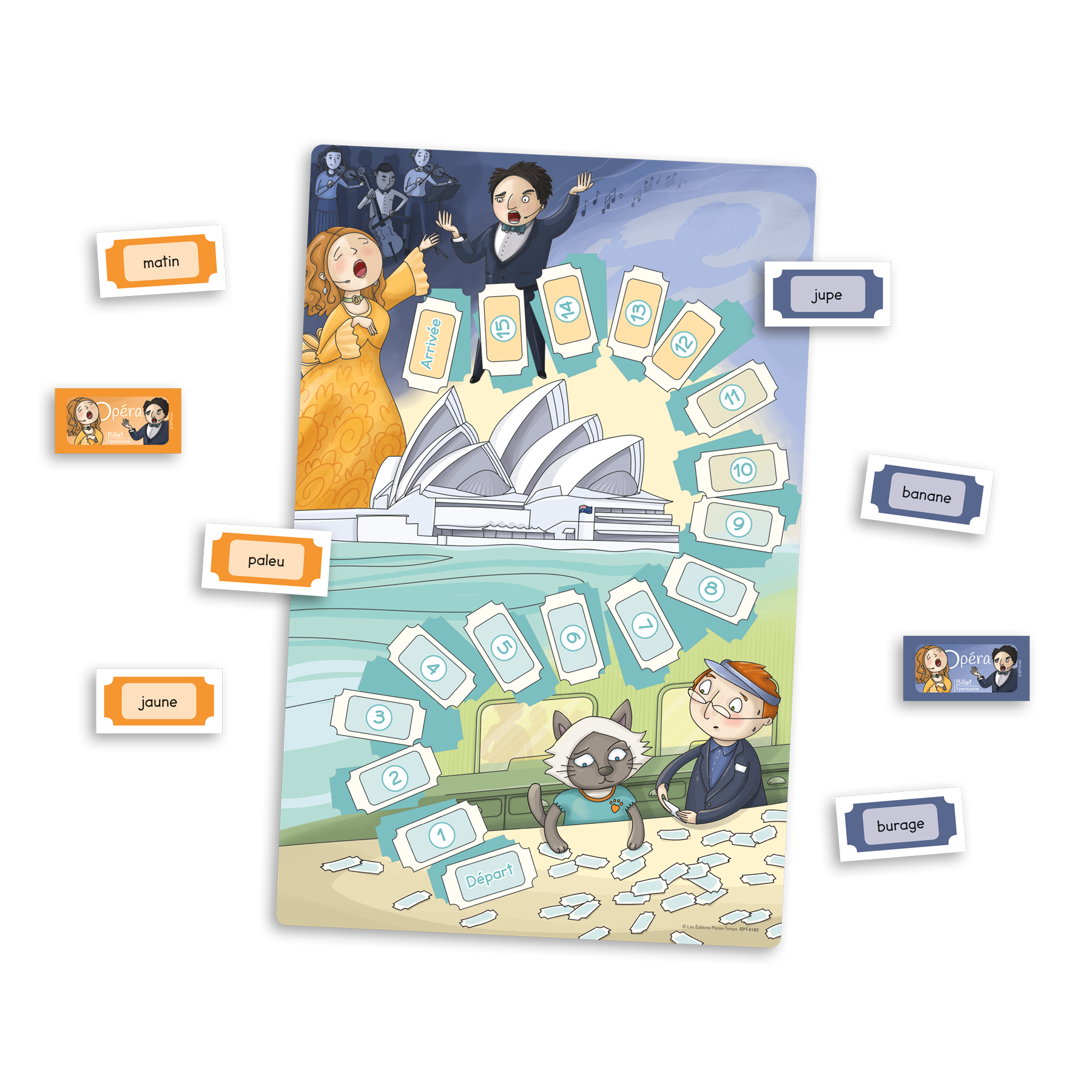 Les mots imposteurs est un jeu de parcours destiné aux élèves de 1re et 2e année du primaire ciblant le décodage de mots et de non-mots. Les joueurs doivent permettre à Mousseline d’assister à un spectacle d’opéra à Sydney, en Australie, et d’entrer dans la salle avant l’imposteur qui vend de faux billets. Pour ce faire, ils lisent des mots et doivent déterminer lequel des personnages peut avancer dans le parcours : Mousseline s’il s’agit d’un vrai mot et l’imposteur s’il s’agit d’un non-mot.