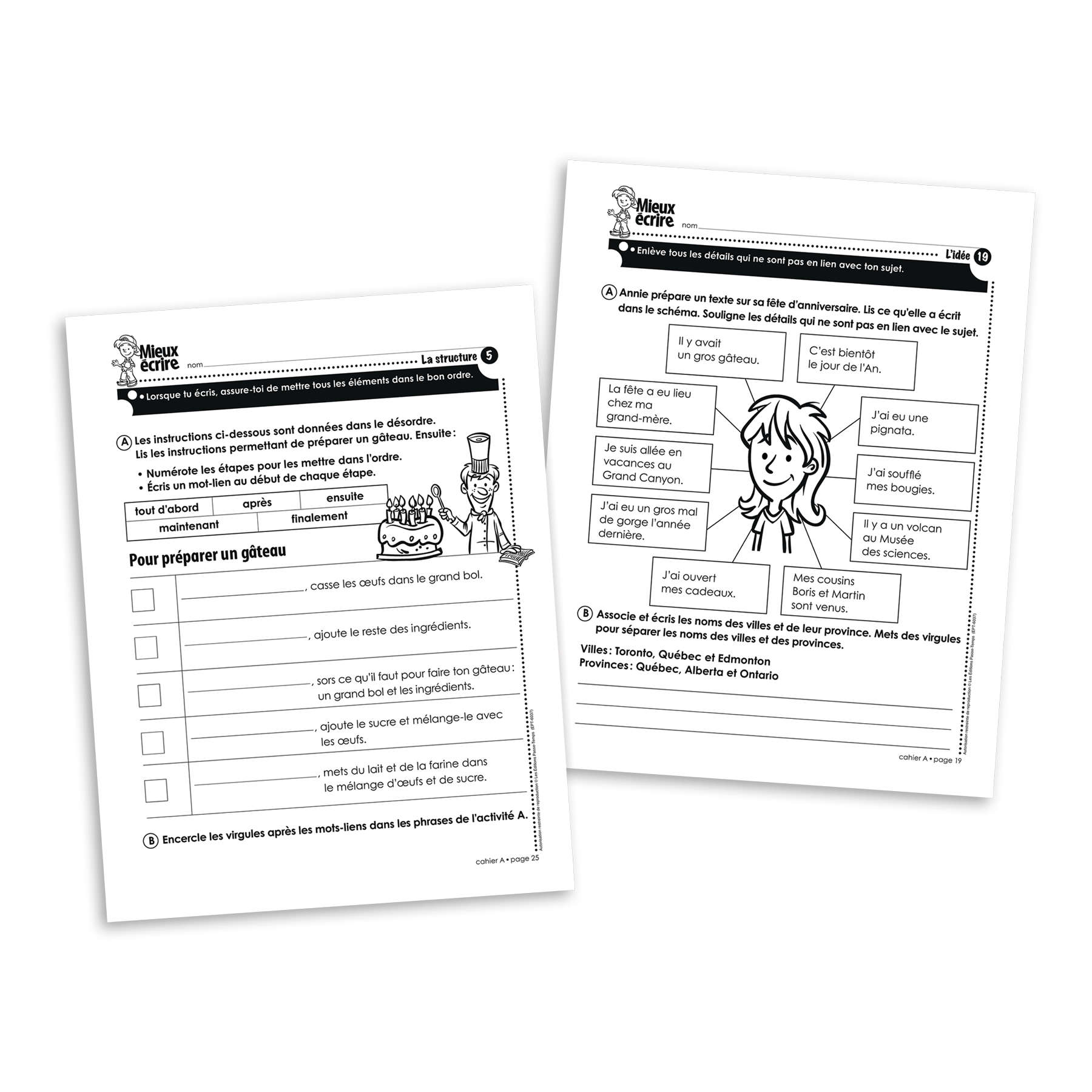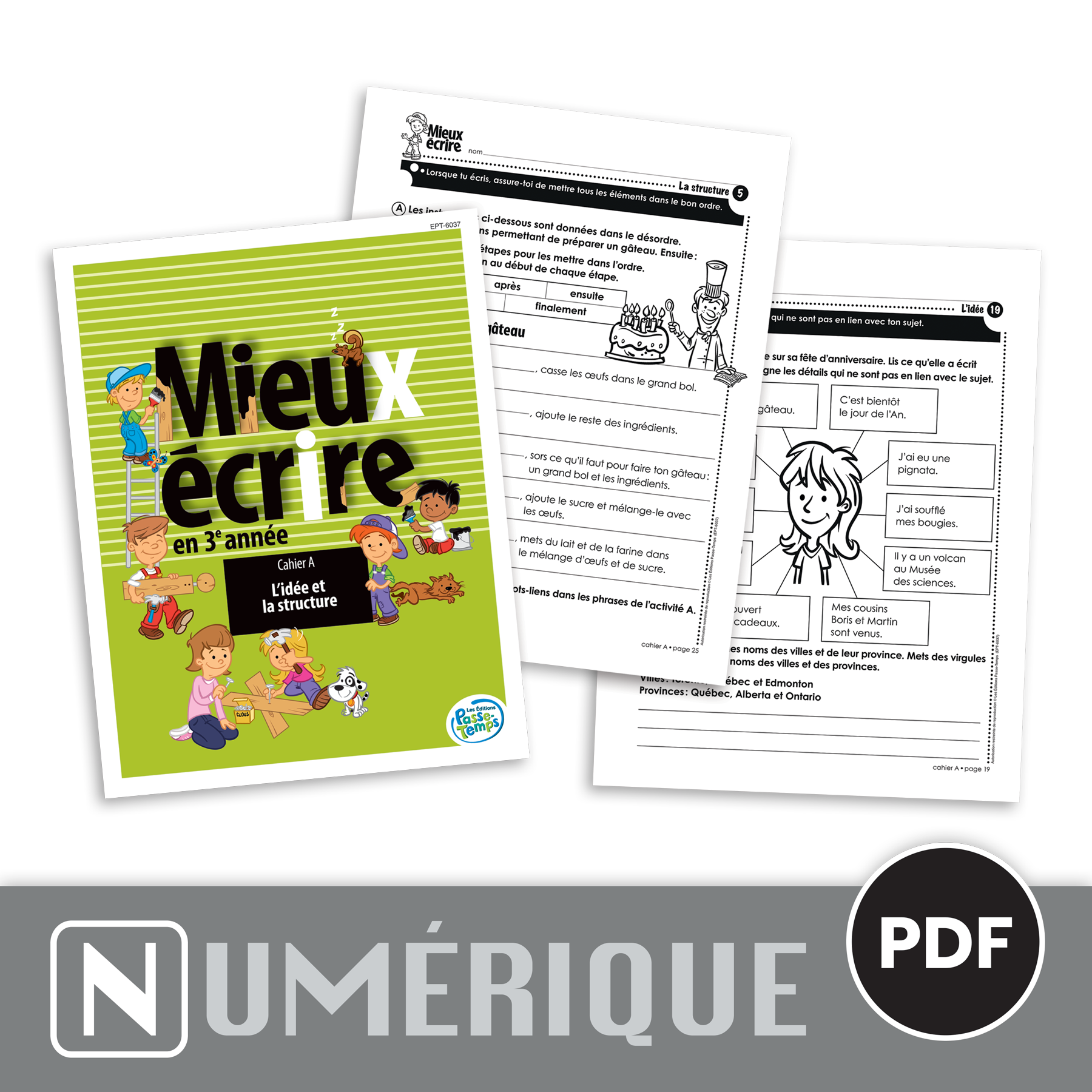 Mieux écrire est une série de cahiers reproductibles pour aider les élèves à devenir plus habiles et autonomes à rédiger différents types de textes. Pour chaque année scolaire, deux cahiers sont offerts (A et B), divisés selon les éléments d’écriture qui y sont abordés. Le cahier A de la série Mieux écrire en 3e année cible l’idée et la structure des textes.
