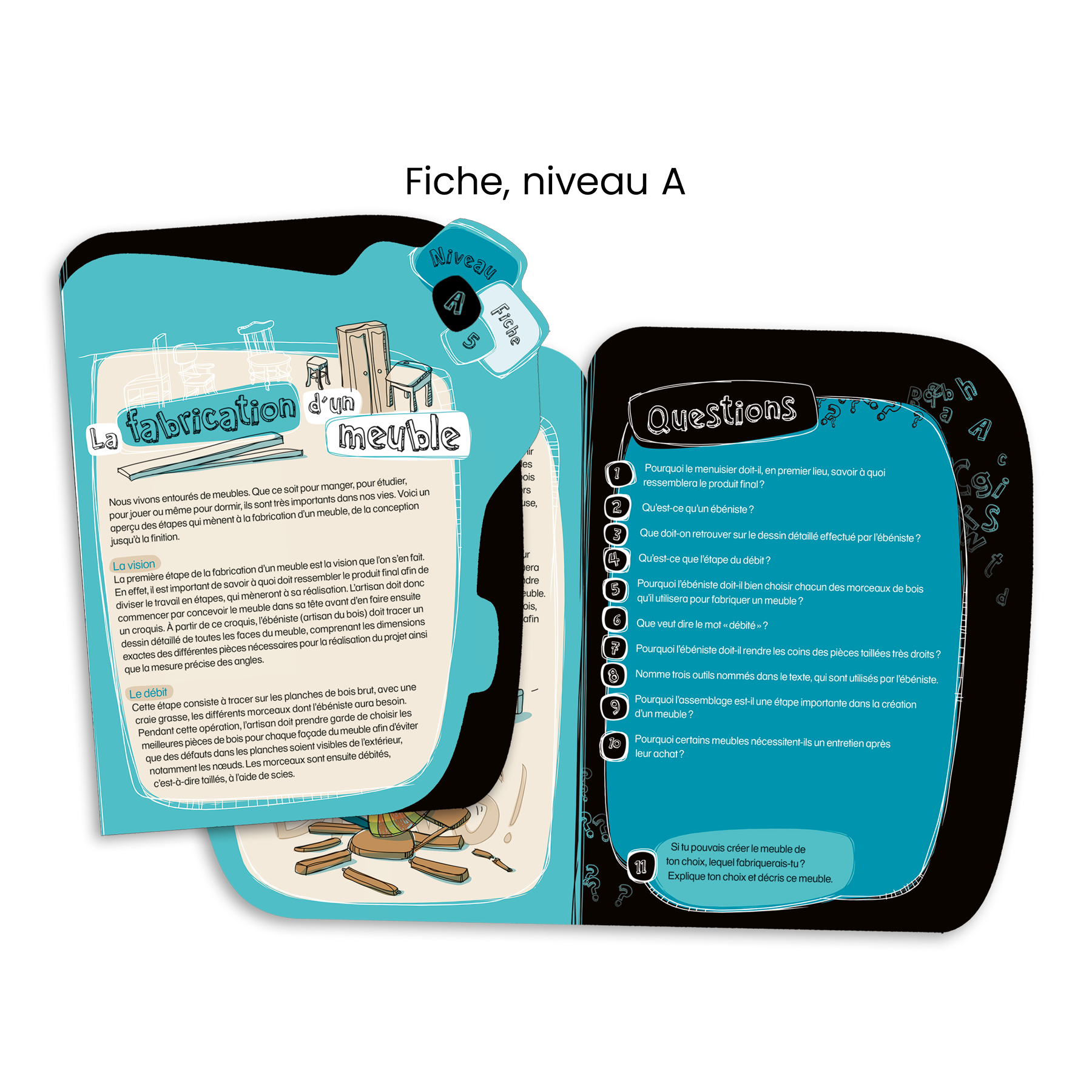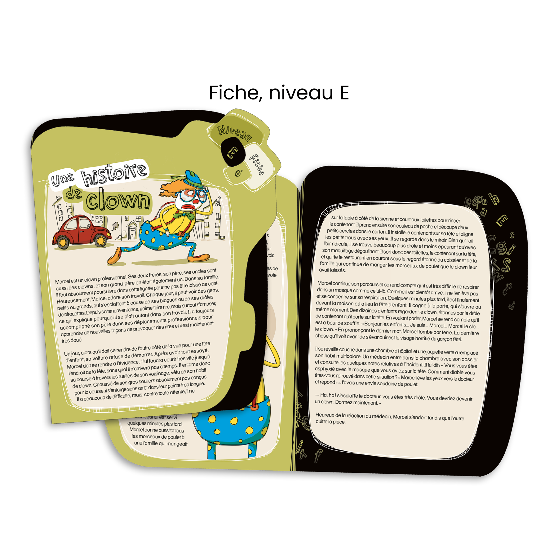 La trousse contient 60 fiches réparties en 10 niveaux dans lesquels la difficulté augmente graduellement de manière à ce que chaque élève puisse progresser à son rythme. Chaque fiche comporte un texte et une série de questions de compréhension s’y rapportant. Au troisième cycle, les élèves doivent répondre à 10 questions de compréhension et d’inférence par texte et une onzième question d’opinion peut aussi être répondue par les élèves. Elle est placée en retrait pour être « optionnelle ». La longueur des textes augmente également à chaque niveau passant de 400 à 1300 mots.