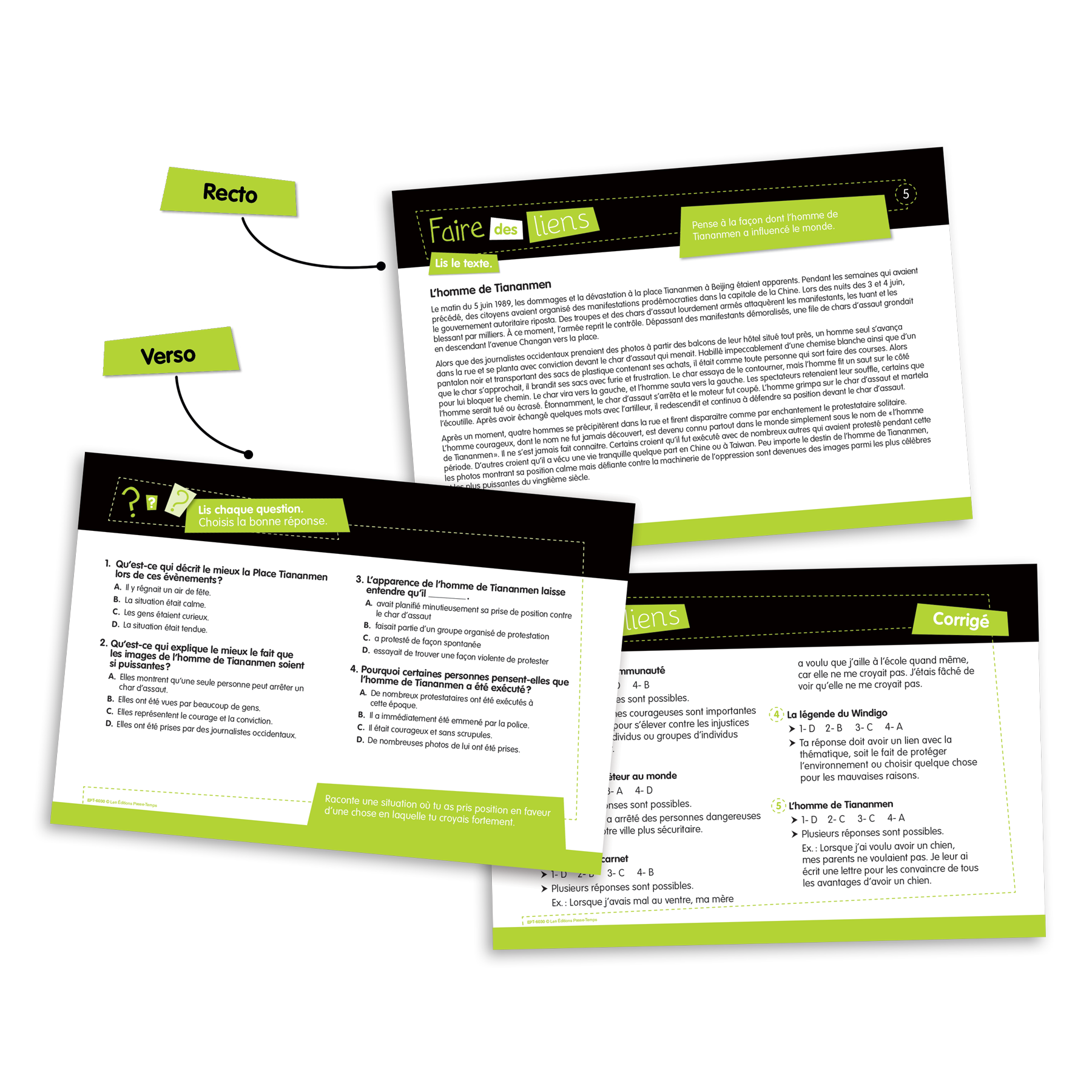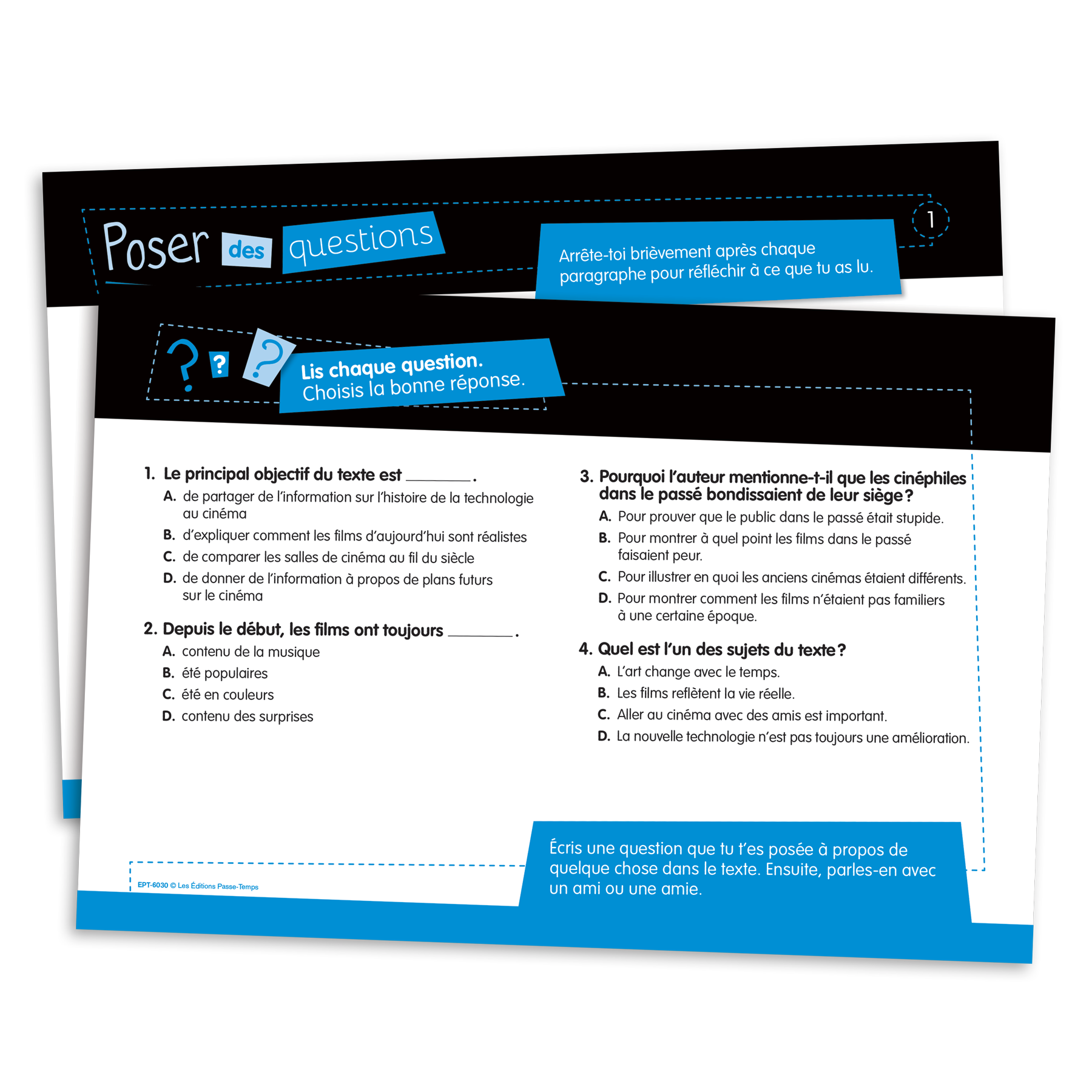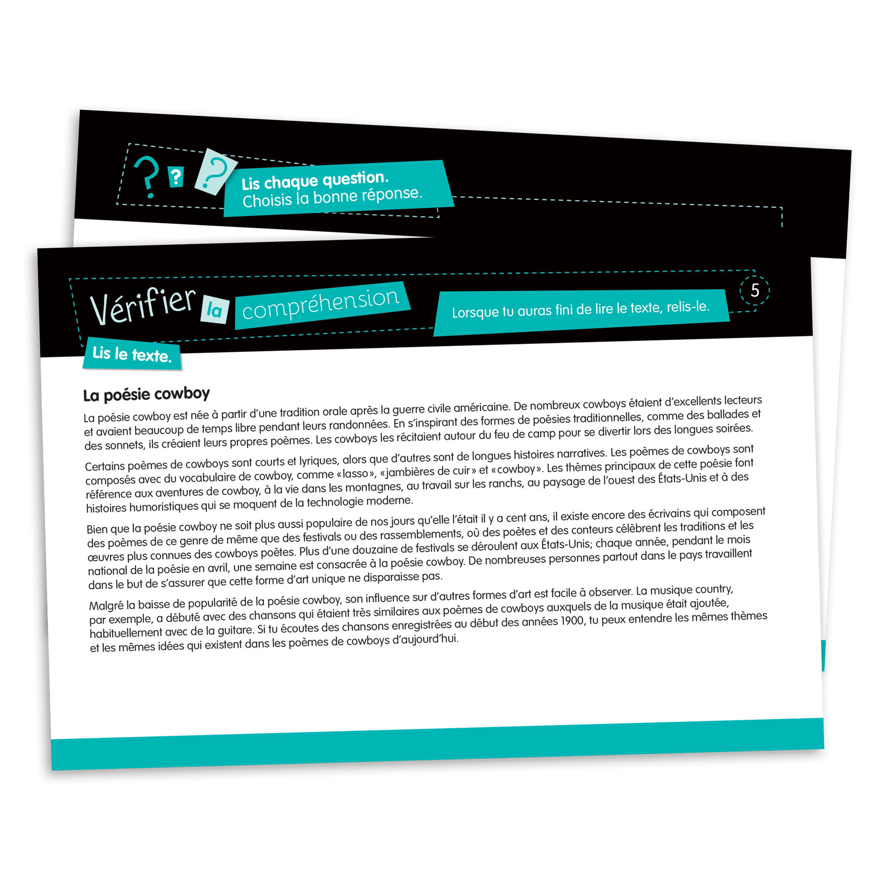 Ensemble de 117 fiches (format 23 cm X 15,5 cm) laminées et imprimées recto verso visant à travailler les habiletés de lecture. Chaque fiche comporte un court texte, 4 questions à choix multiples et une question à développement. Les fiches sont classées selon l'objectif ciblé.