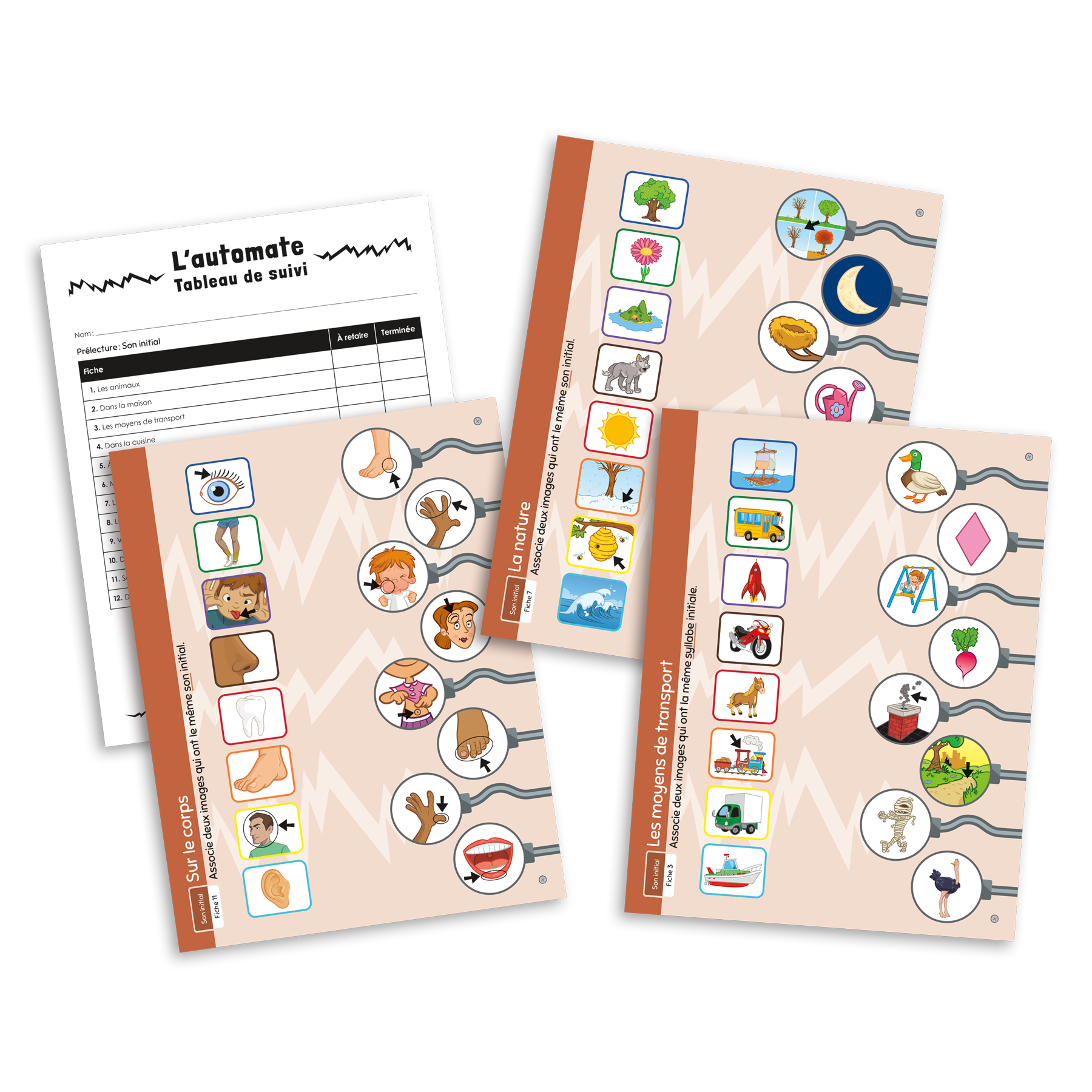 Jeu individuel pour les élèves du préscolaire ciblant le développement de la conscience phonologique et phonémique, et de la connaissance des lettres de l’alphabet. Le joueur doit assembler les fils dans la tête du robot pour programmer ses actions. L'ensemble comprend 3 séries de 12 fiches.