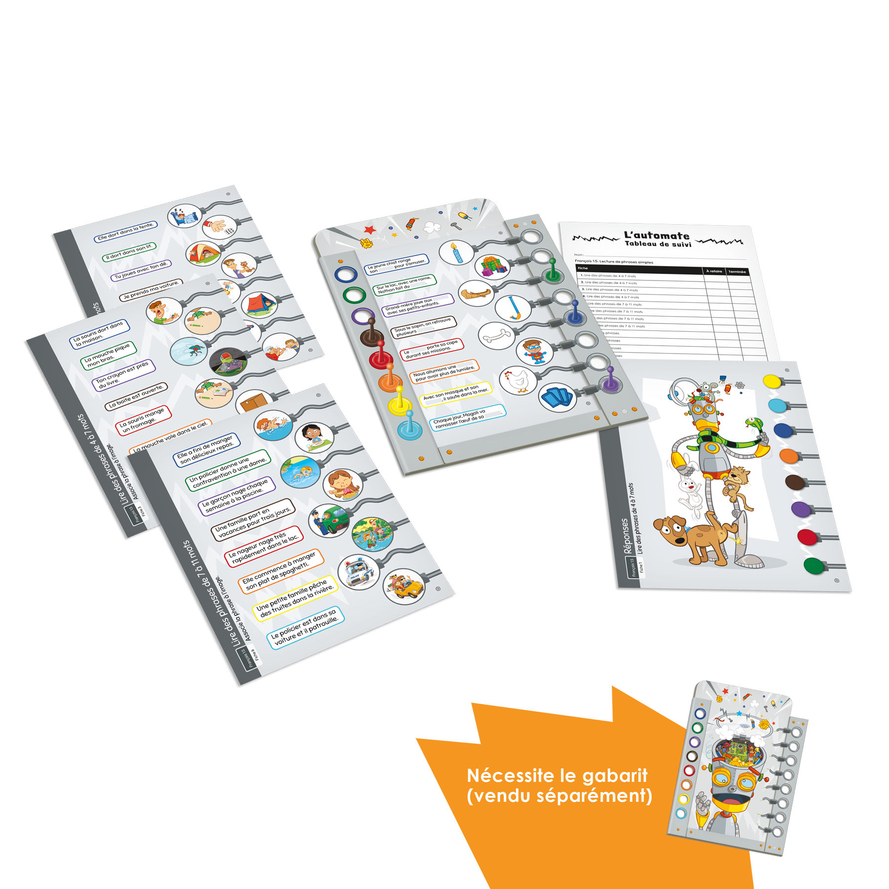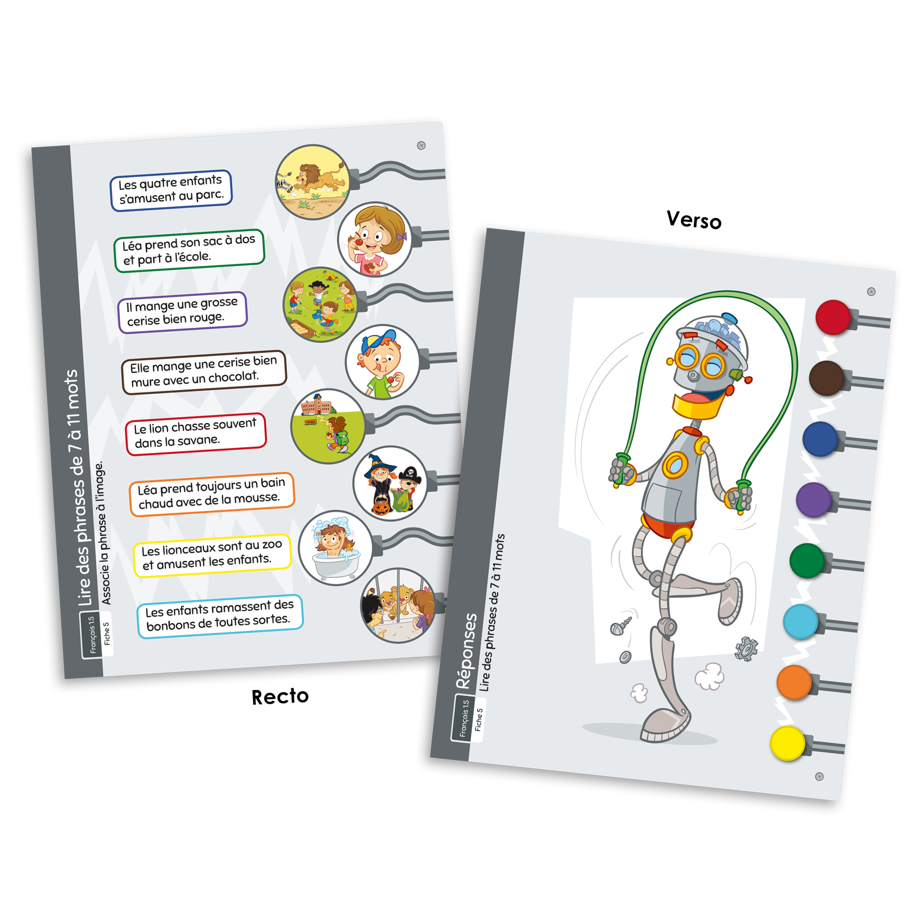 L’ensemble comprend 12 fiches de jeu dans lesquelles le joueur doit lire ou compléter des phrases de 4 à 11 mots et les associer aux images correspondantes. Les réponses de chaque fiche se trouvent au verso de celle-ci, ce qui permet au joueur de se corriger de façon autonome. Un tableau de suivi reproductible permet également à l’intervenant de noter les fiches complétées par chaque joueur.