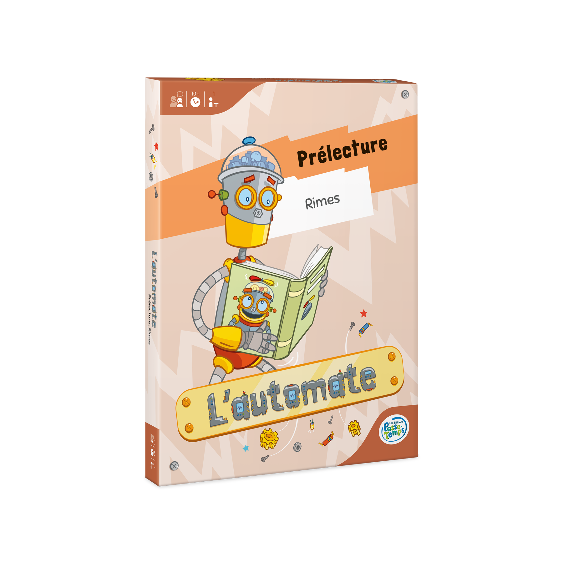Jeu individuel pour les élèves du préscolaire qui cible le développement de la conscience phonologique et phonémique, plus précisément de la conscience de la syllabe finale et du son final des mots. Le joueur doit assembler les fils dans la tête du robot pour programmer ses actions.
