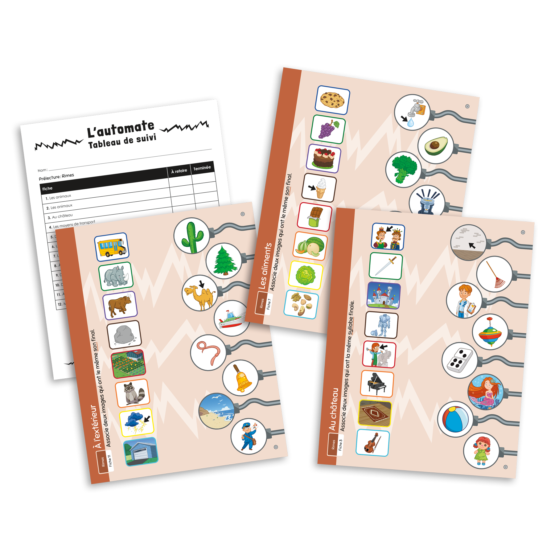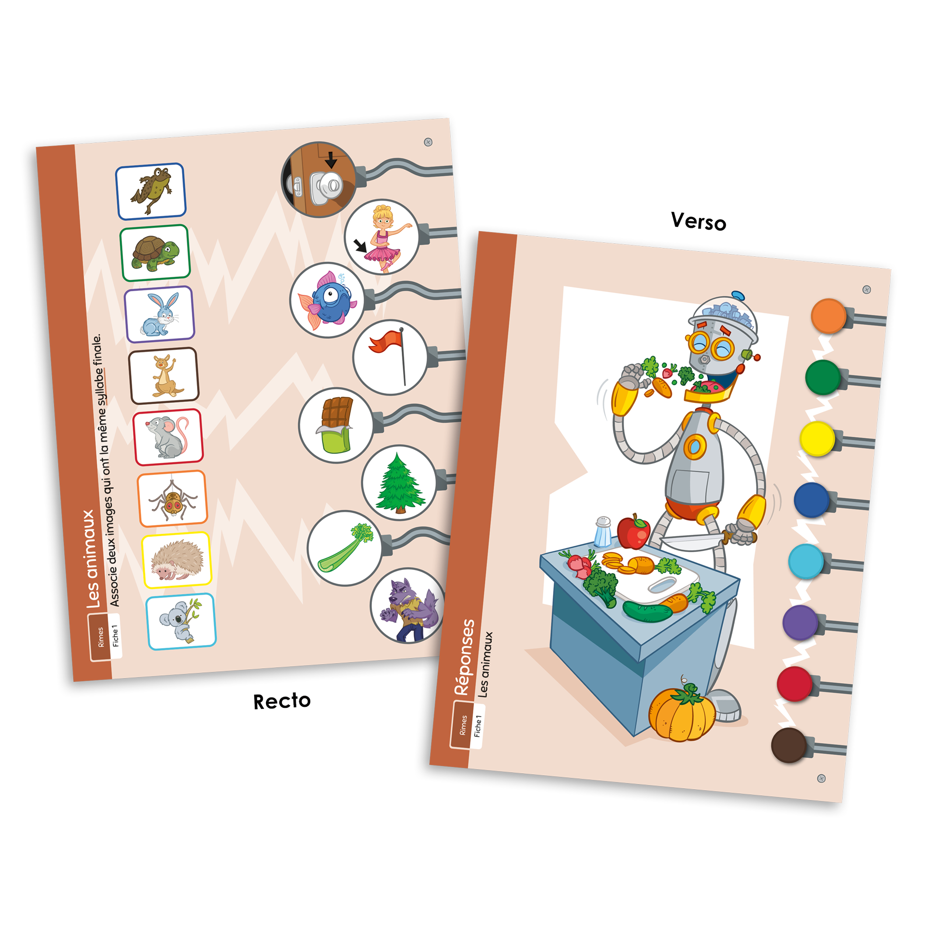 L’ensemble comprend 12 fiches de jeu dans lesquelles le joueur doit associer deux mots illustrés qui ont la même syllabe sonore finale ou le même son final.
