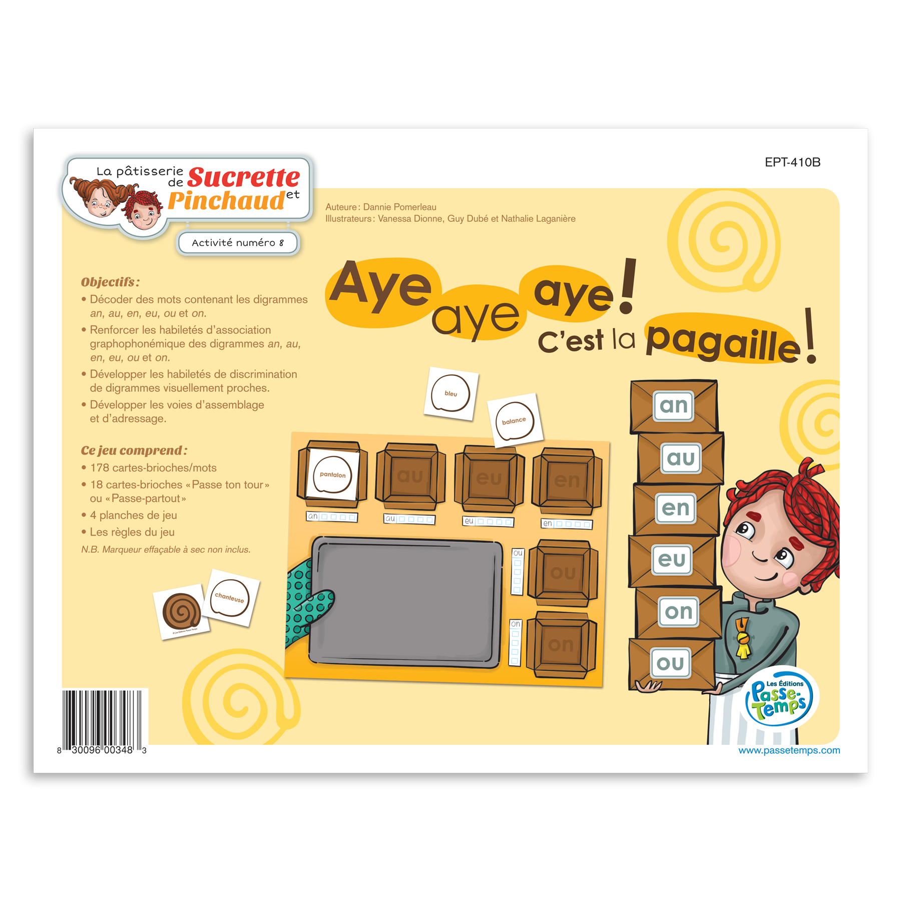Dans Aye, aye, aye! C’est la pagaille!, les élèves rejoignent Sucrette et Pinchaud dans leur cuisine, puisque nos pâtissiers ont mélangé toutes les pâtisseries qu’ils avaient cuisinées la veille. Chaque élève reçoit une planche où se trouvent 4 boites à pâtisseries chacune identifiée d’une lettre ou d’un graphème. Les cartes pâtisserie à classer présentent des mots contenant des graphèmes visuellement proches ou des images dont le nom contient ces graphèmes. Les élèves doivent piger une carte pâtisserie, la décoder et la placer dans la boite correspondante. Qui sera le premier à remplir ses boites?