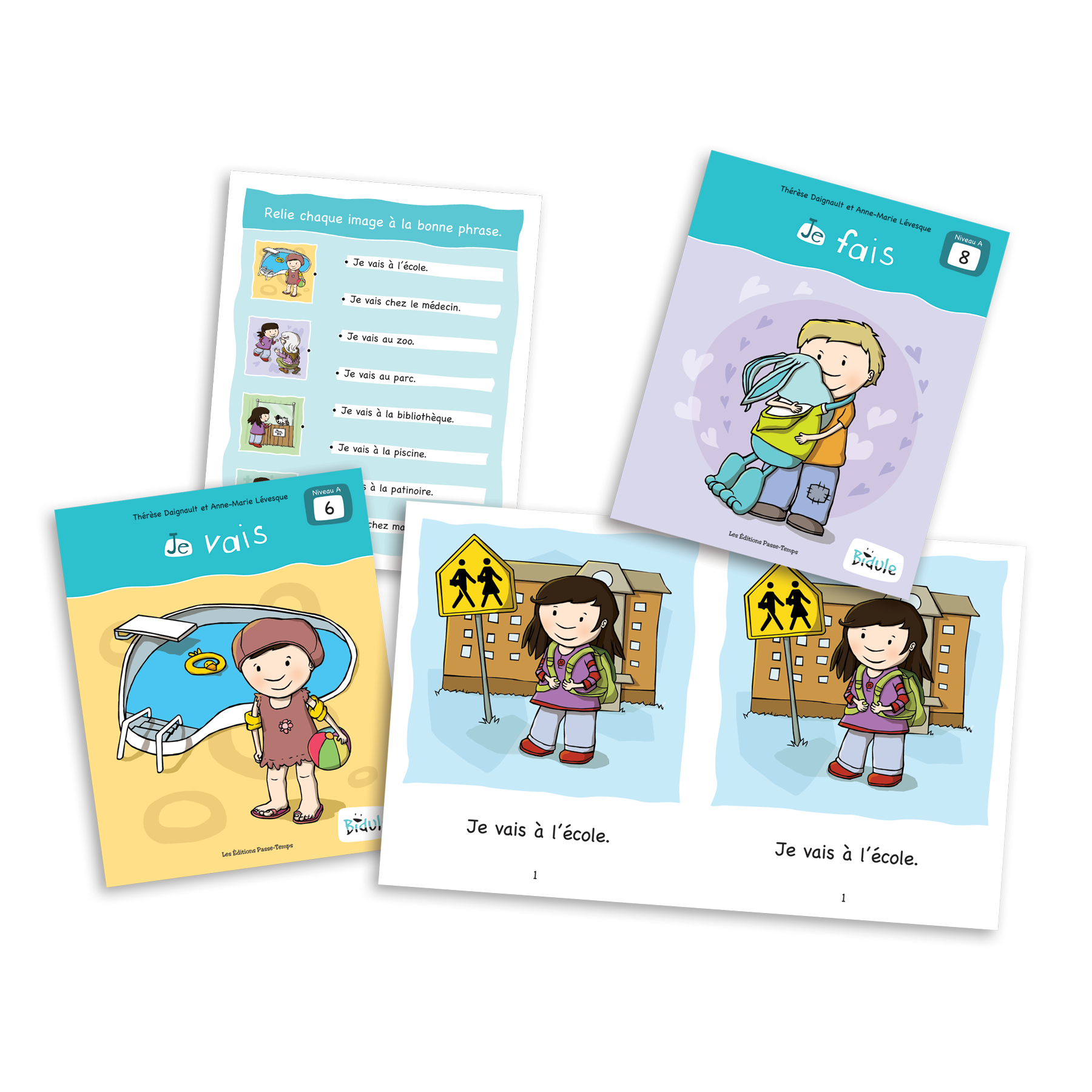Cinq livrets, entièrement plastifiés, dans lesquels seul le pronom «je» est utilisé comme sujet. Ainsi, dans un même livre, le début de chaque phrase sera toujours le même (ex.: Je fais de la bicyclette. Je fais un câlin. Je fais du ski.).