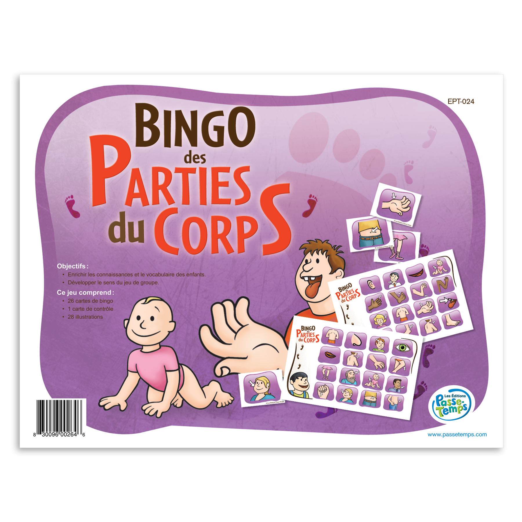 Jeu de bingo éducatif pour un groupe de 26 enfants. Ce bingo comporte 28 images différentes sur le thème des parties du corps.