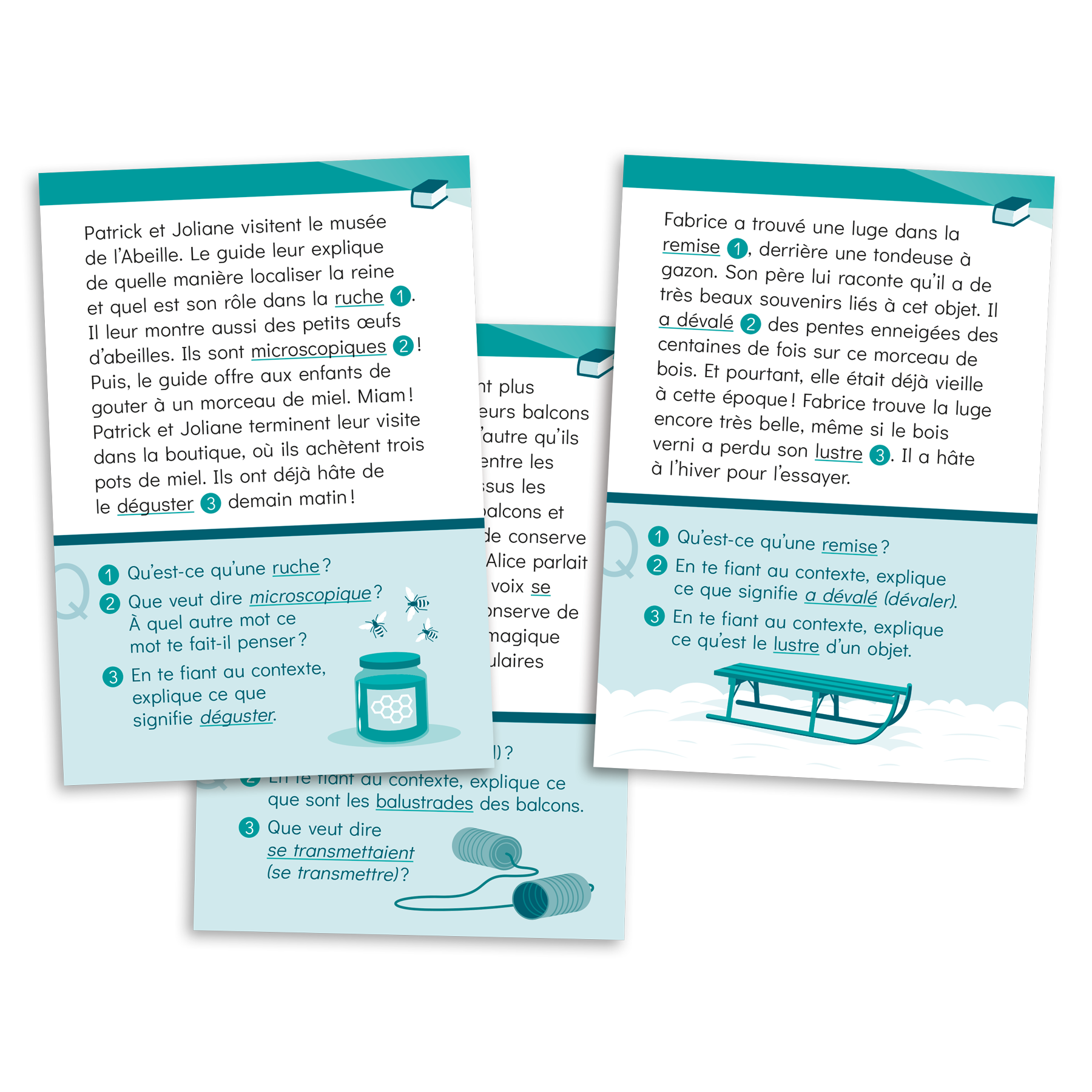 Les textes peuvent faire l’objet d’une lecture individuelle ou interactive avec l’intervenant. L’élève peut répondre aux questions oralement ou par écrit. Les réponses se trouvent au verso de chaque carte-texte.