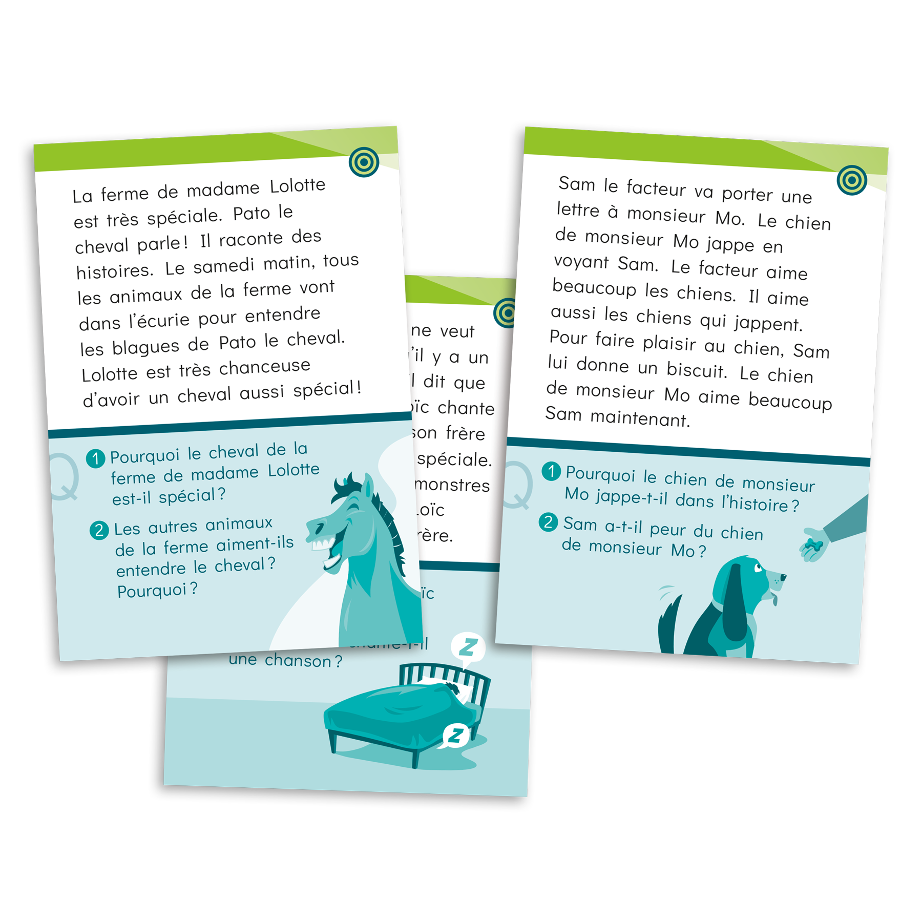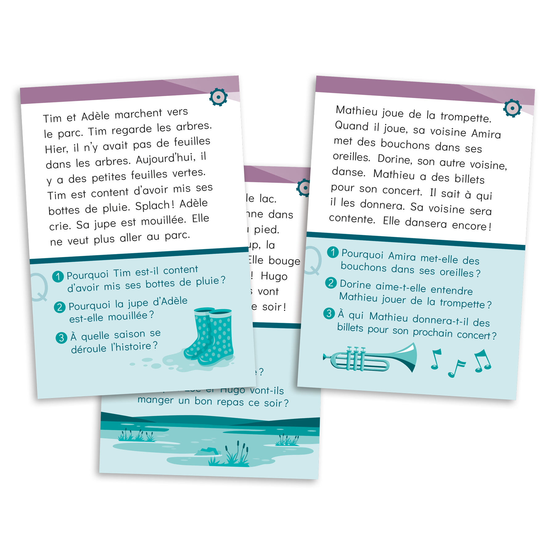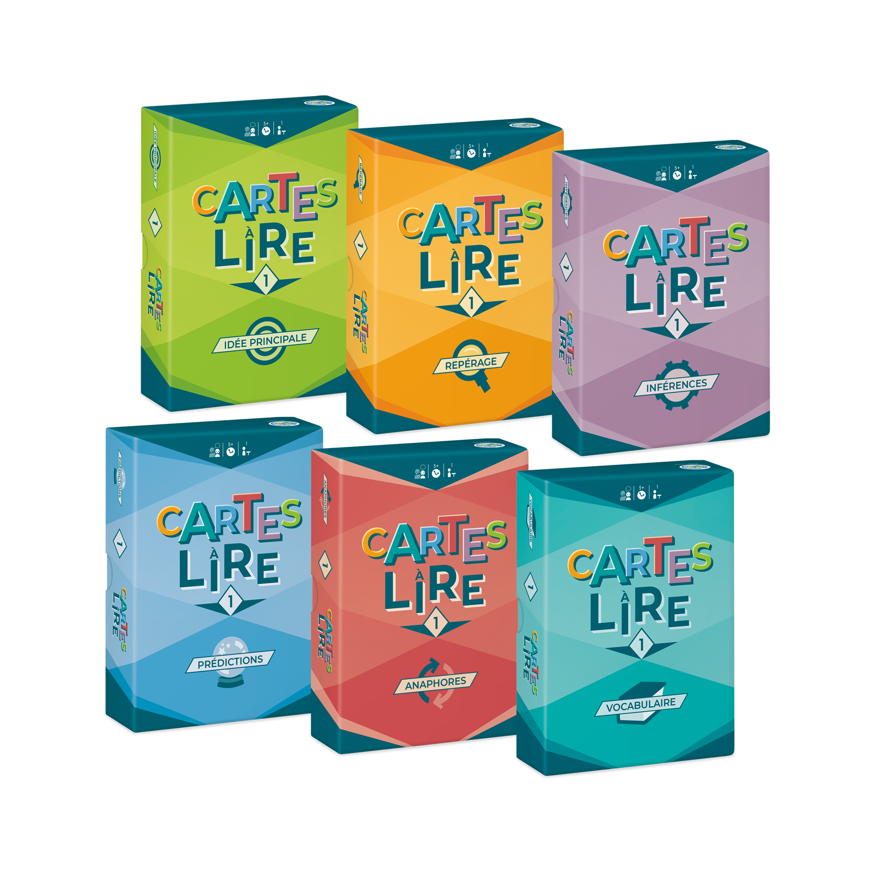 Ensemble de six paquets Cartes à lire - 1re année proposant des textes présentés sous forme de cartes de lecture. Chaque paquet cible une habileté ou une stratégie de lecture spécifique par l’entremise de 48 courts textes ludiques accompagnés de questions de compréhension. Les textes peuvent faire l’objet d’une lecture individuelle ou interactive avec l’intervenant. L’élève peut répondre aux questions oralement ou par écrit. Les réponses se trouvent au verso de chaque carte-texte.