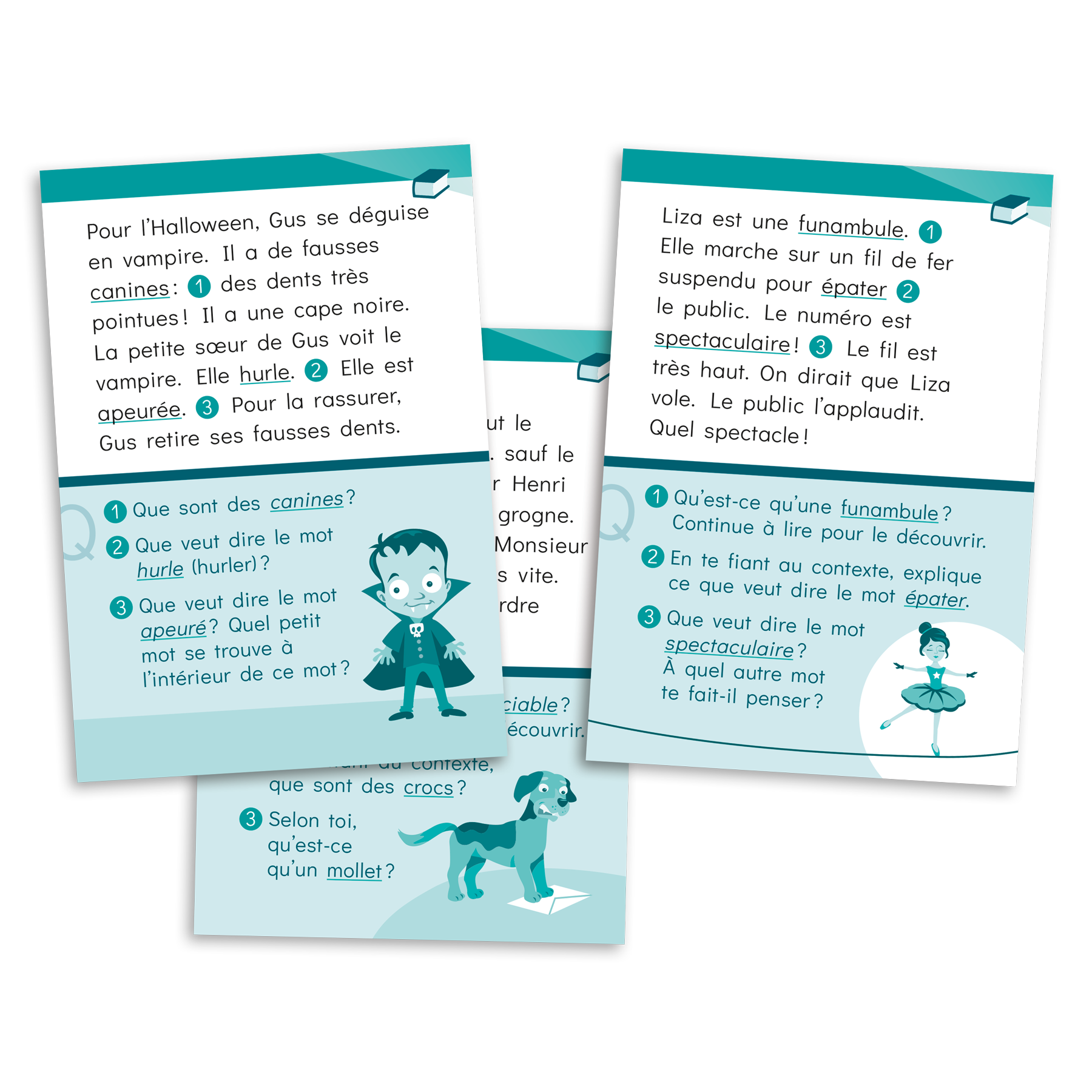 Les textes incluent une forte proportion de mots tirés de la liste orthographique du MELS. Dans les paquets Prédictions, Anaphores et Vocabulaire, des questions sont posées en cours de lecture afin de valider la compréhension et les stratégies du lecteur à des endroits ciblés du texte.