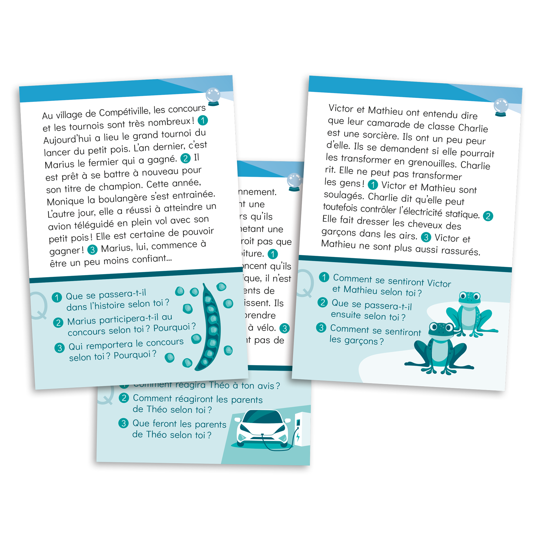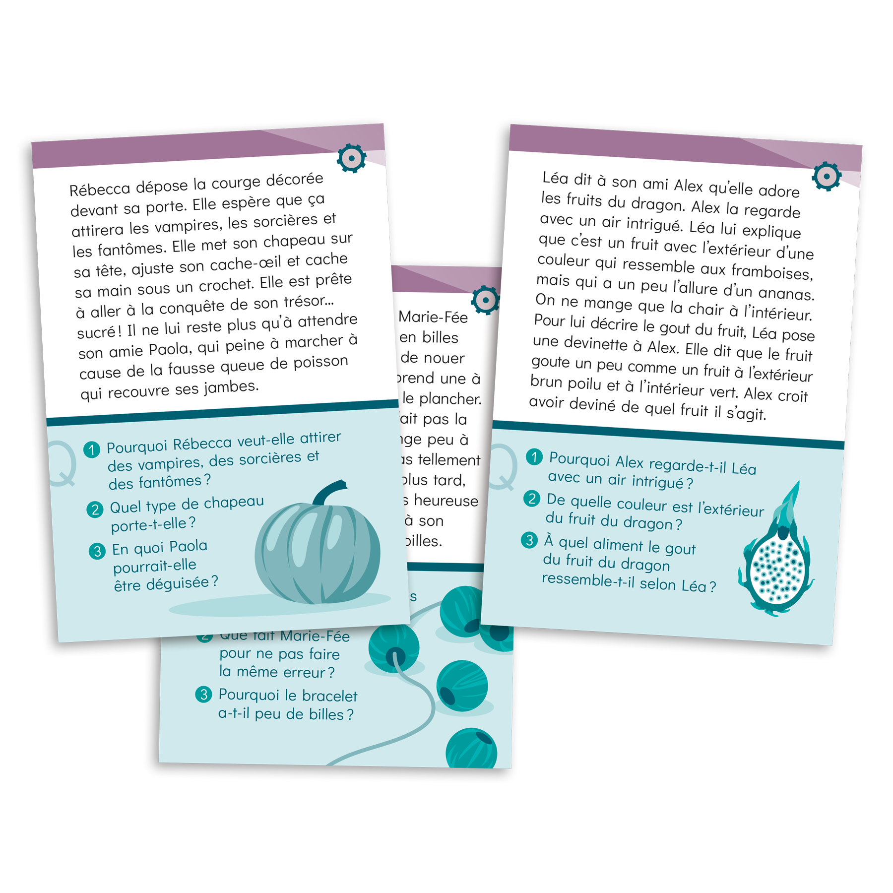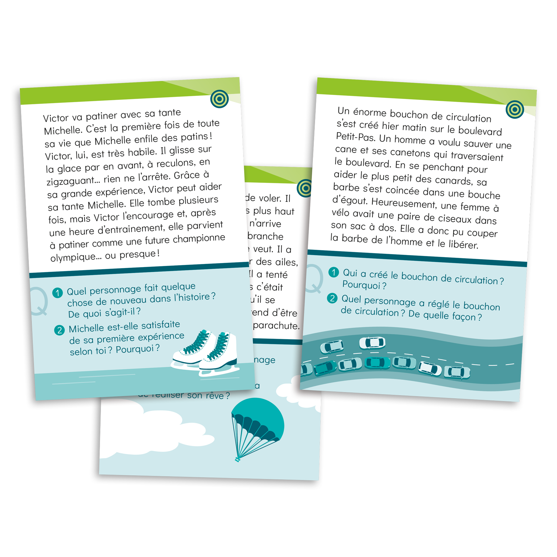 Ensemble de six paquets Cartes à lire - 3e année proposant des textes présentés sous forme de cartes de lecture. Chaque paquet cible une habileté ou une stratégie de lecture spécifique par l’entremise de 48 courts textes ludiques accompagnés de questions de compréhension. Les textes peuvent faire l’objet d’une lecture individuelle ou interactive avec l’intervenant. L’élève peut répondre aux questions oralement ou par écrit. Les réponses se trouvent au verso de chaque carte-texte.