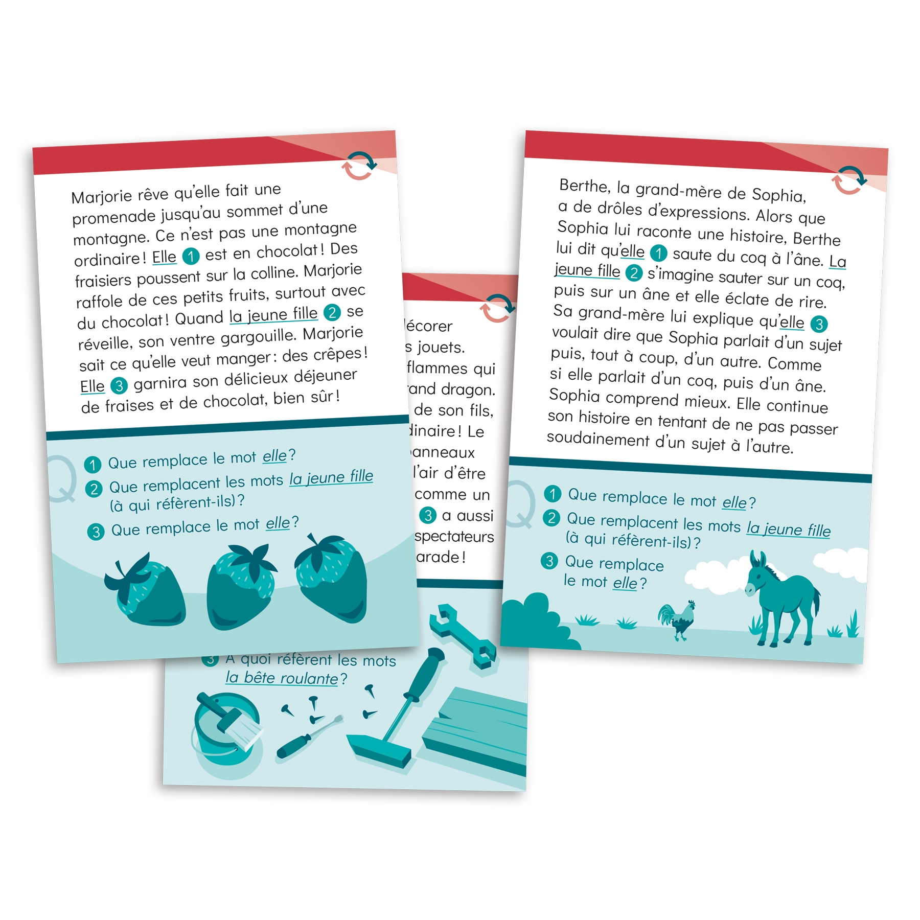 Les textes incluent une forte proportion de mots tirés de la liste orthographique du MELS. Dans les paquets Prédictions, Anaphores et Vocabulaire, des questions sont posées en cours de lecture afin de valider la compréhension et les stratégies du lecteur à des endroits ciblés du texte.