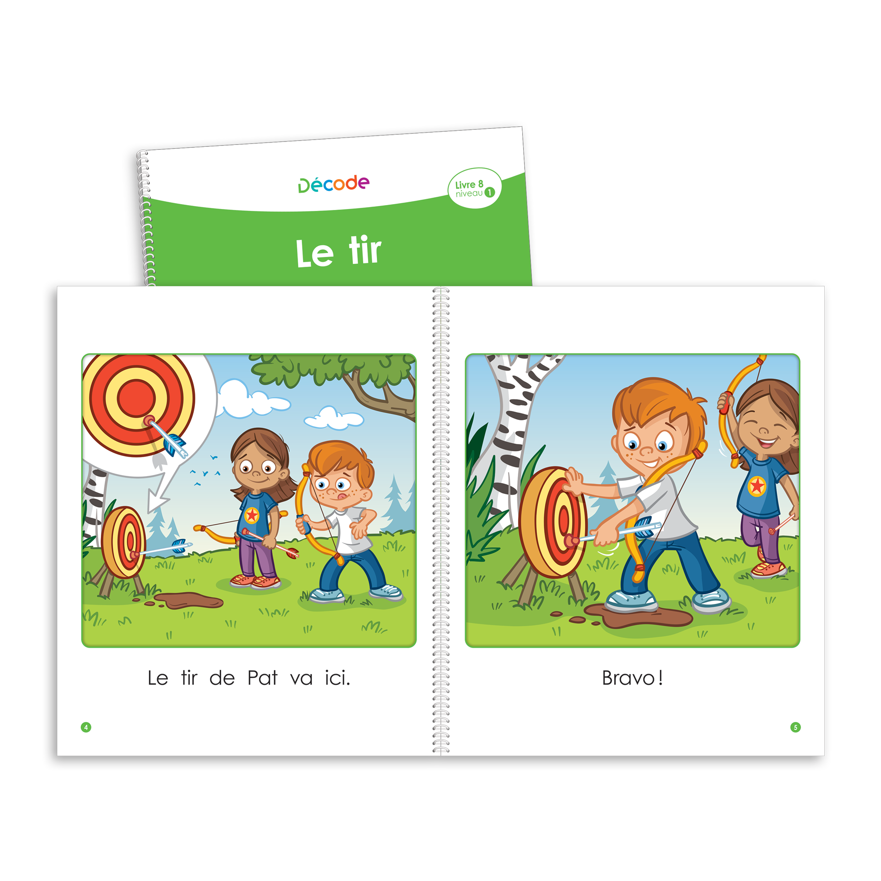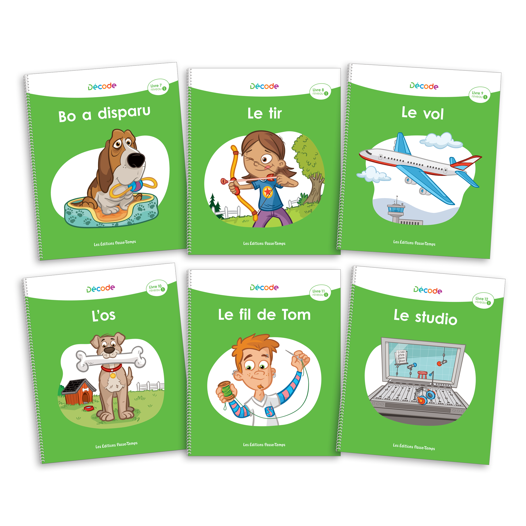 Décode est une collection de livres gradués spécialement conçue pour accompagner pas à pas le lecteur dans son apprentissage du décodage. Elle propose 6 niveaux de 12 livres qui incluent de façon progressive les correspondances graphèmes-phonèmes et les particularités de la langue française. Les 72 livres gradués permettent ainsi aux lecteurs débutants de réinvestir petit à petit leurs apprentissages dans un contexte de lecture authentique et amusant qui correspond à leur niveau d’habileté. La série 1 Introduction comprend les livres 1 à 6 alors que la série 2 Consolidation inclut les livres 7 à 12 de chacun des niveaux.