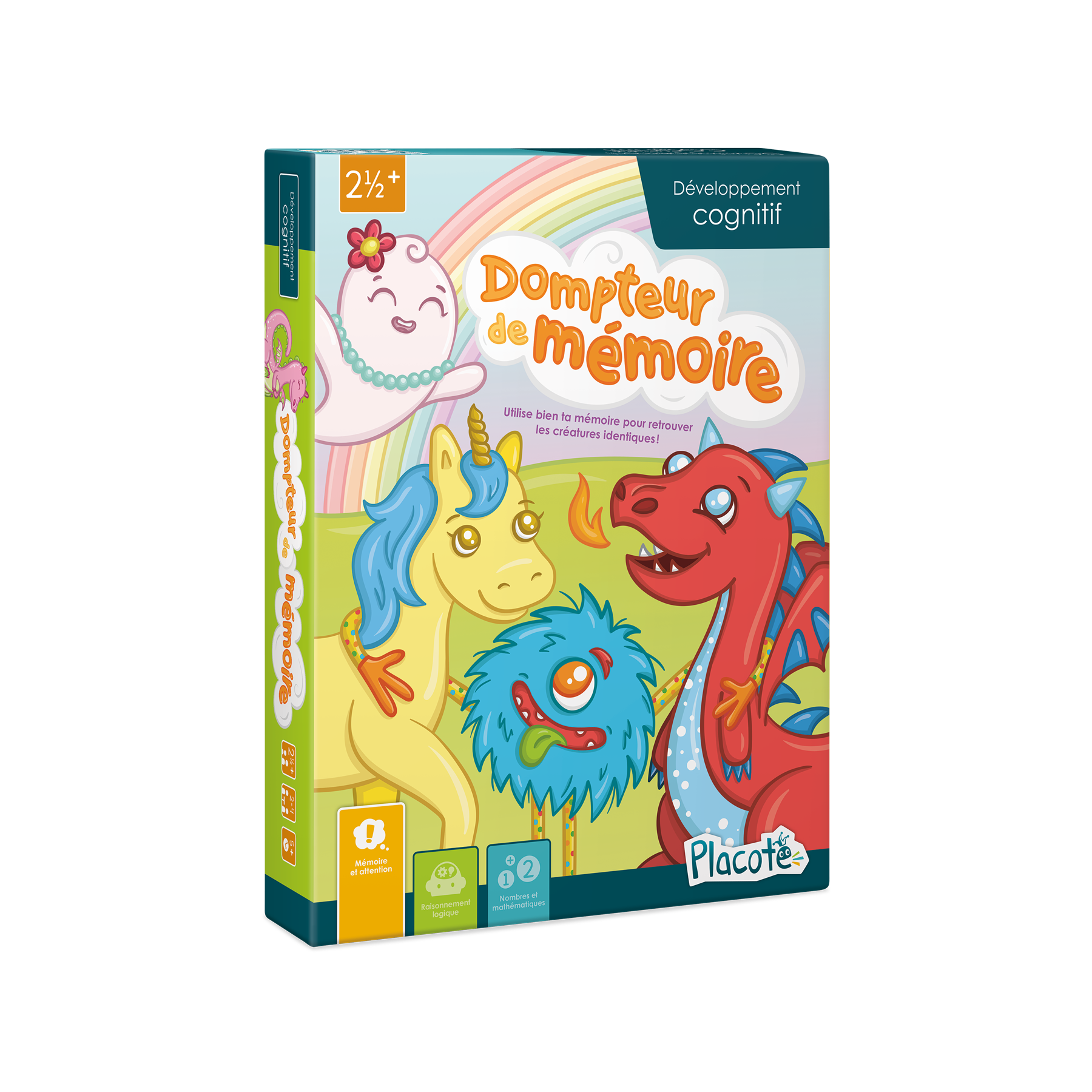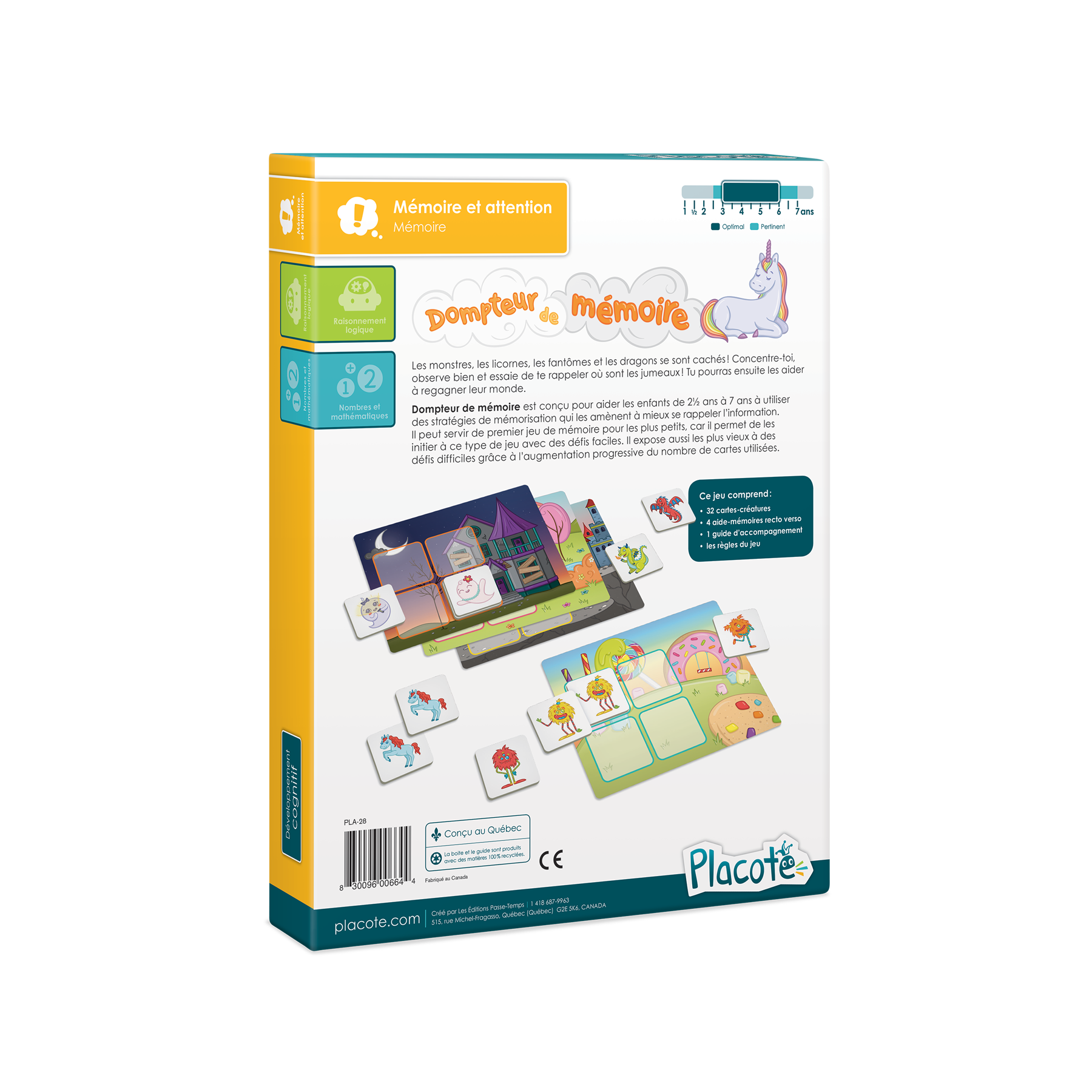 Dompteur de mémoire est conçu pour aider les enfants de 2½ ans à 7 ans à utiliser des stratégies de mémorisation qui les amènent à mieux se rappeler l’information. Il peut servir de premier jeu de mémoire pour les plus petits, car il permet de les initier à ce type de jeu avec des défis faciles. Il expose aussi les plus vieux à des défis difficiles grâce à l’augmentation progressive du nombre de cartes utilisées.